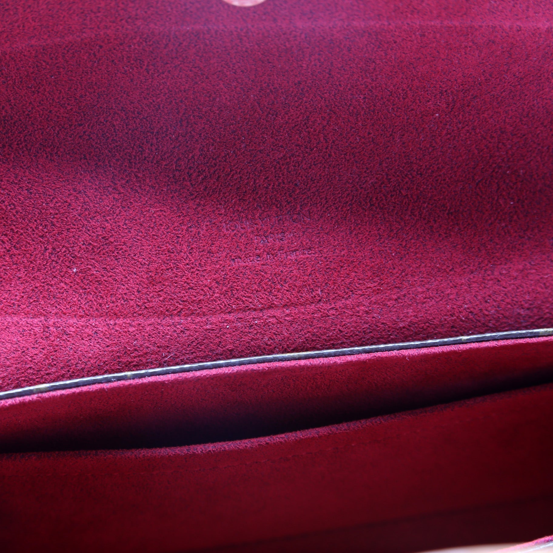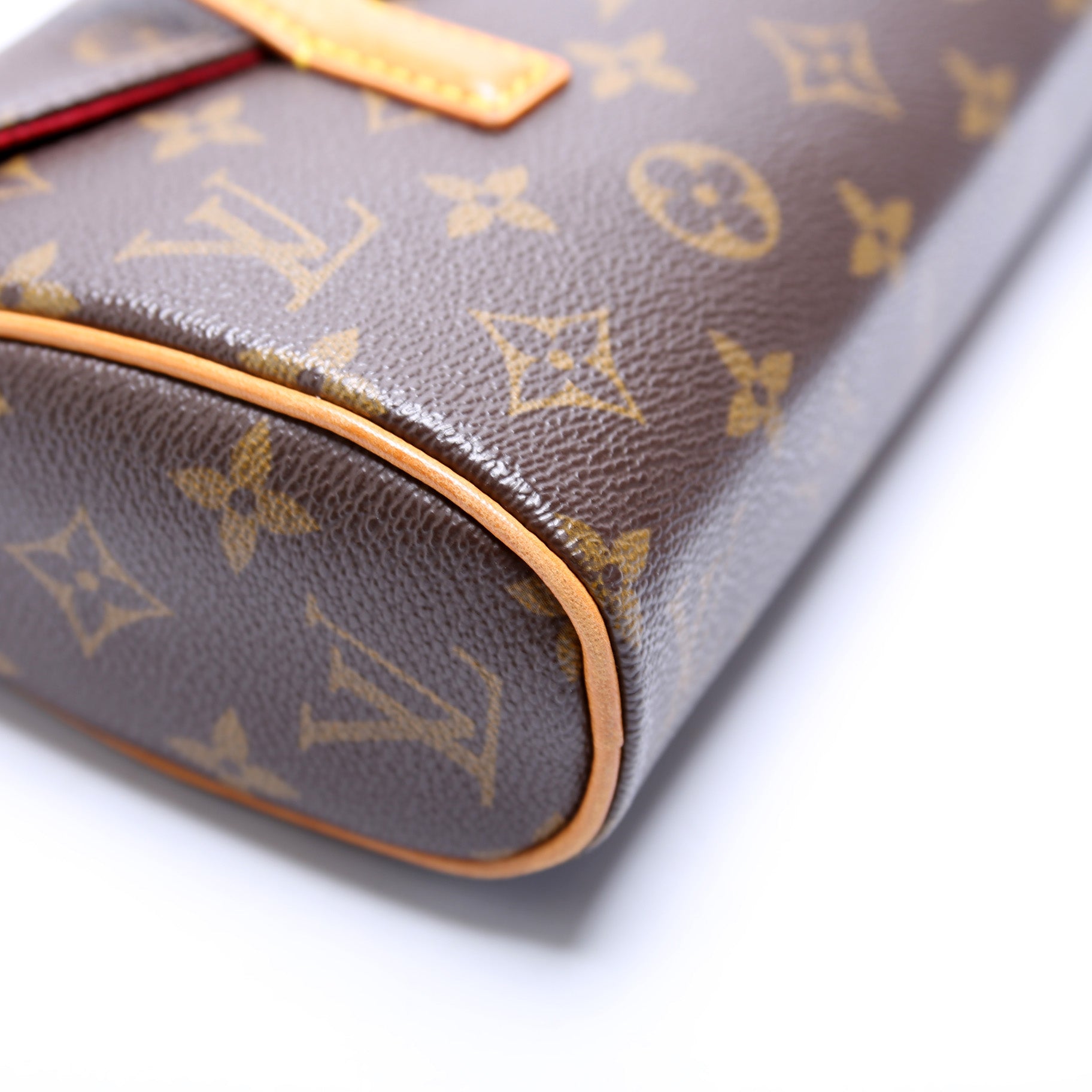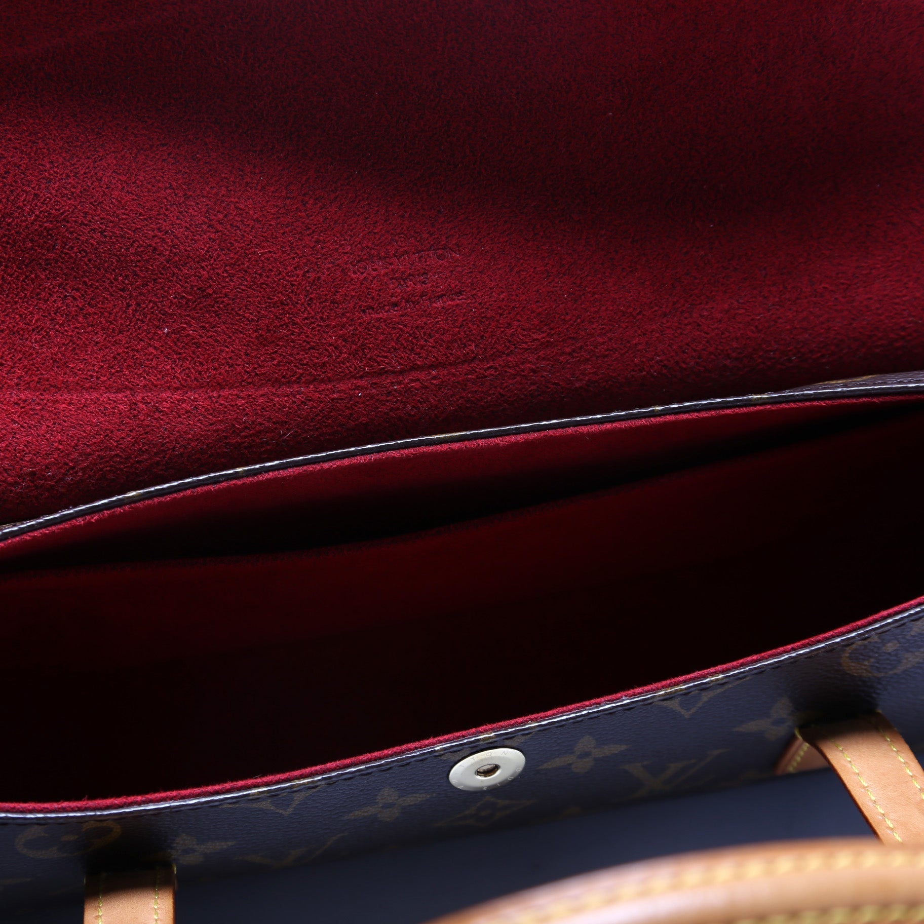 Exterior: The exterior coated canvas is free from wear. The leather trim shows minor discoloration.