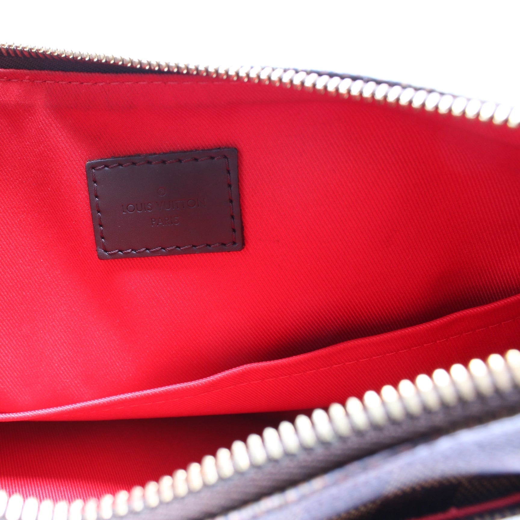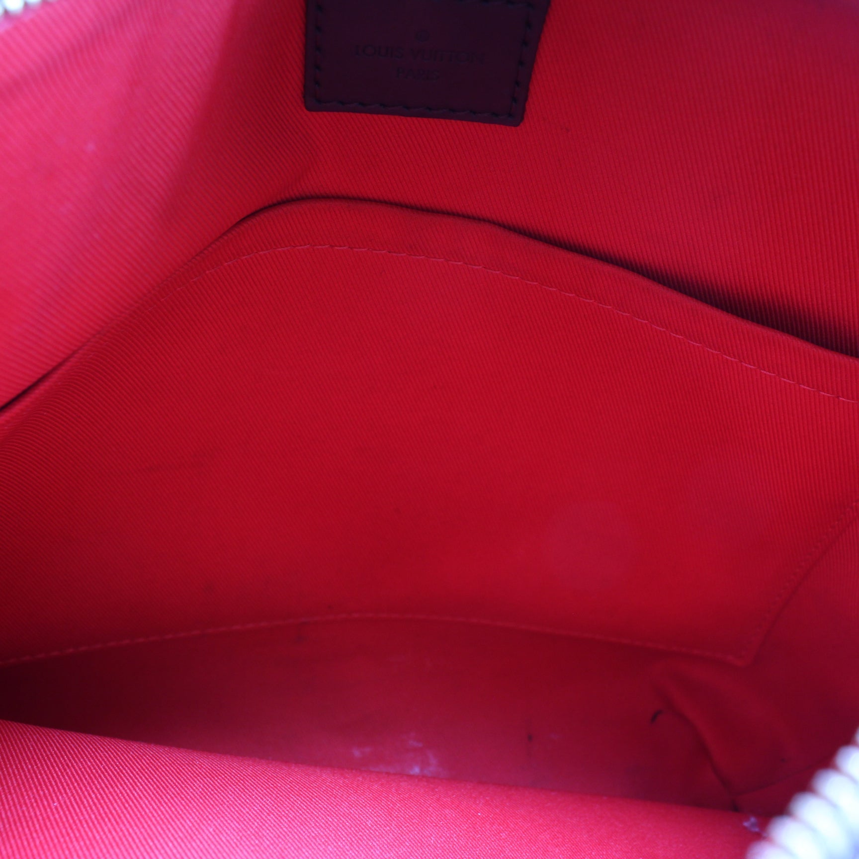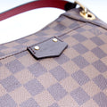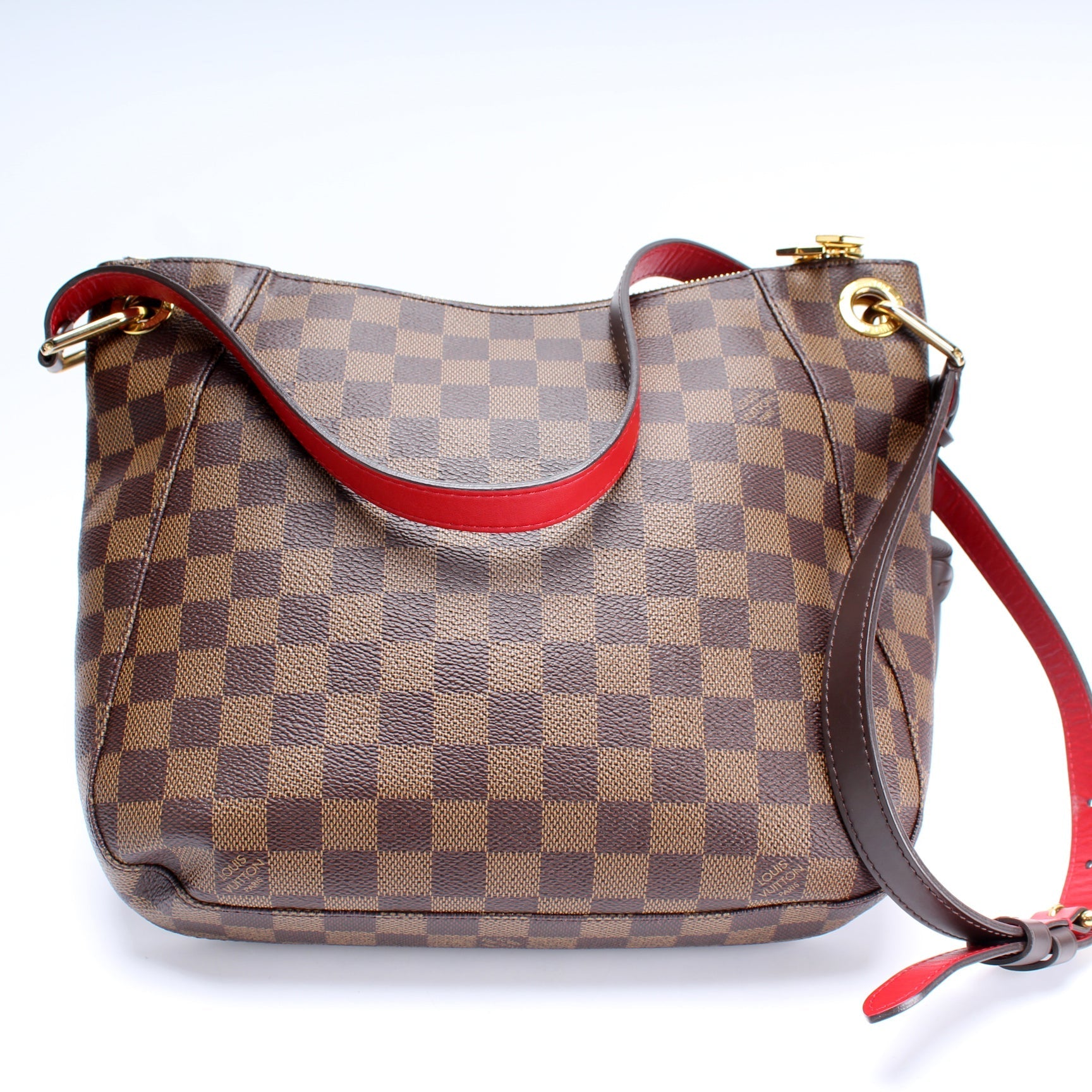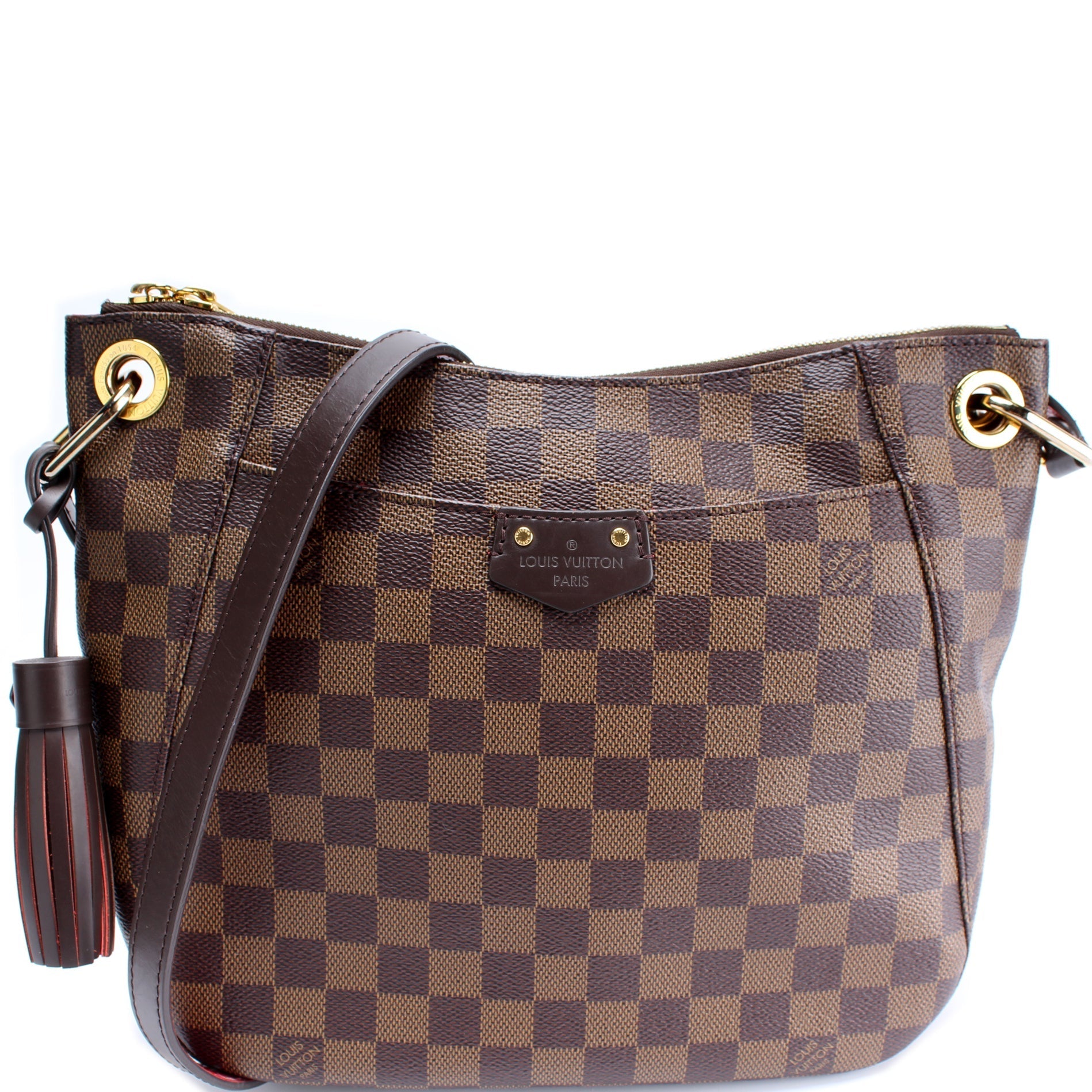This Louis Vuitton South Bank Besaceis eye catching bag. The exterior is in the classic Louis Vuitton Damier Ebene coated canvas.