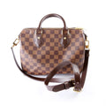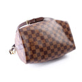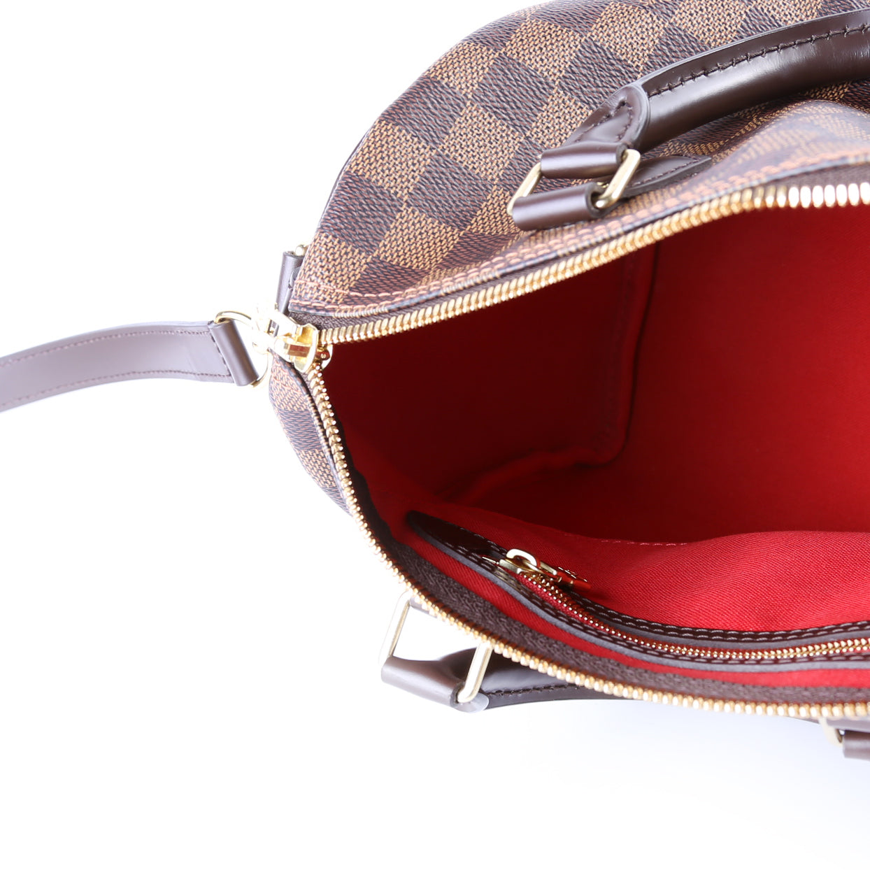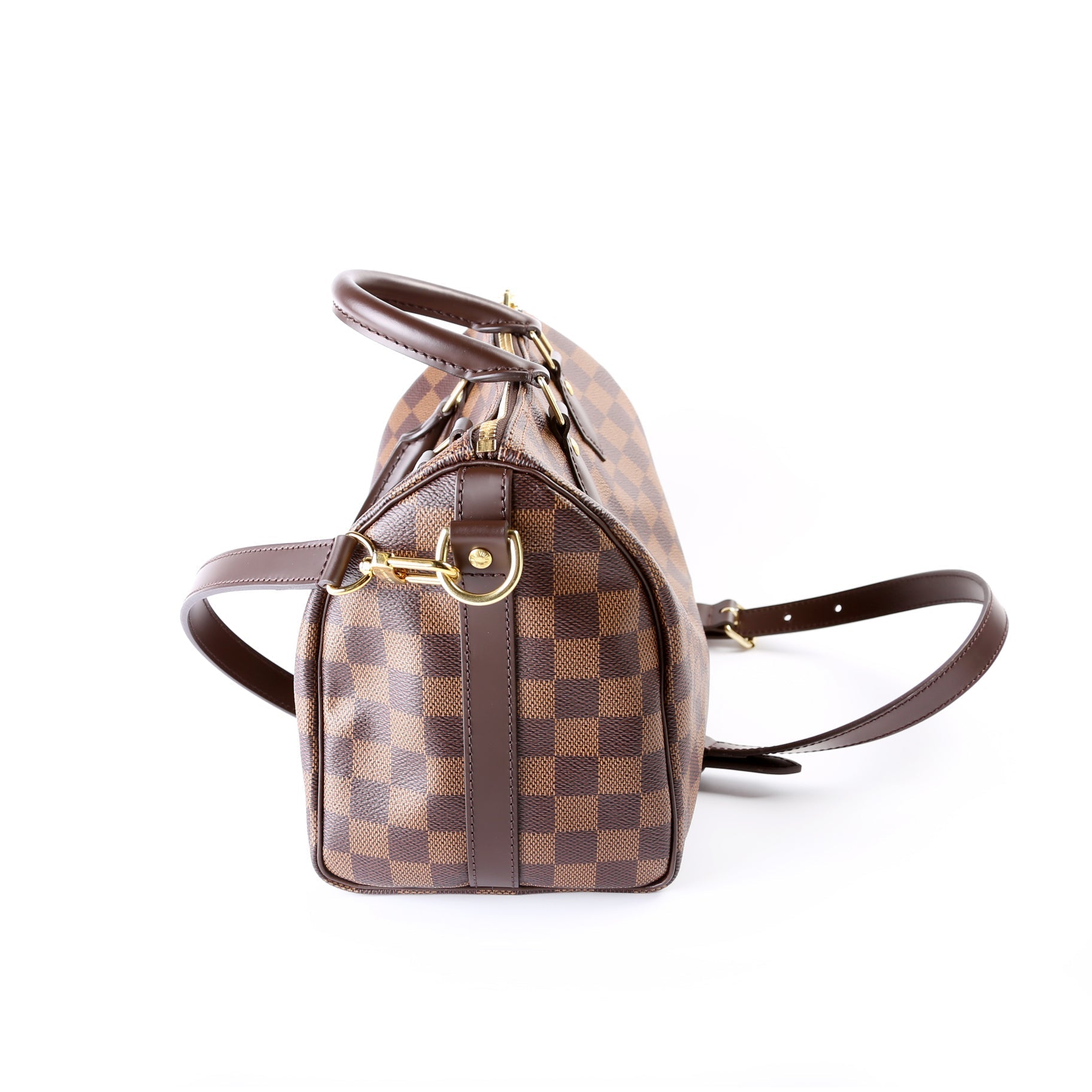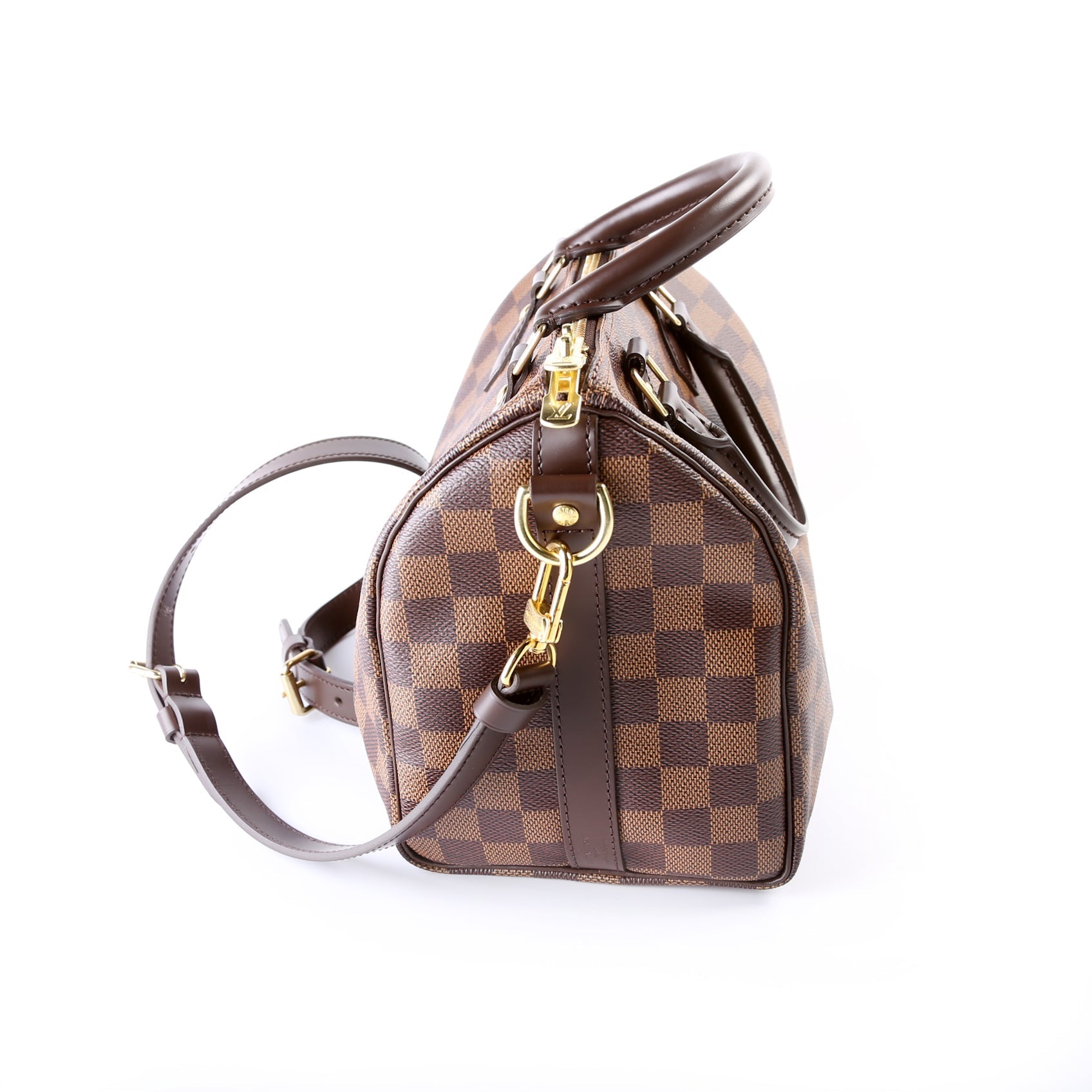 This Louis Vuitton Speedy 25is eye catching bag. The exterior is in the classic Louis Vuitton Damier Ebene coated canvas.