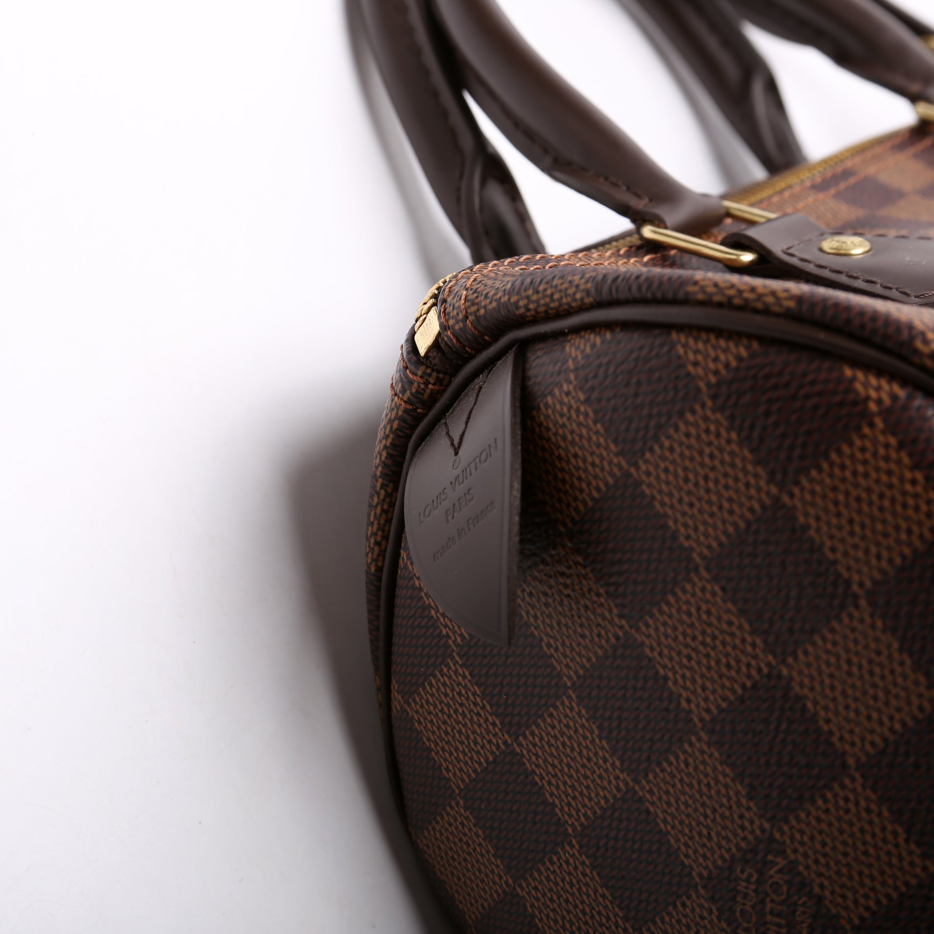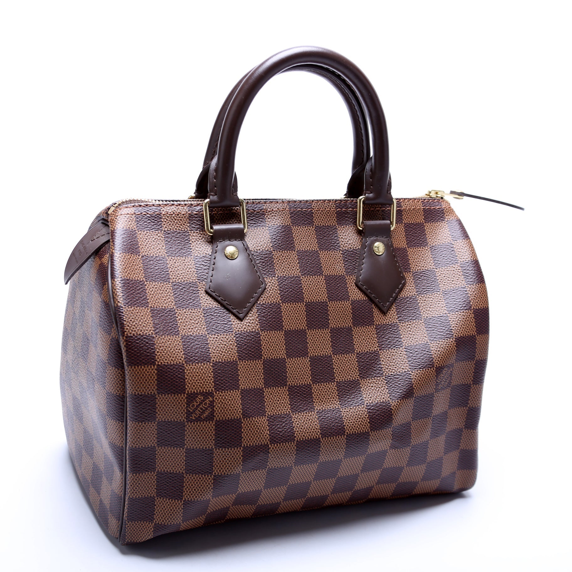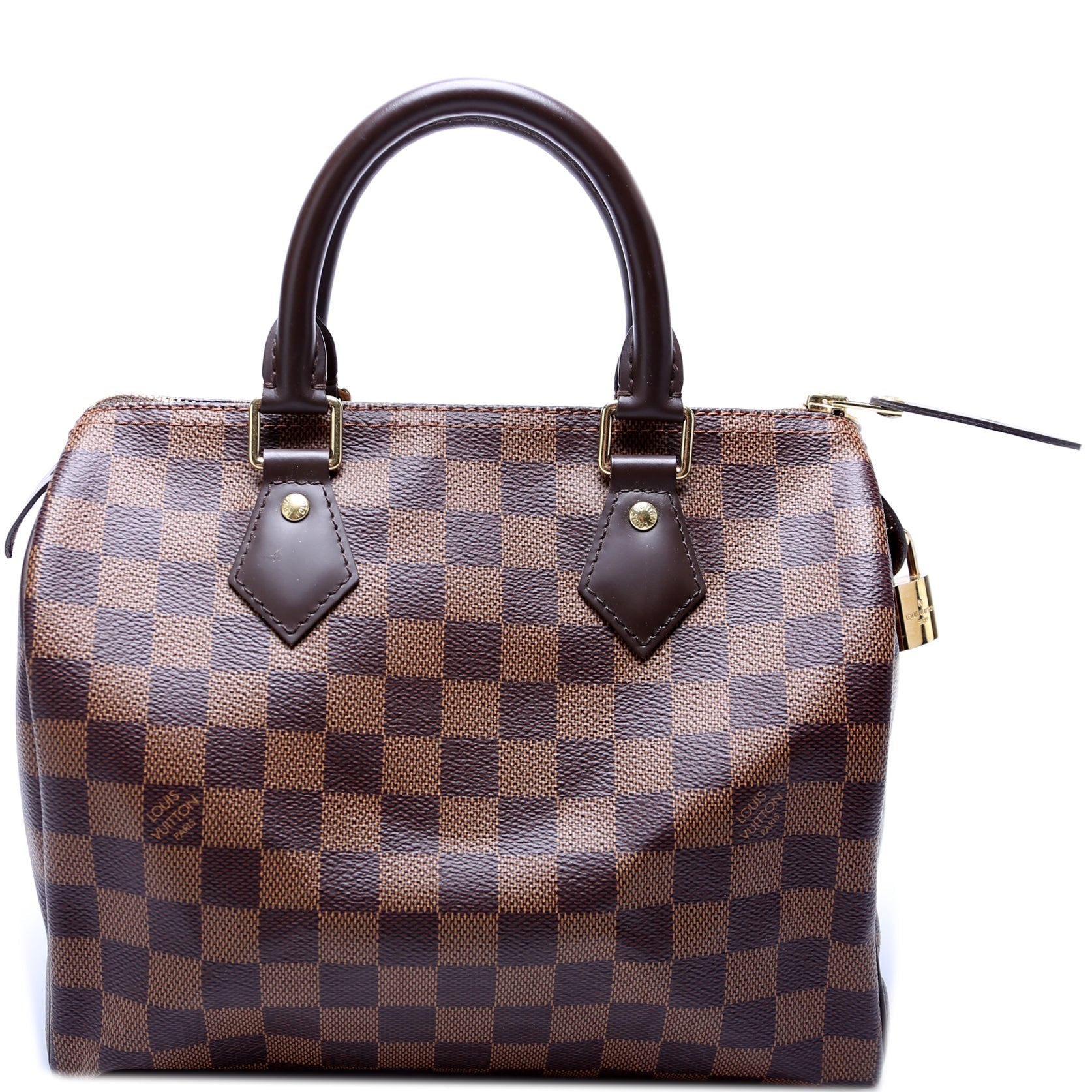 This Louis Vuitton Speedy 25is eye catching bag. The exterior is in the classic Louis Vuitton Damier Ebene coated canvas.