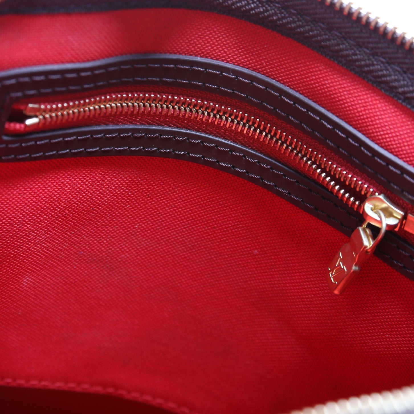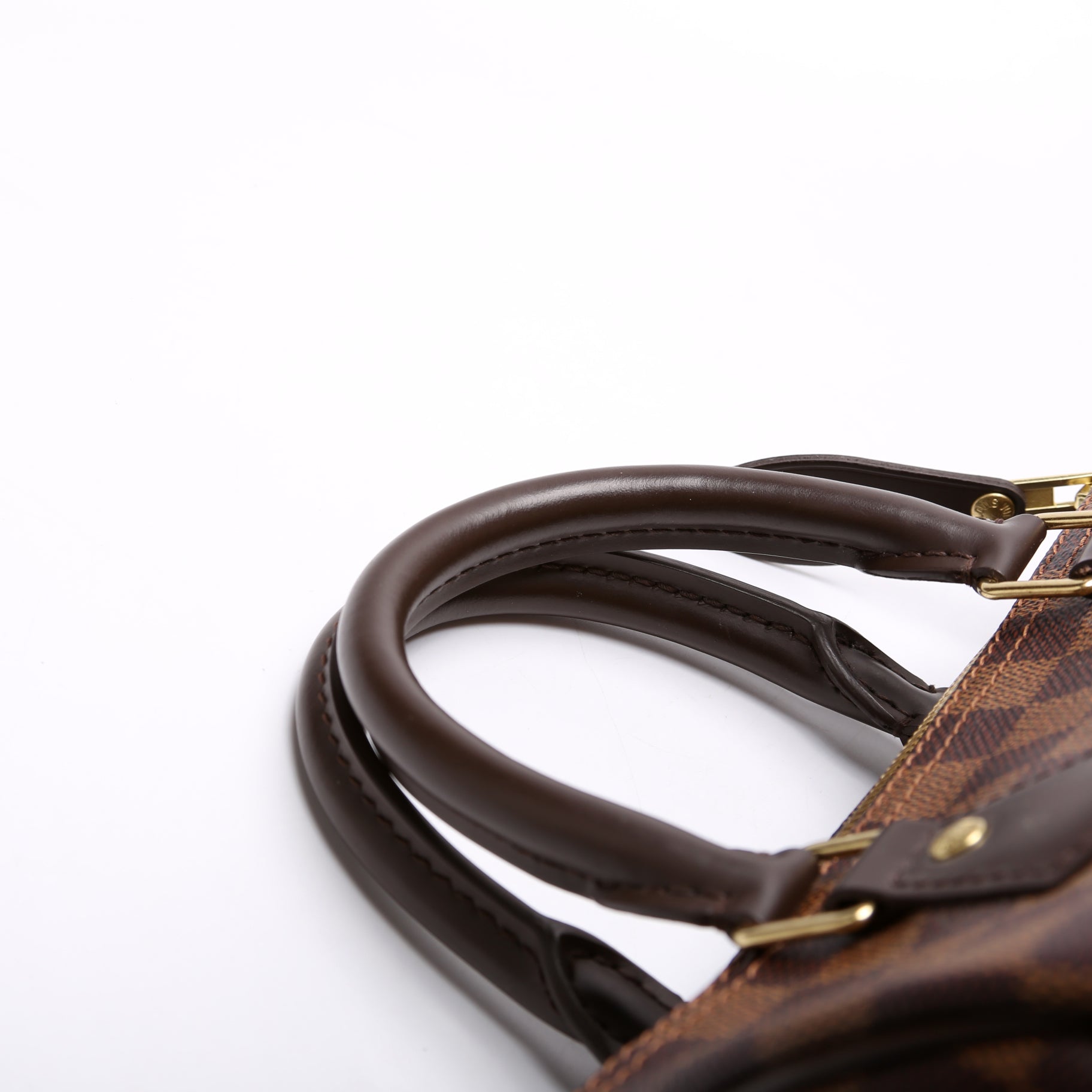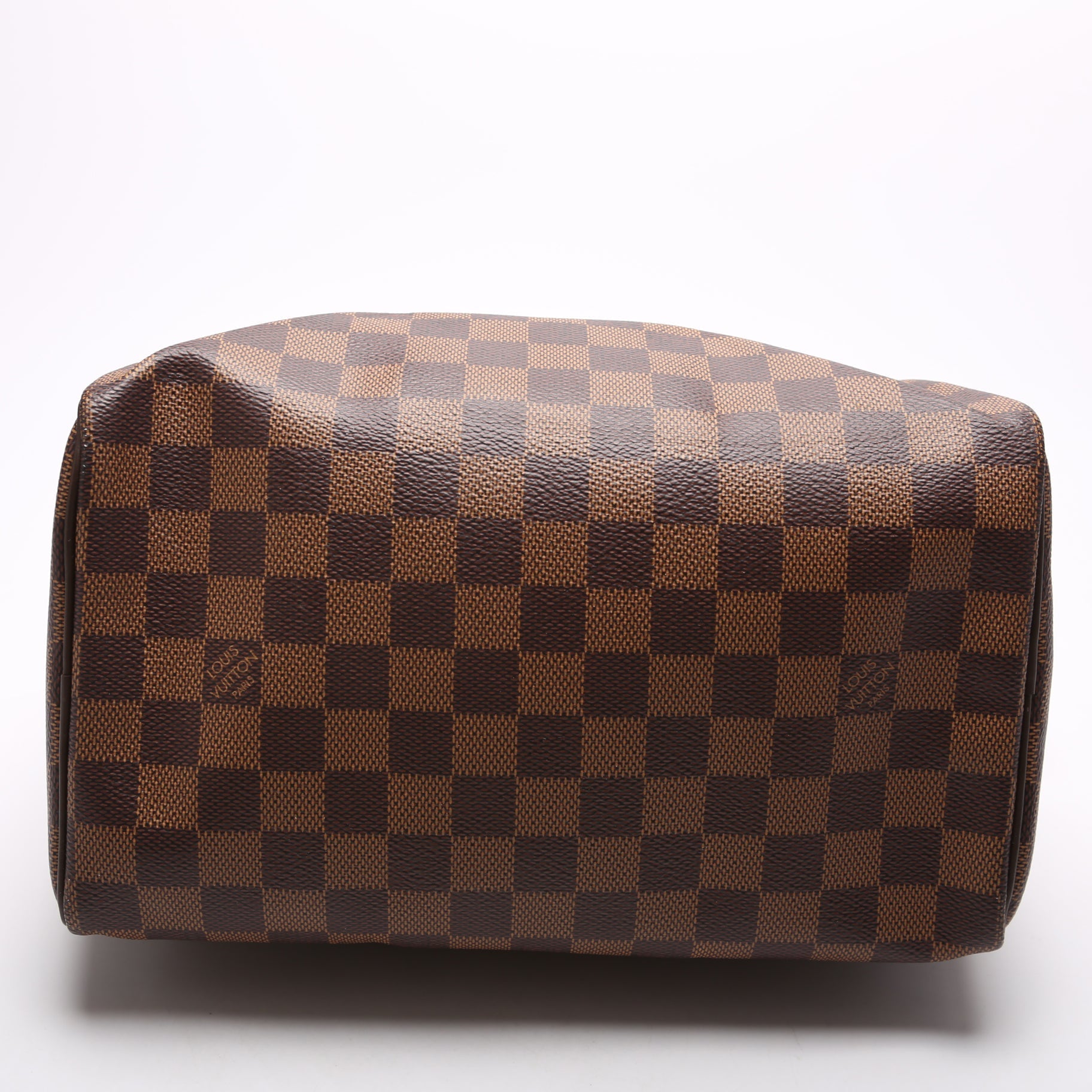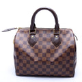 This Louis Vuitton Speedy 25is eye catching bag. The exterior is in the classic Louis Vuitton Damier Ebene coated canvas.
