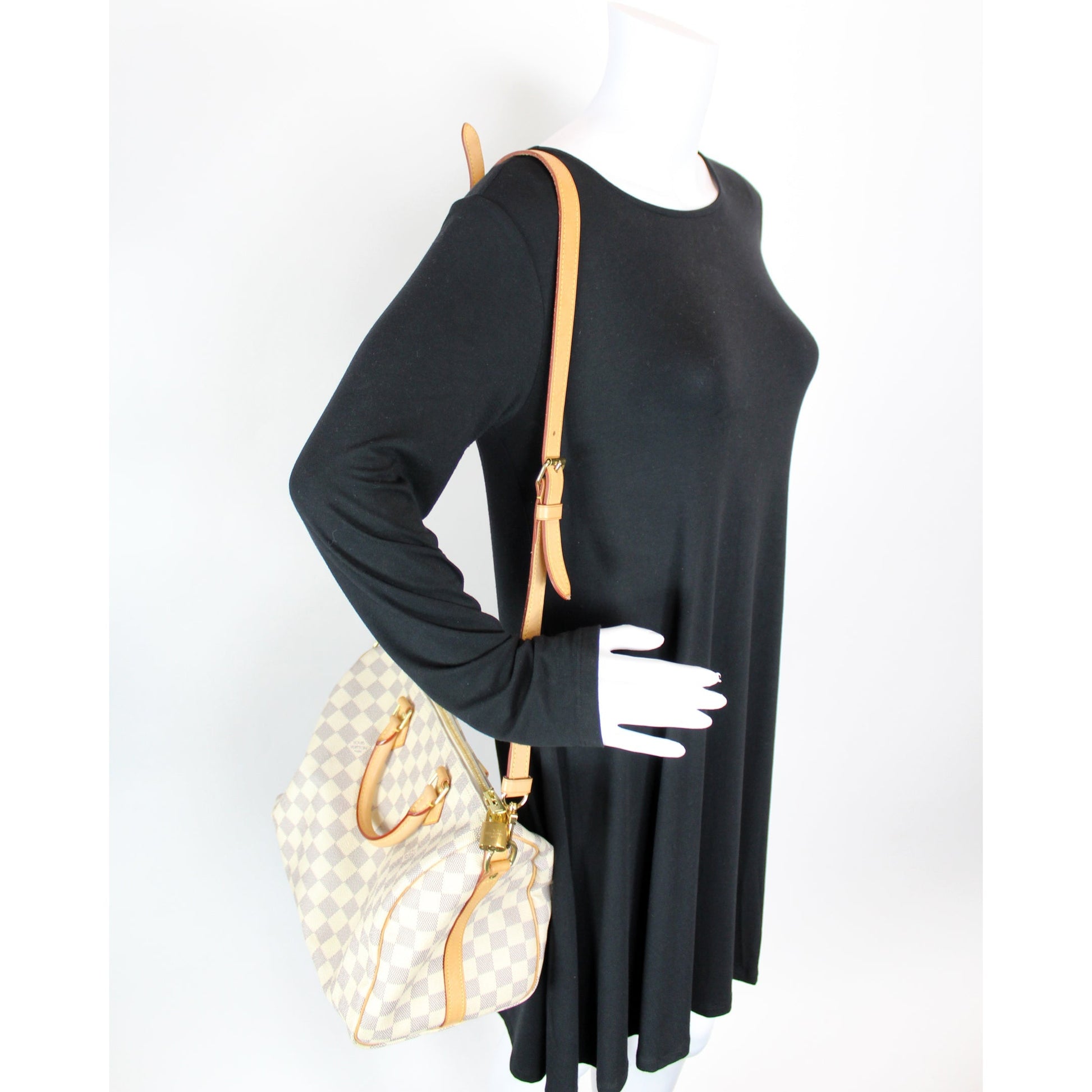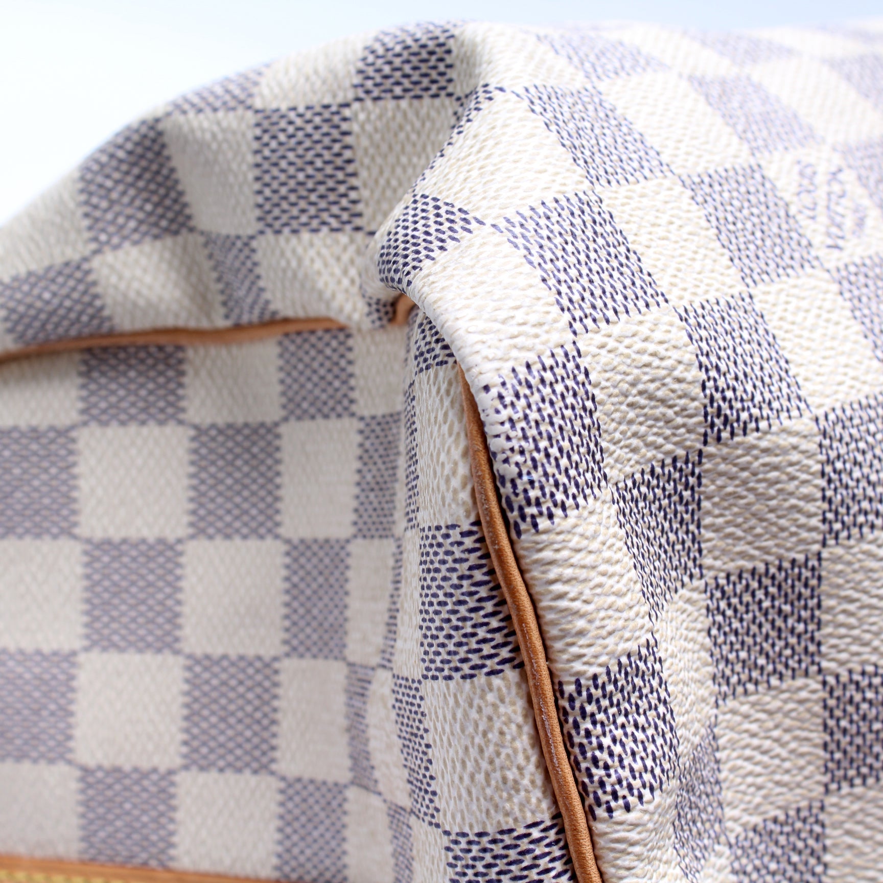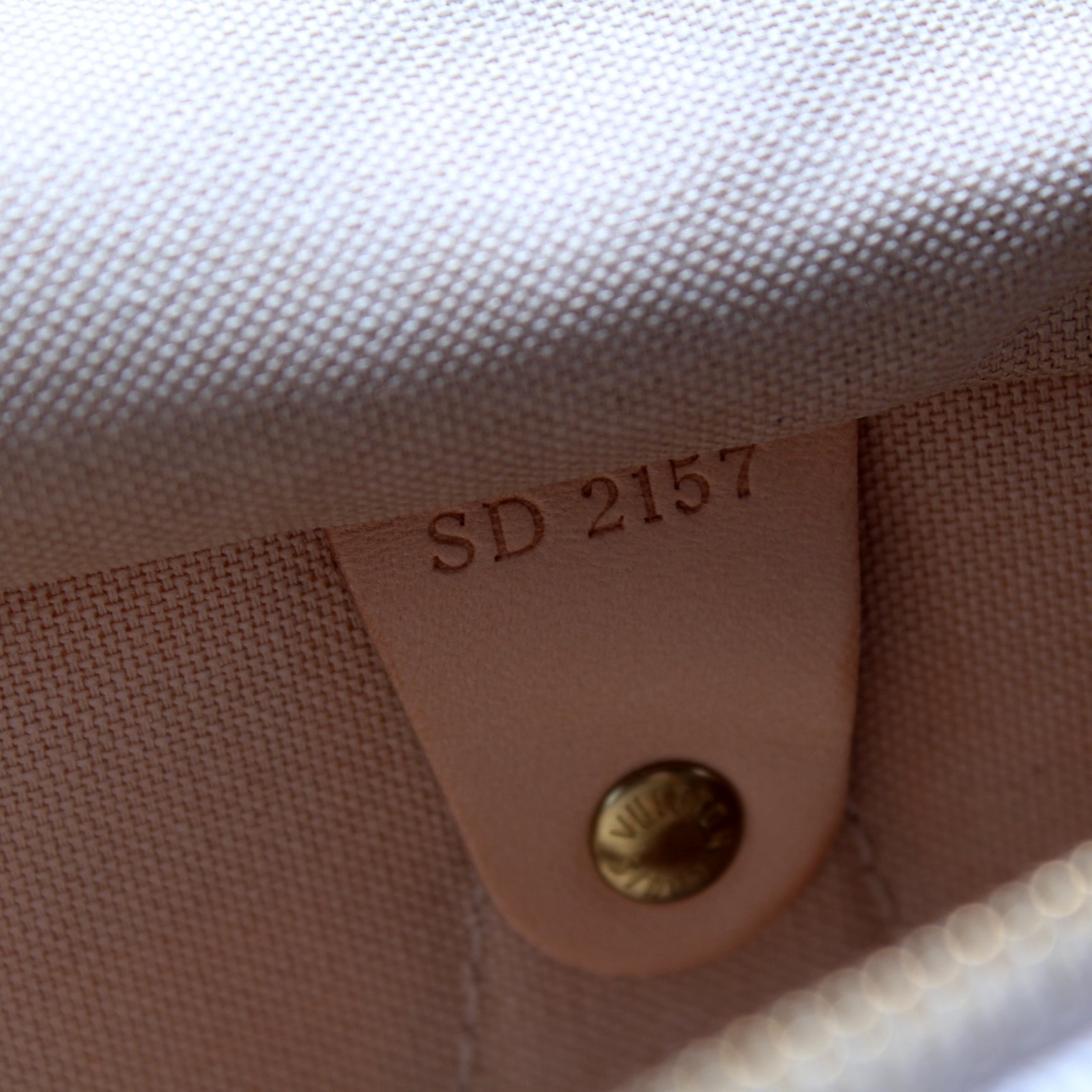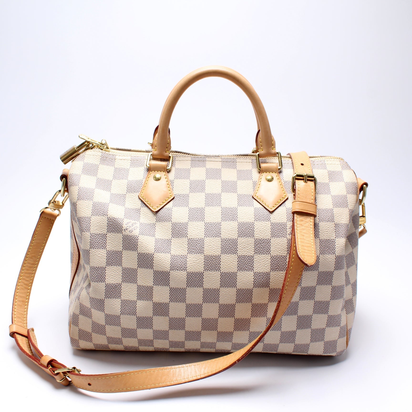 This Louis Vuitton Speedy 30is eye catching bag. The exterior is in the classic Louis Vuitton Damier Azur coated canvas.