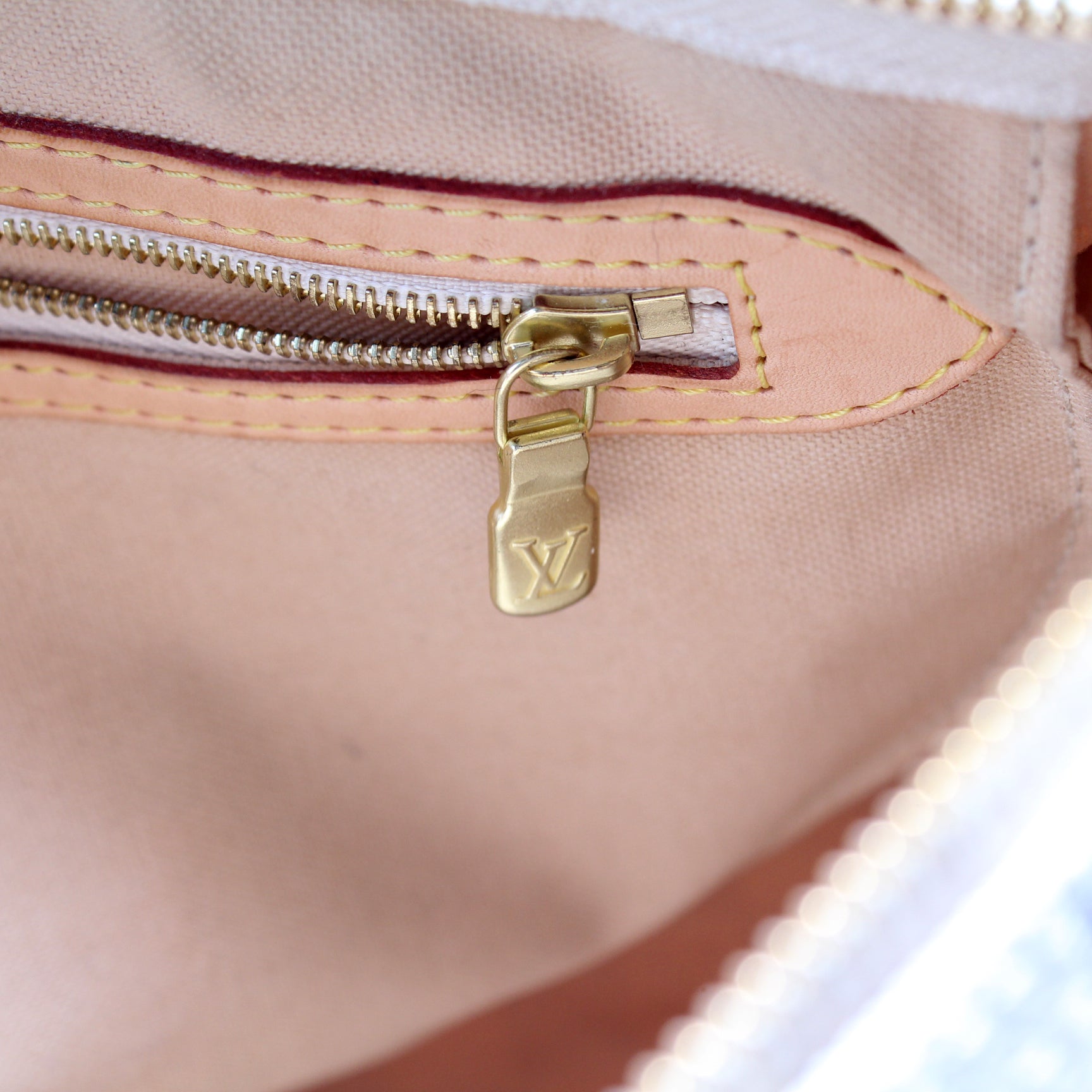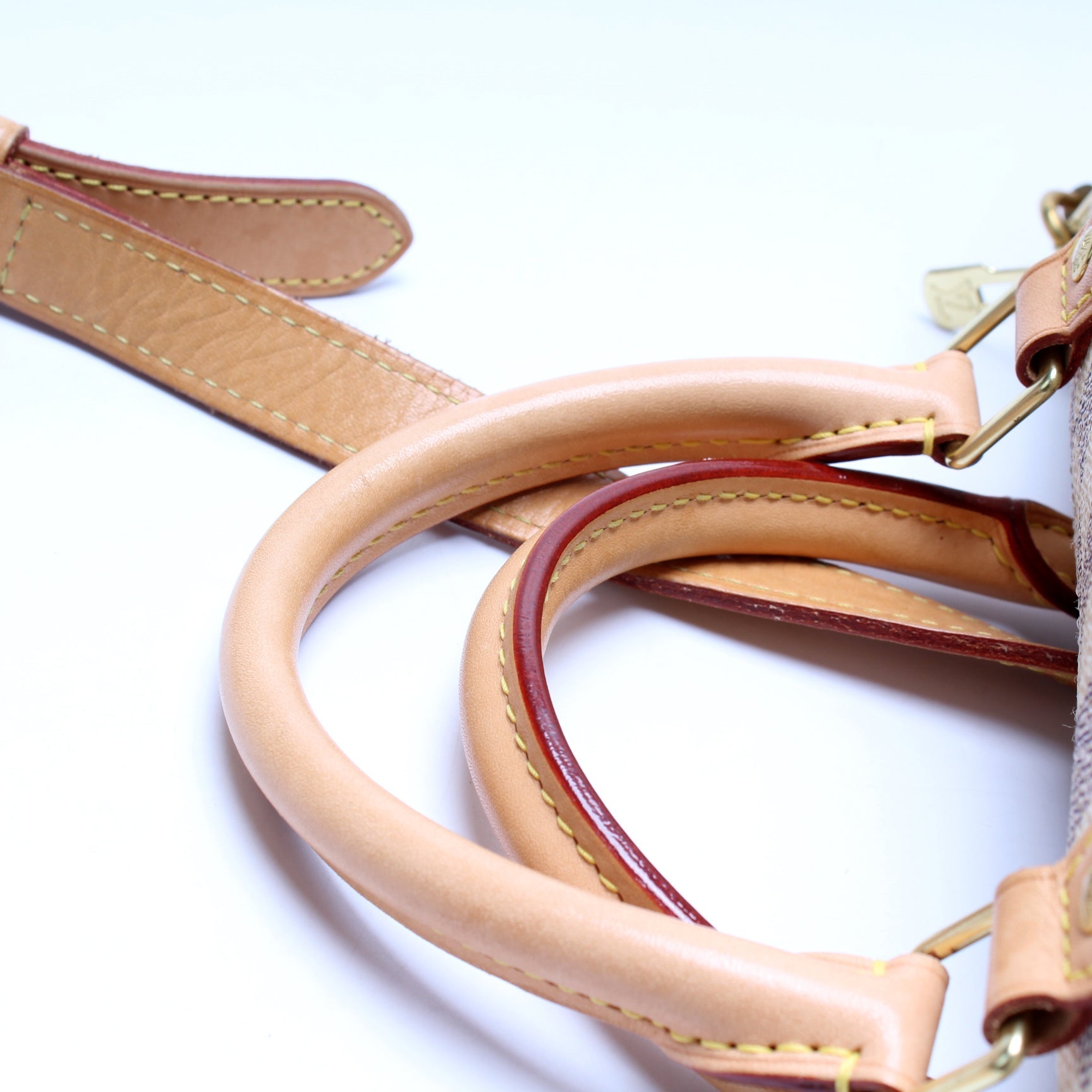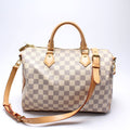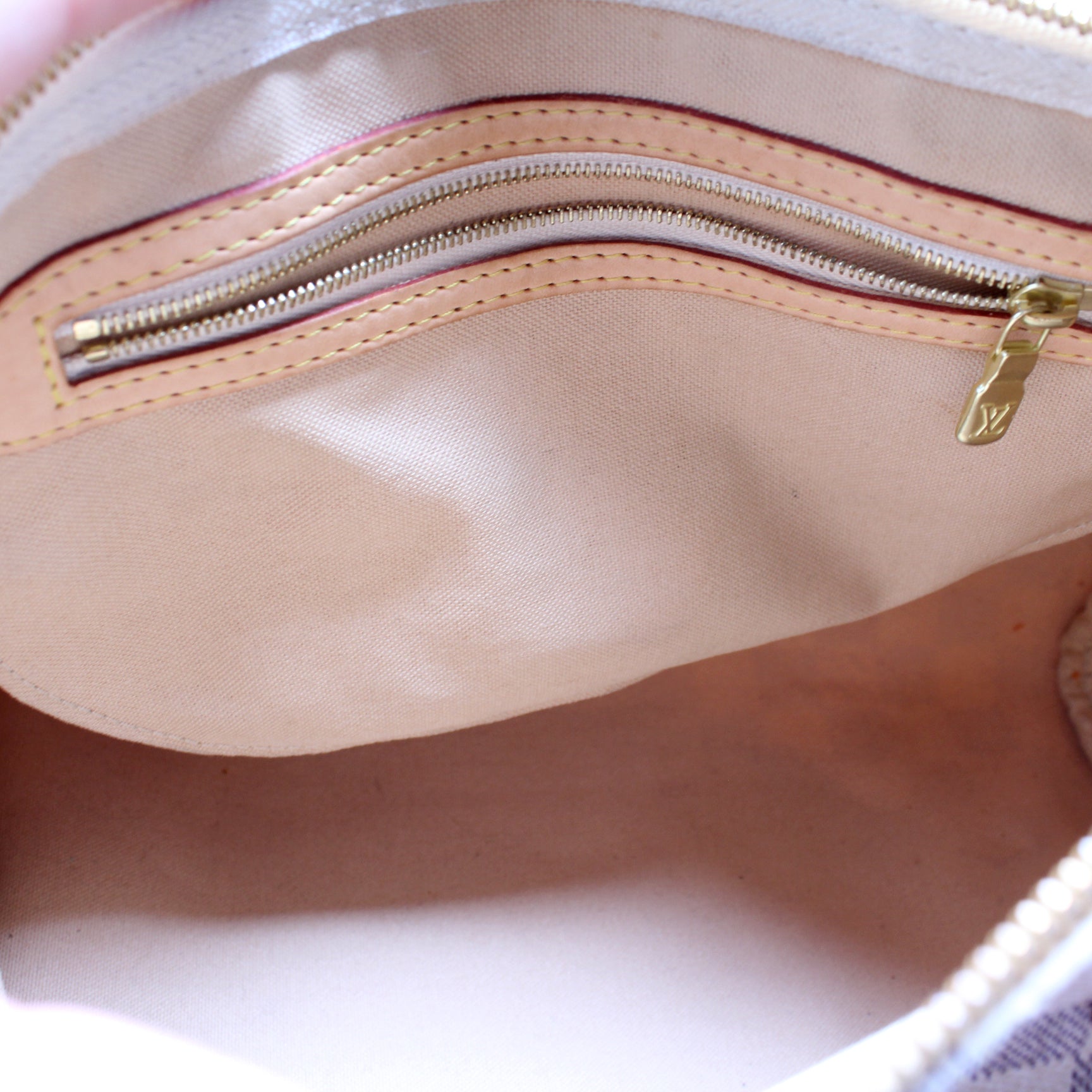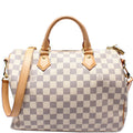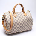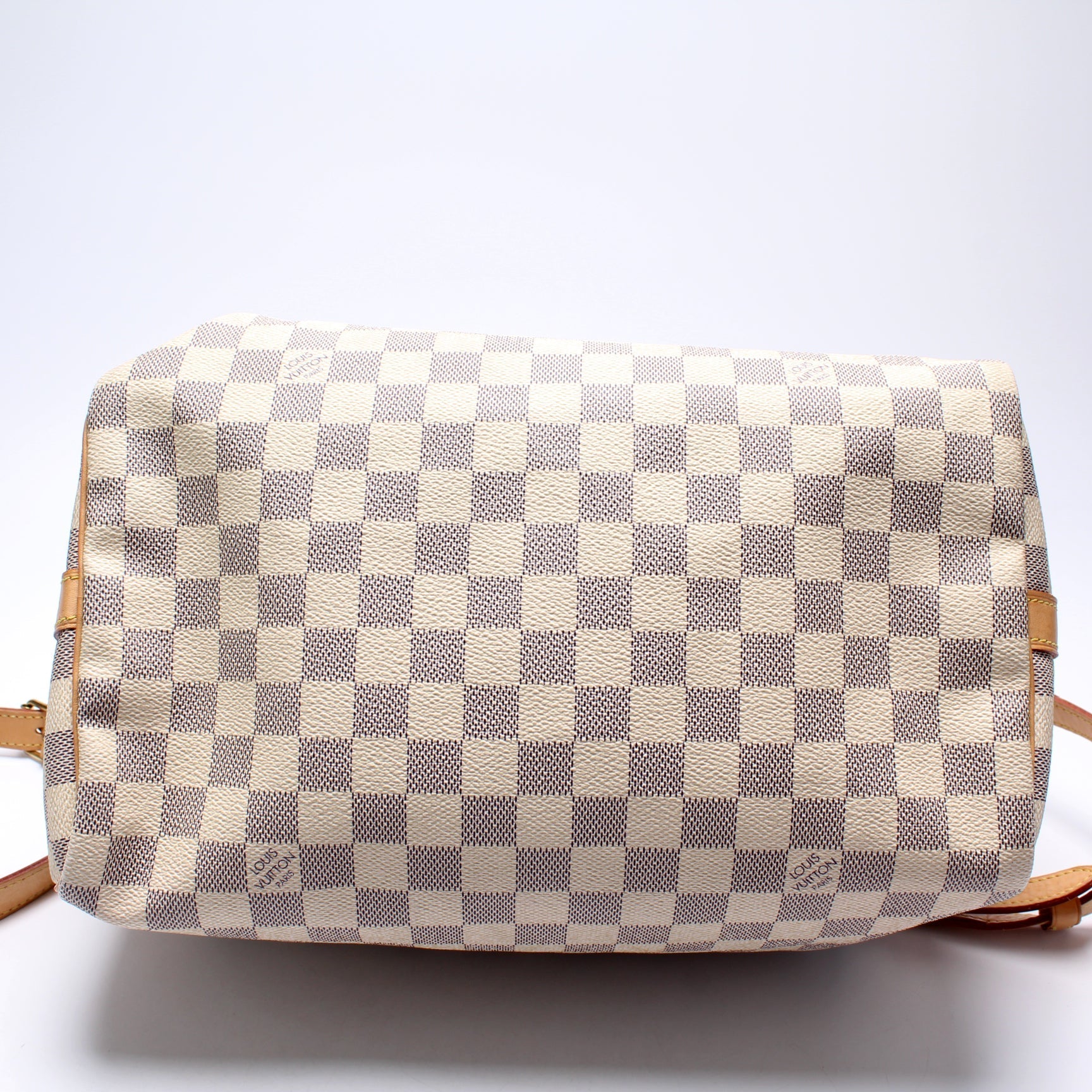 This Louis Vuitton Speedy 30is eye catching bag. The exterior is in the classic Louis Vuitton Damier Azur coated canvas.