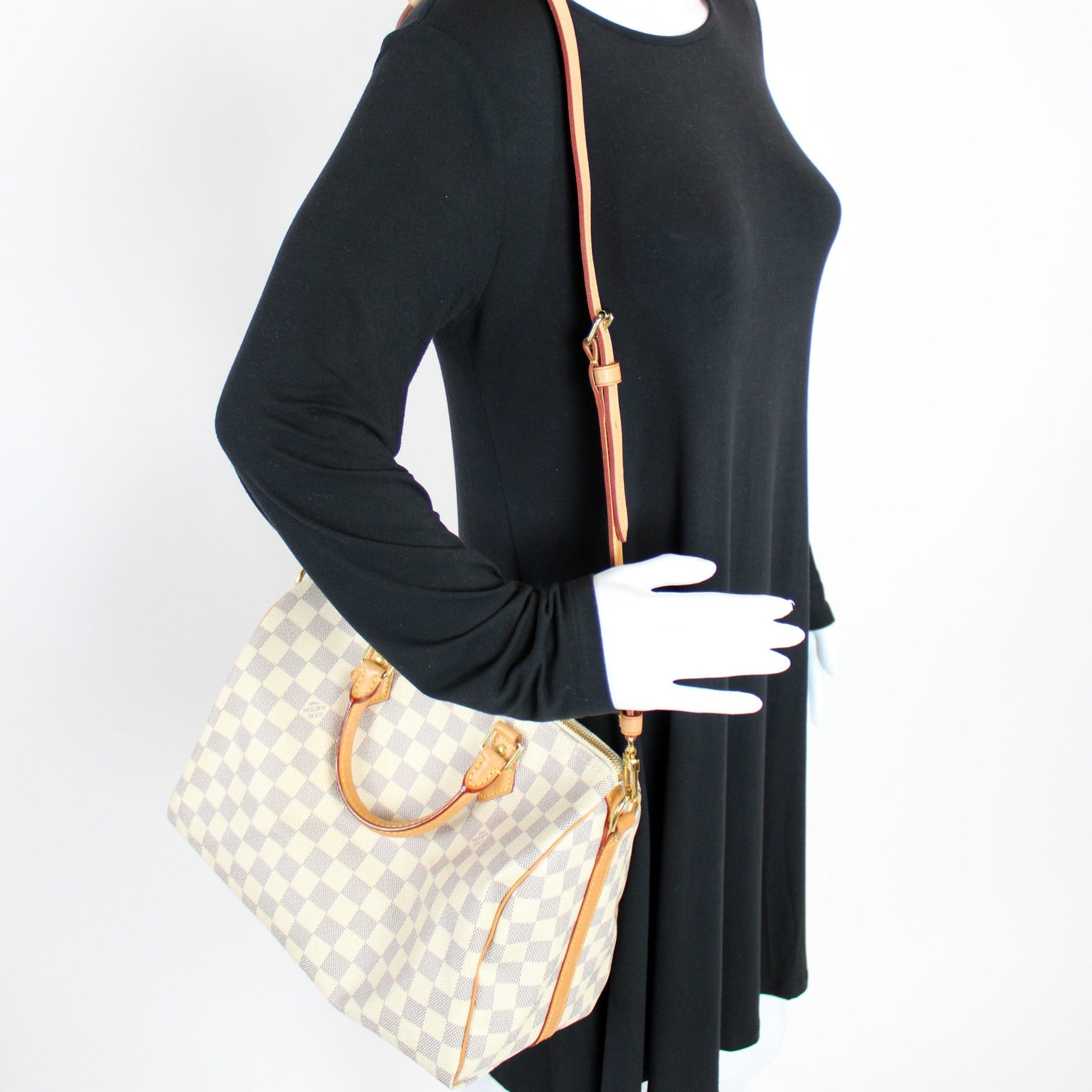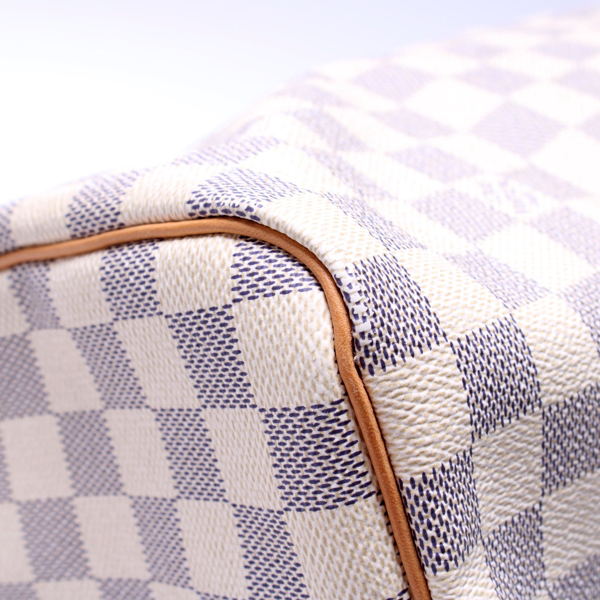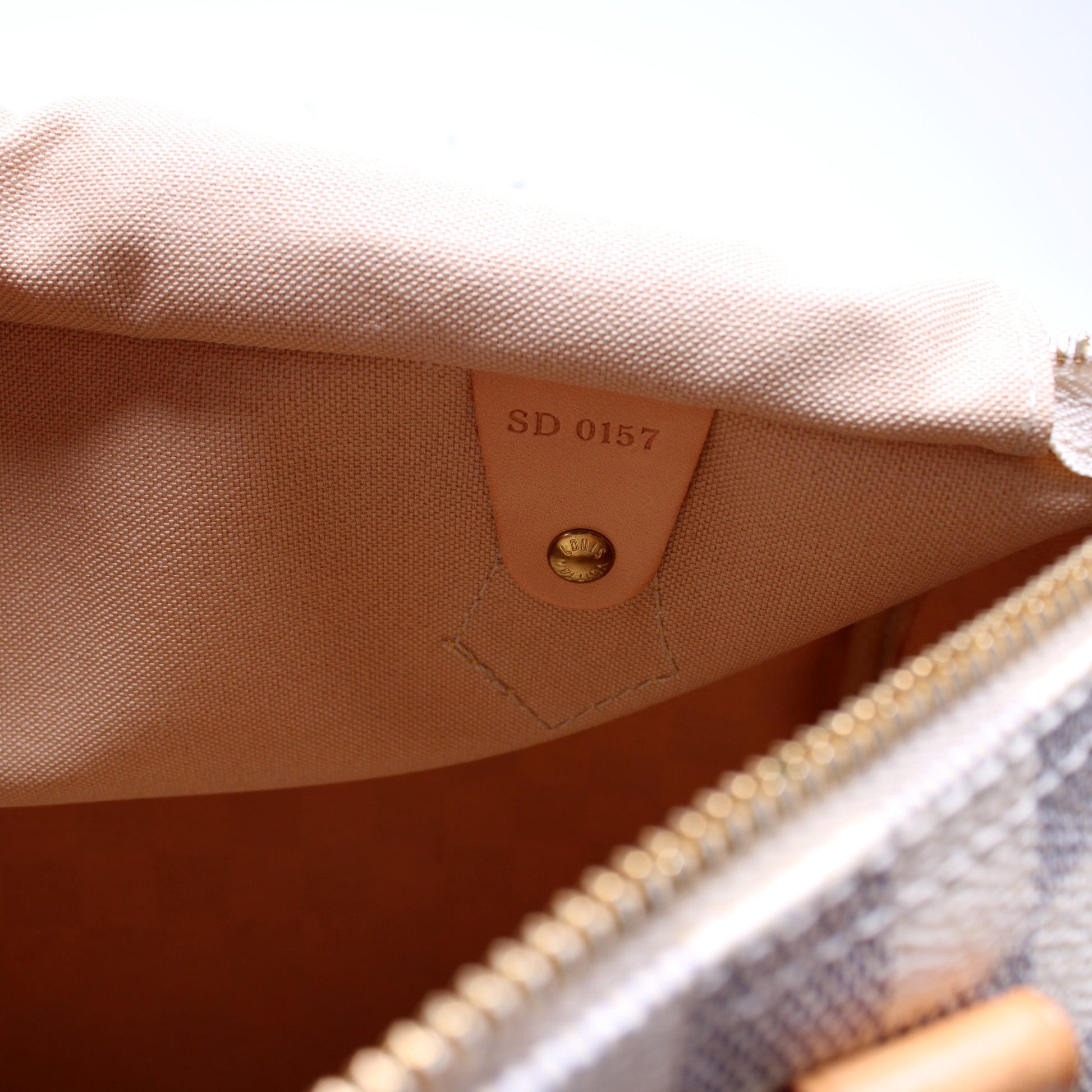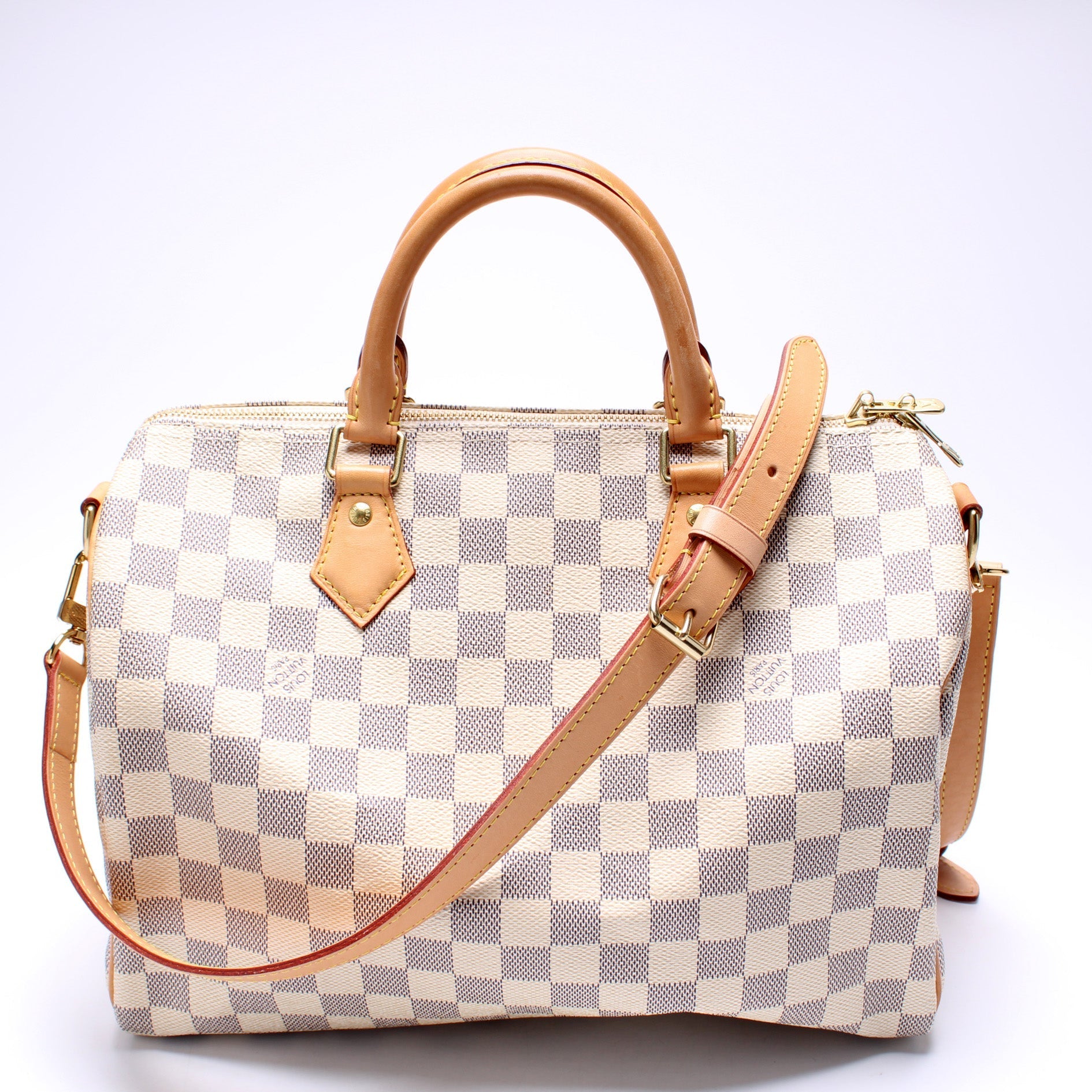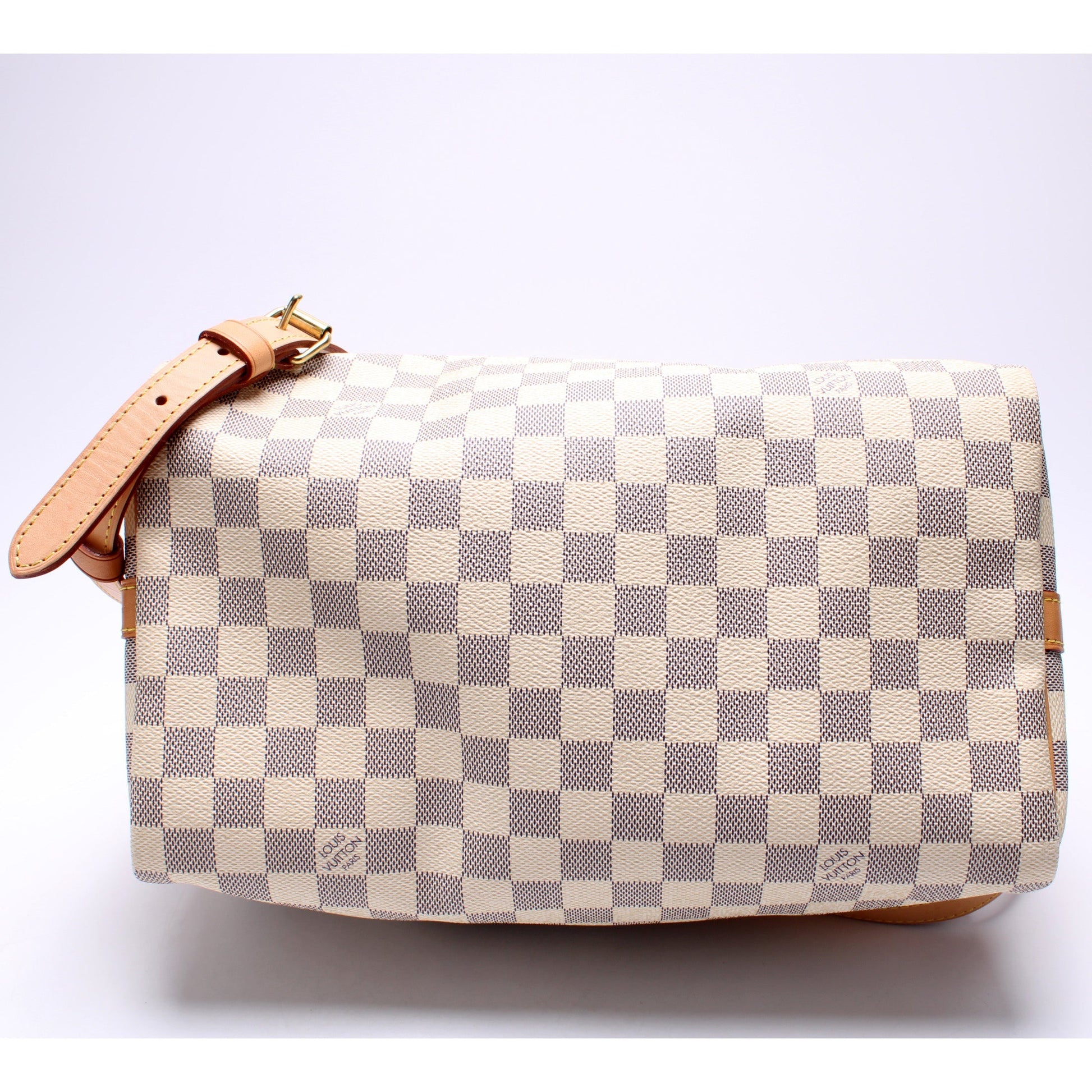 This Louis Vuitton Speedy 30 Bandouliereis eye catching bag. The exterior is in the classic Louis Vuitton Damier Azur coated canvas.