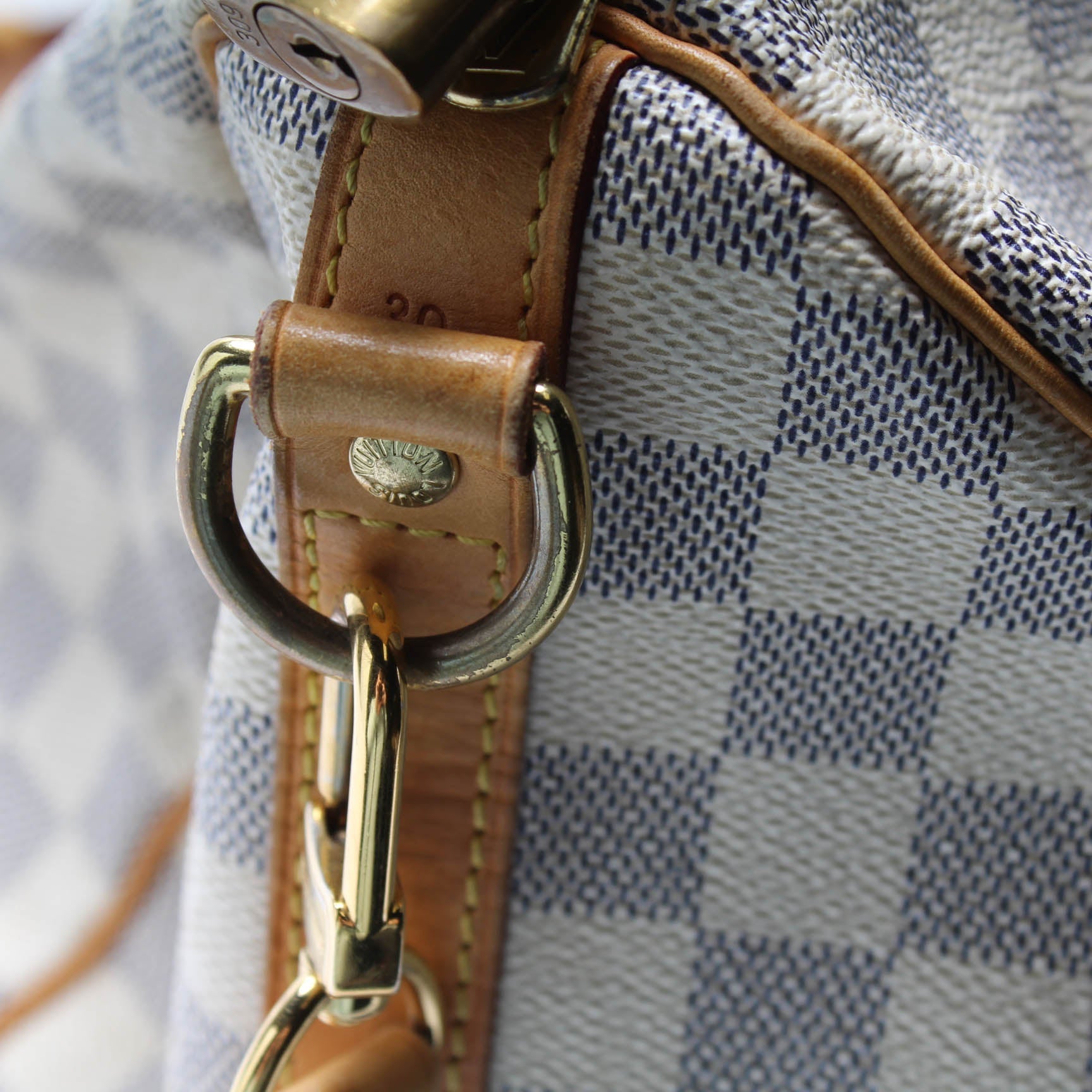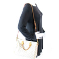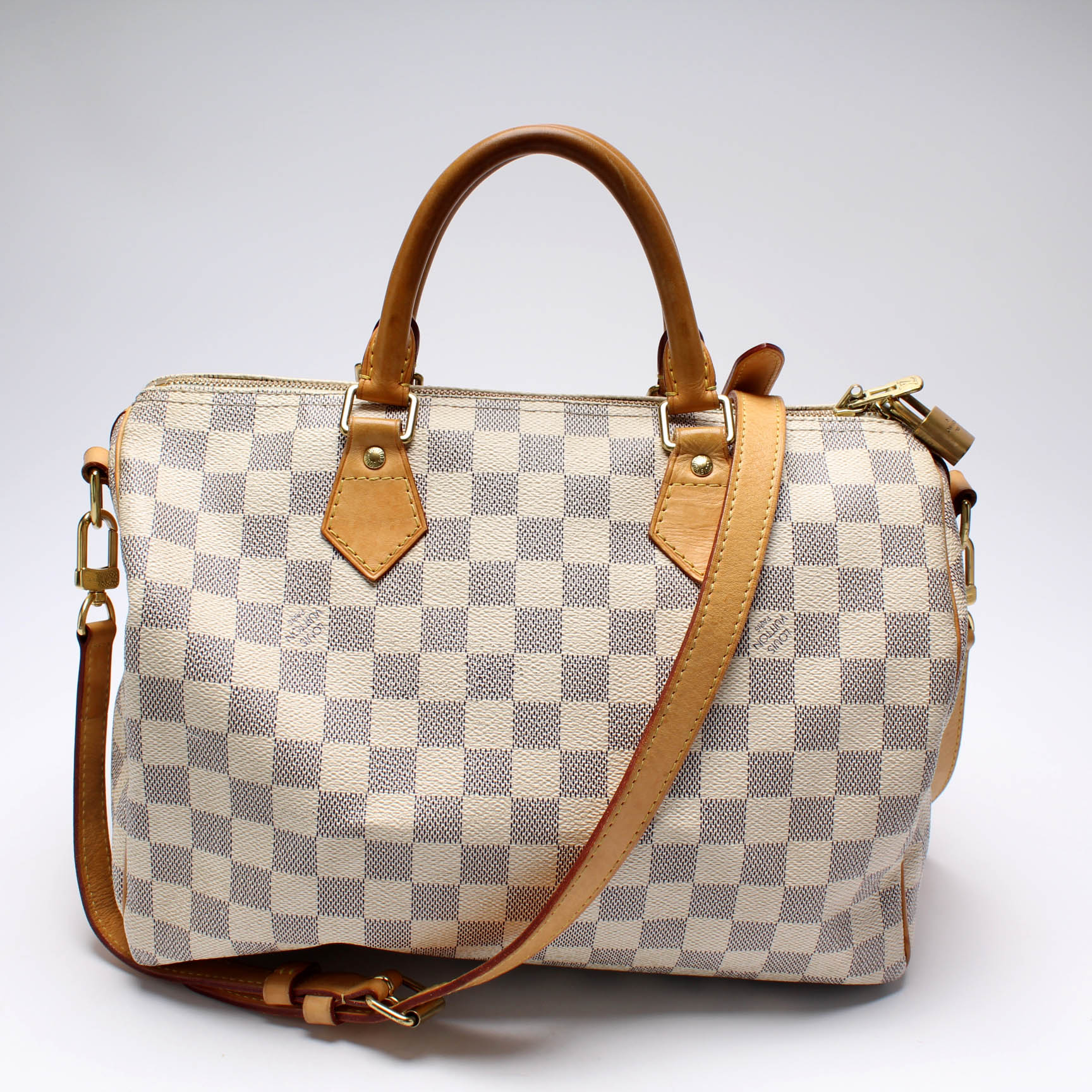This Louis Vuitton Speedy 30 Bandouliereis eye catching bag. The exterior is in the classic Louis Vuitton Damier Azur coated canvas.
