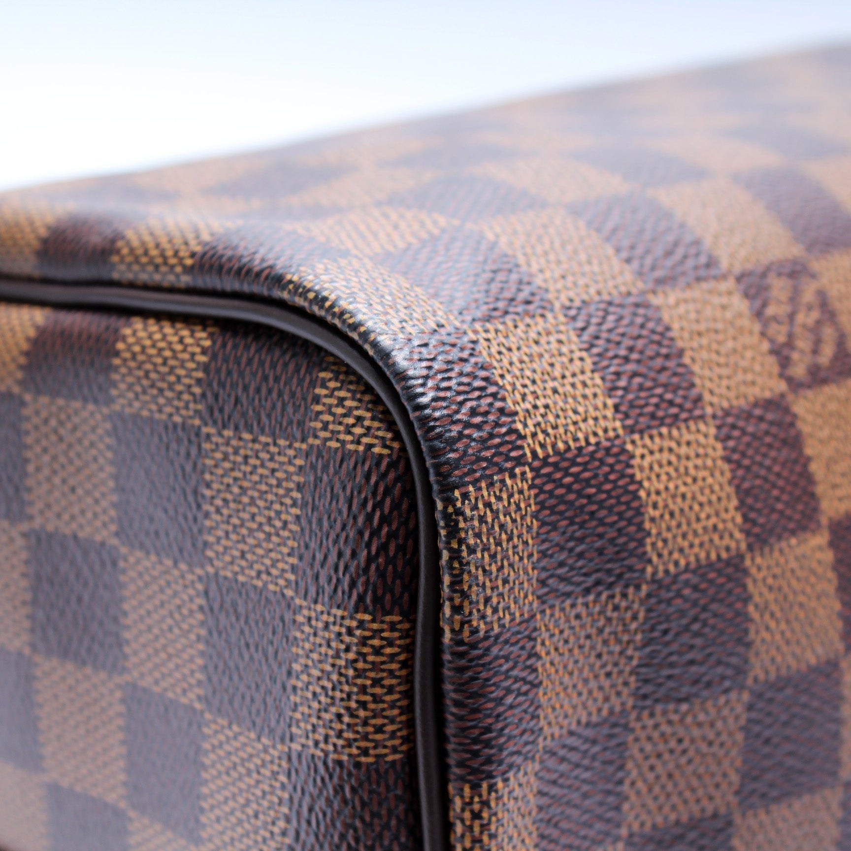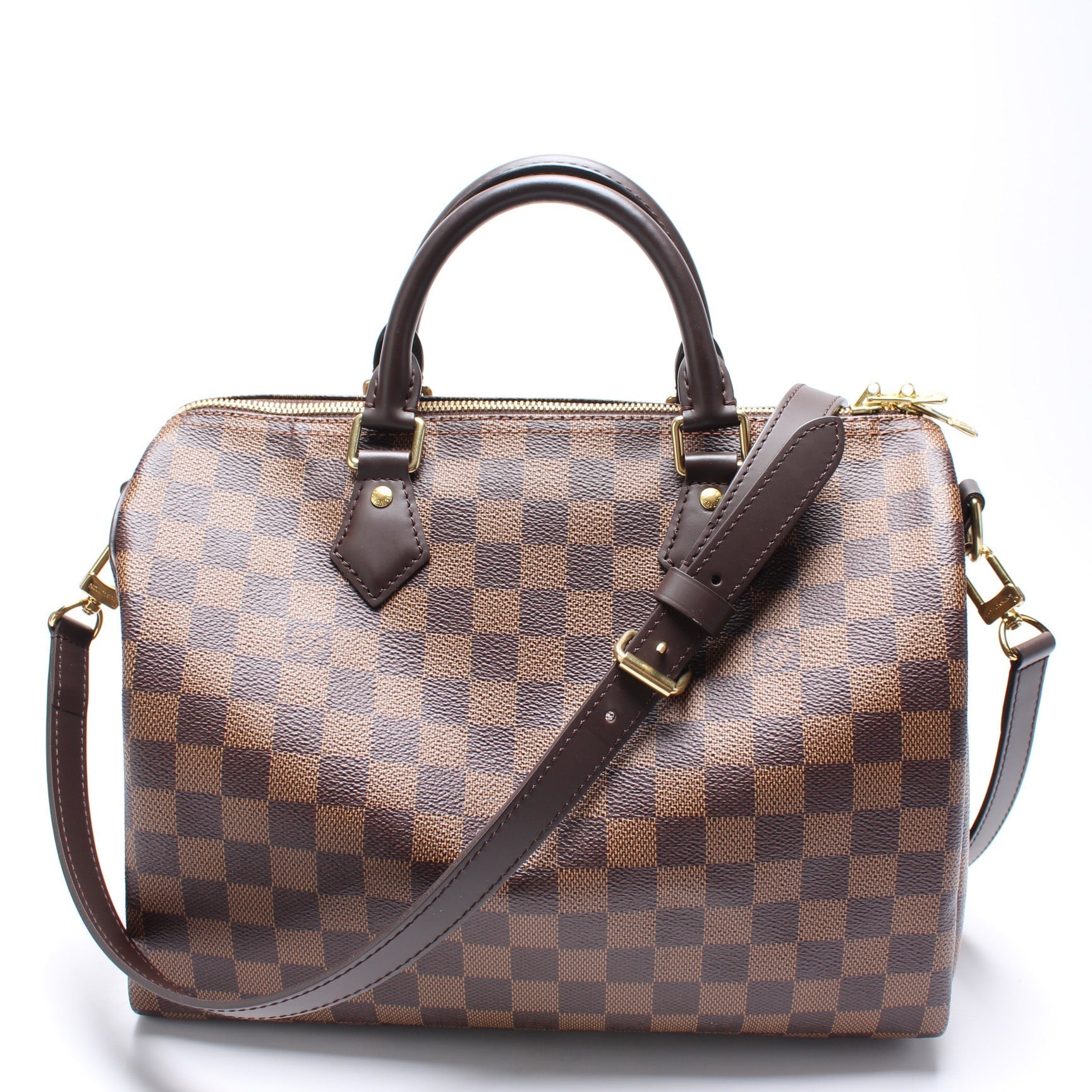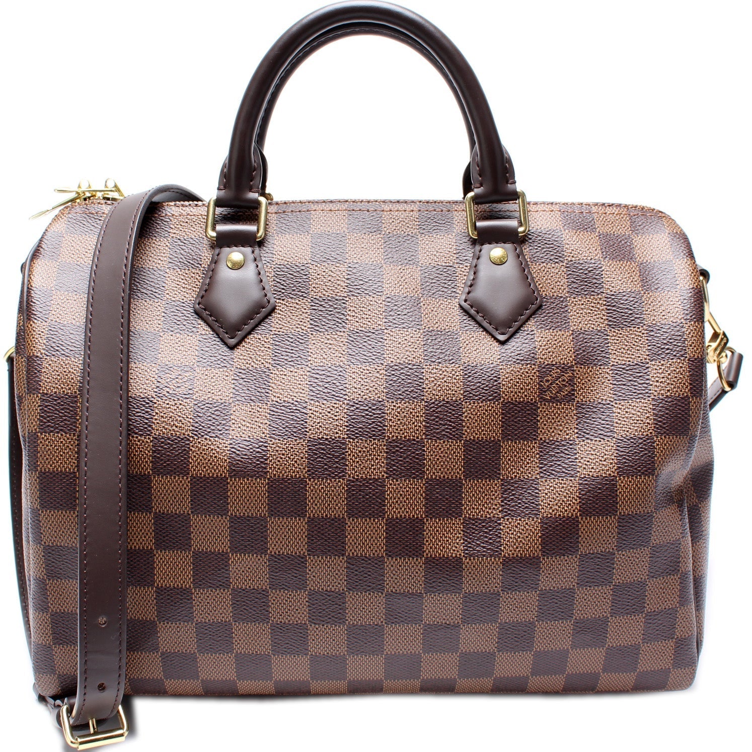 This Louis Vuitton Speedy 30 Bandouliereis eye catching bag. The exterior is in the classic Damier Ebene coated canvas.
