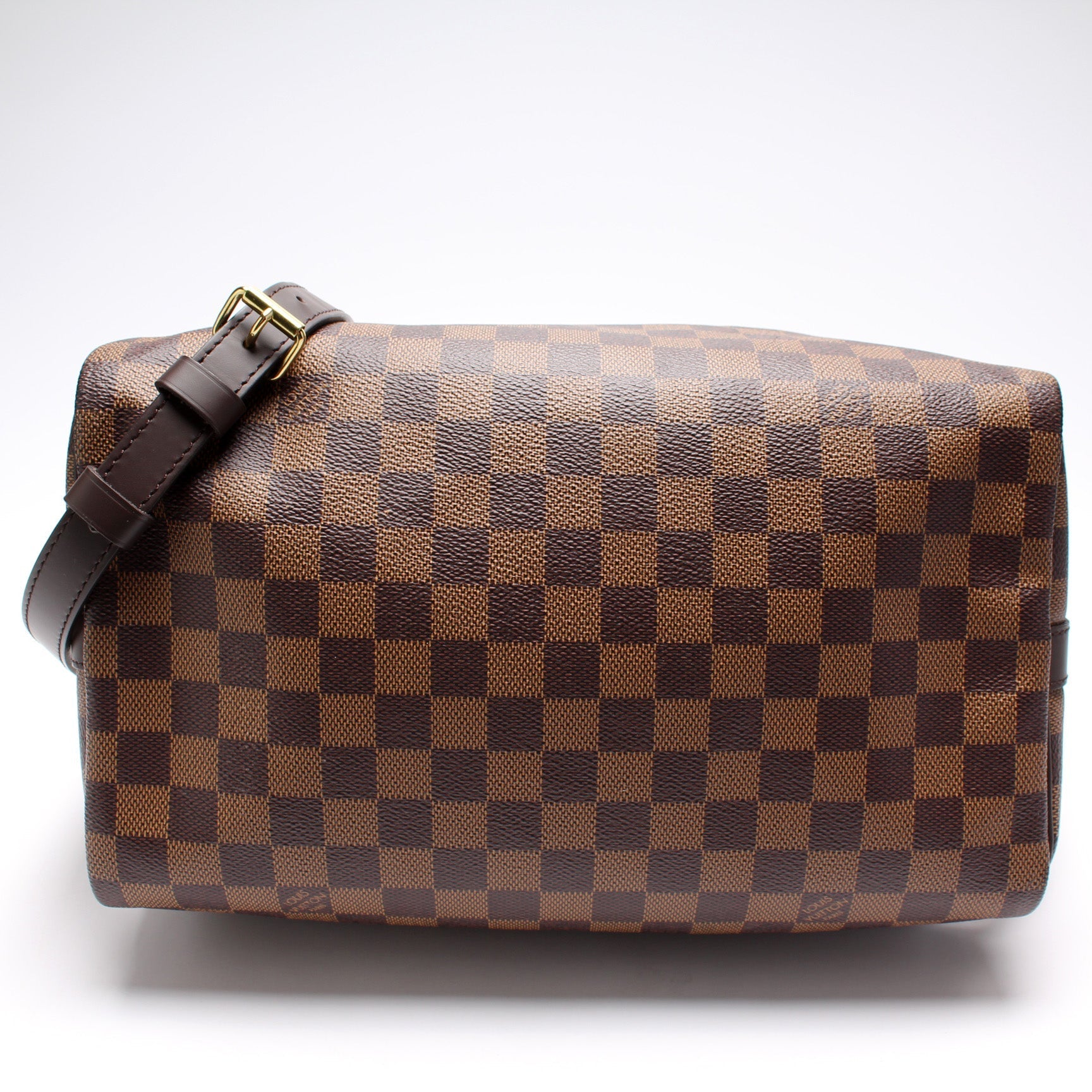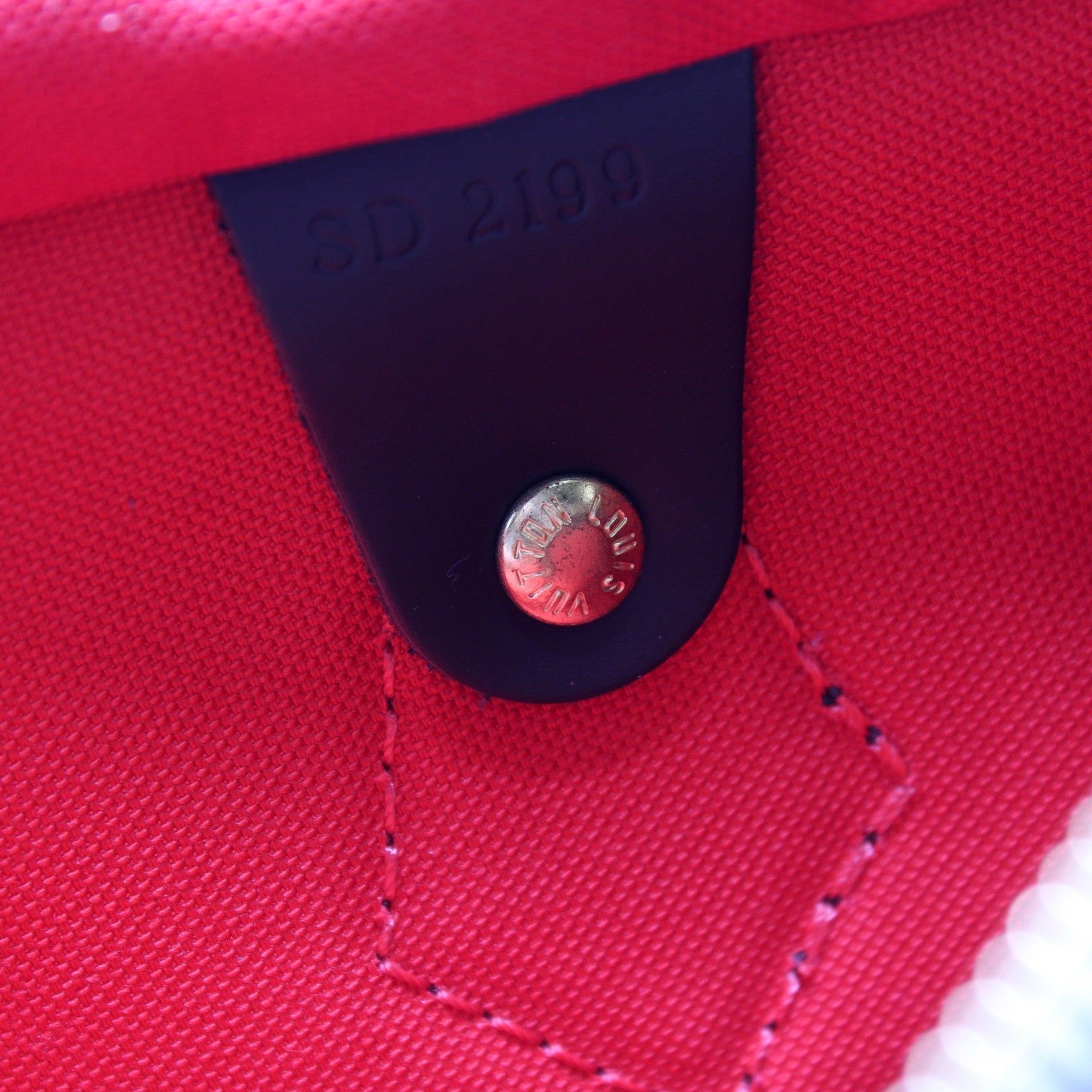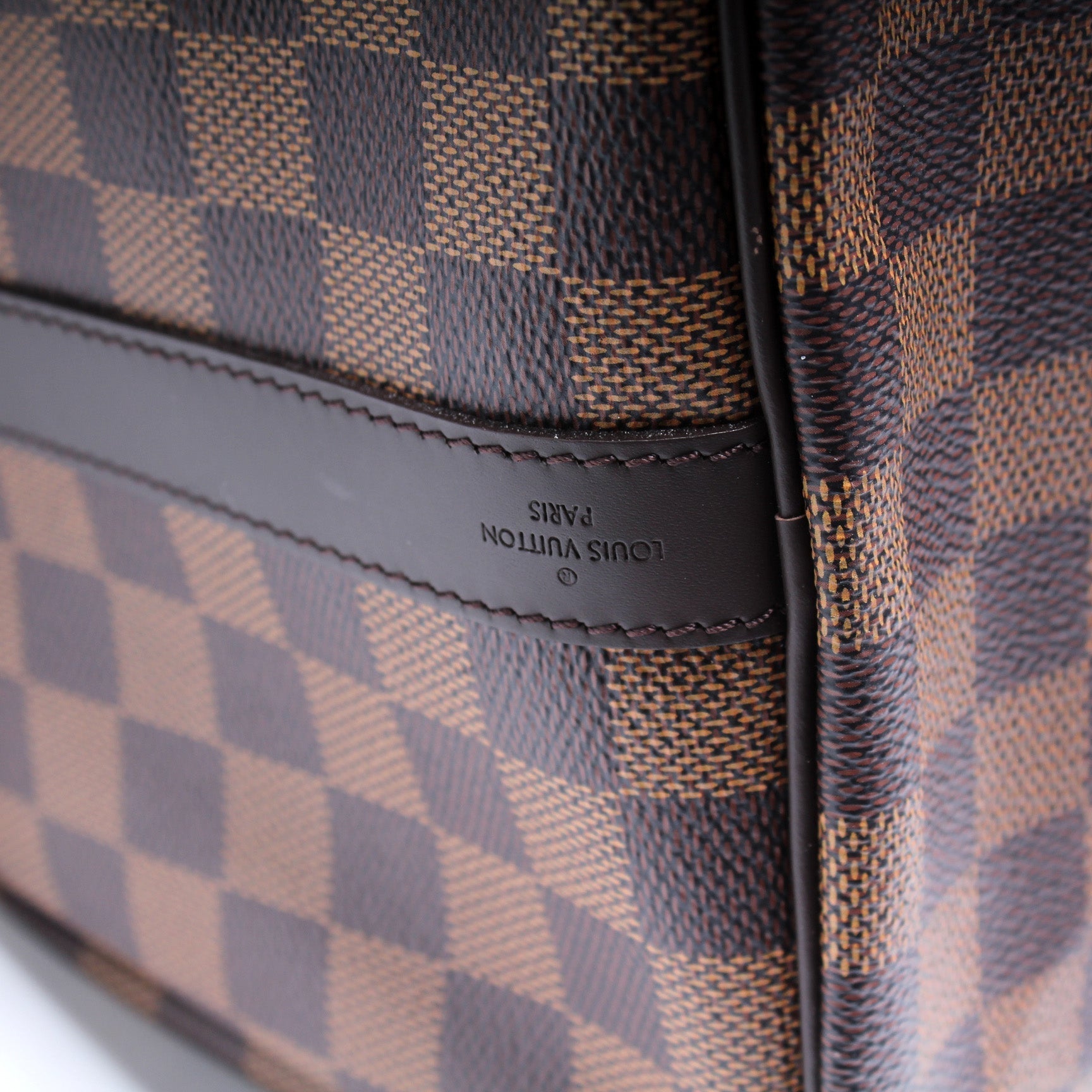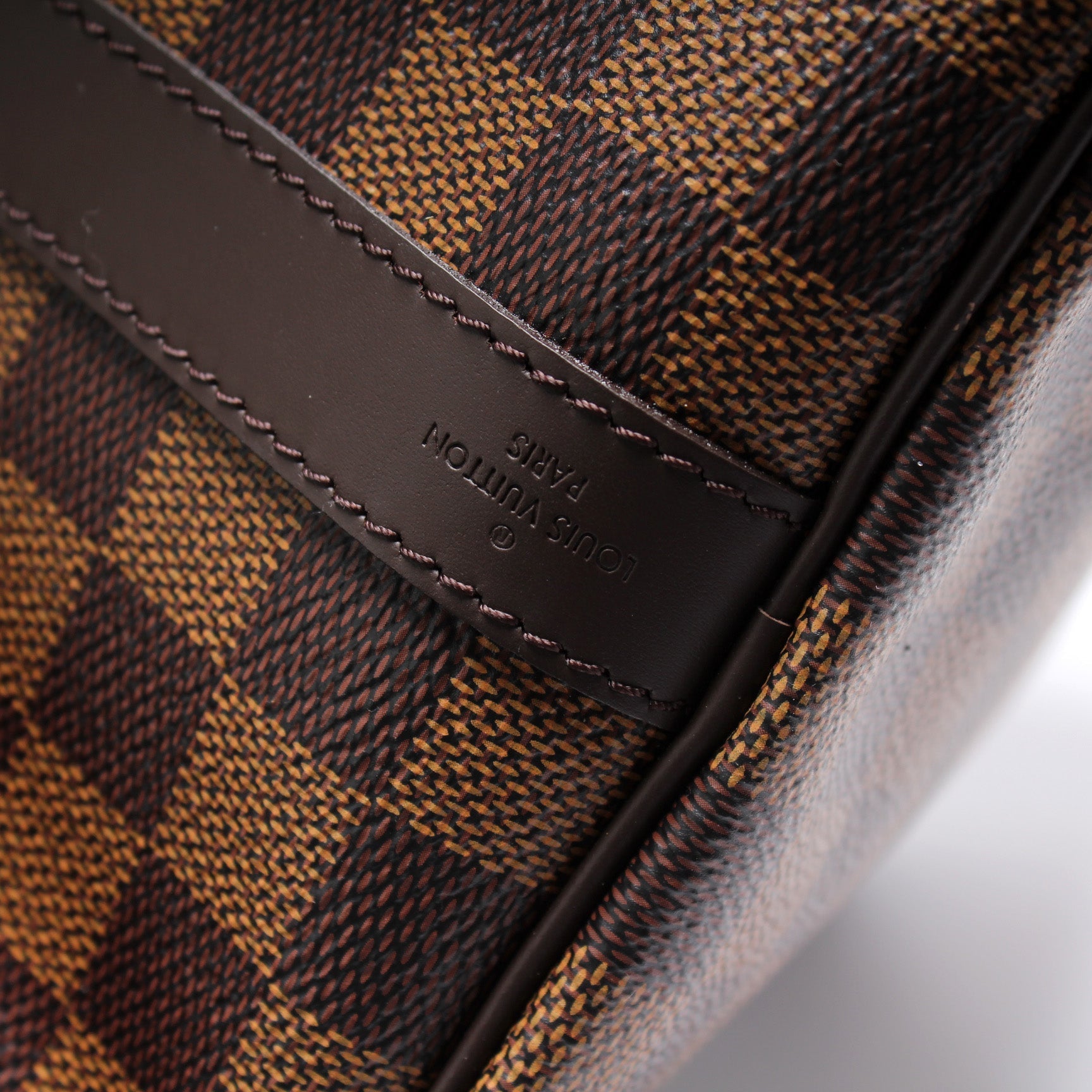 This Louis Vuitton Speedy 30 Bandouliereis eye catching bag. The exterior is in the classic Damier Ebene coated canvas.