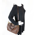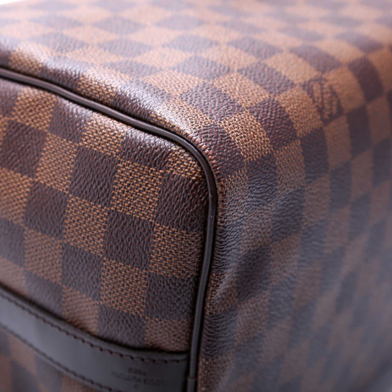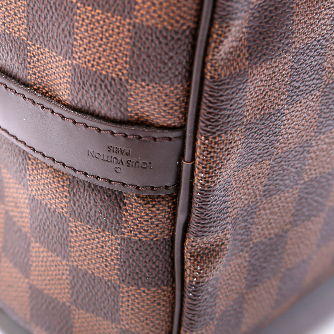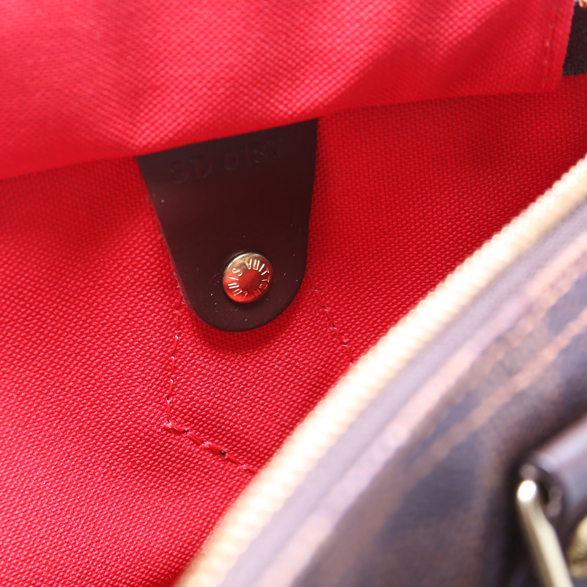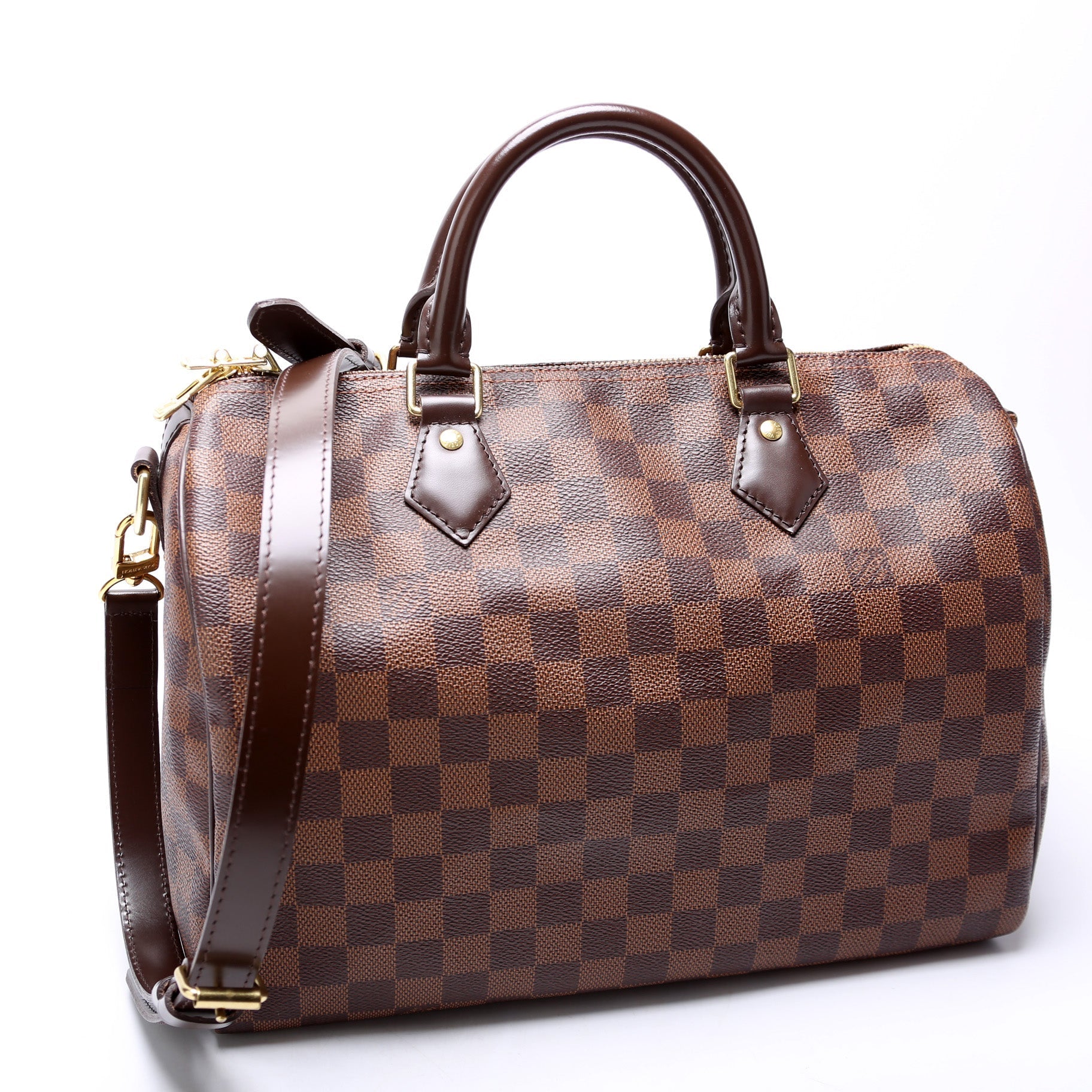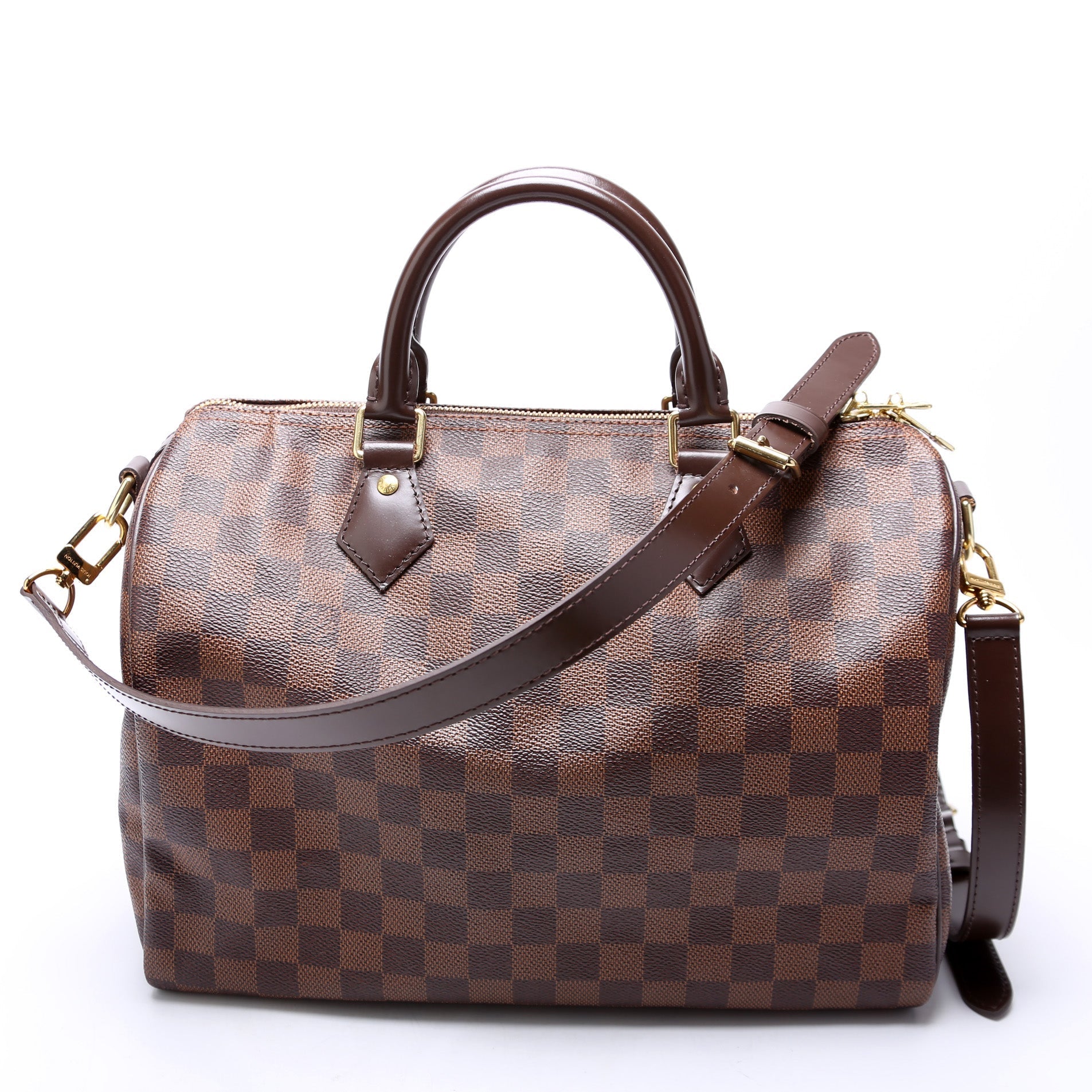 This Louis Vuitton Speedy 30 Bandouliereis eye catching bag. The exterior is in the classic Damier Ebene coated canvas.
