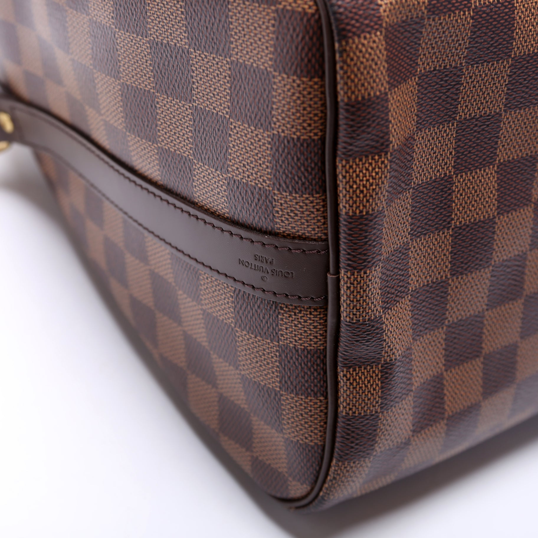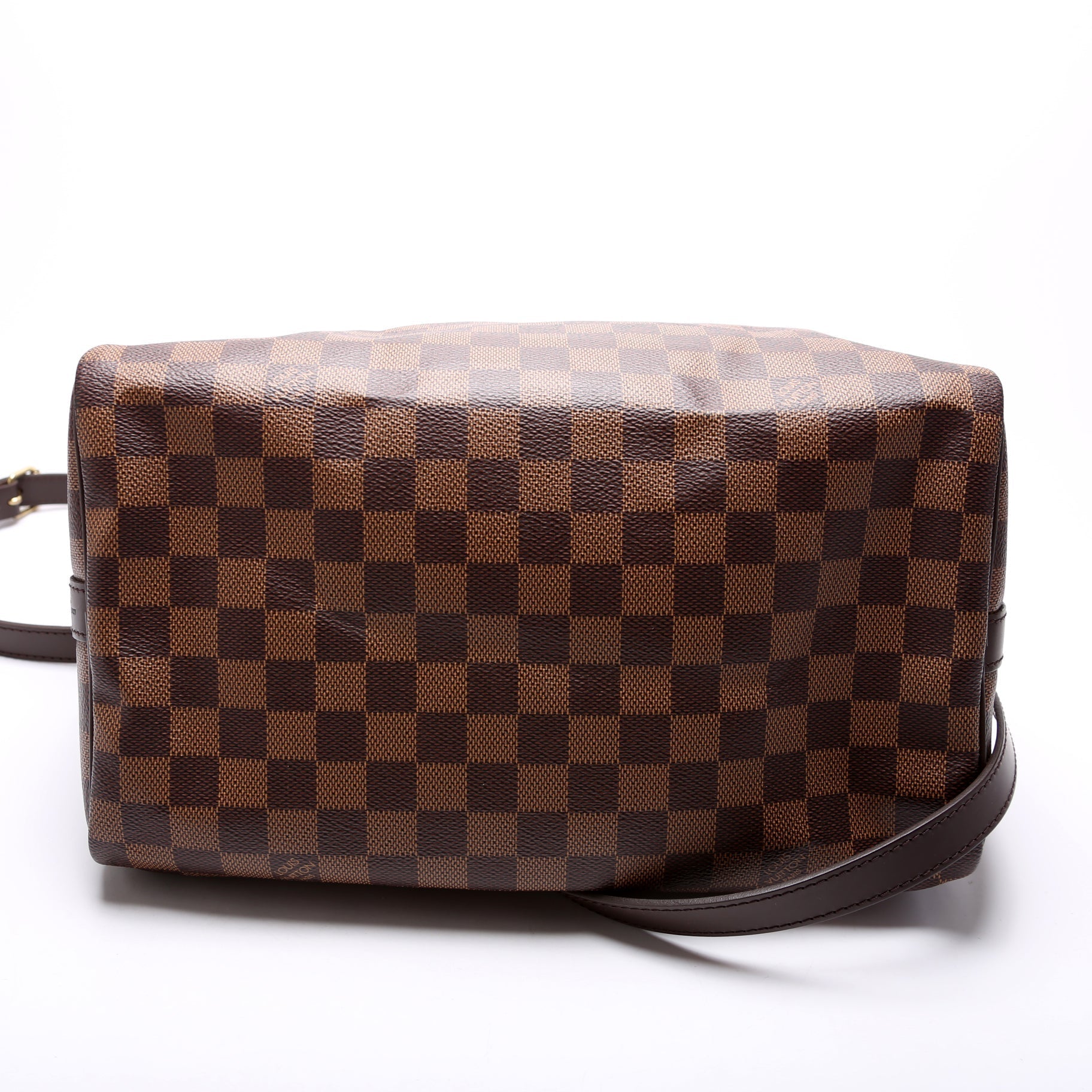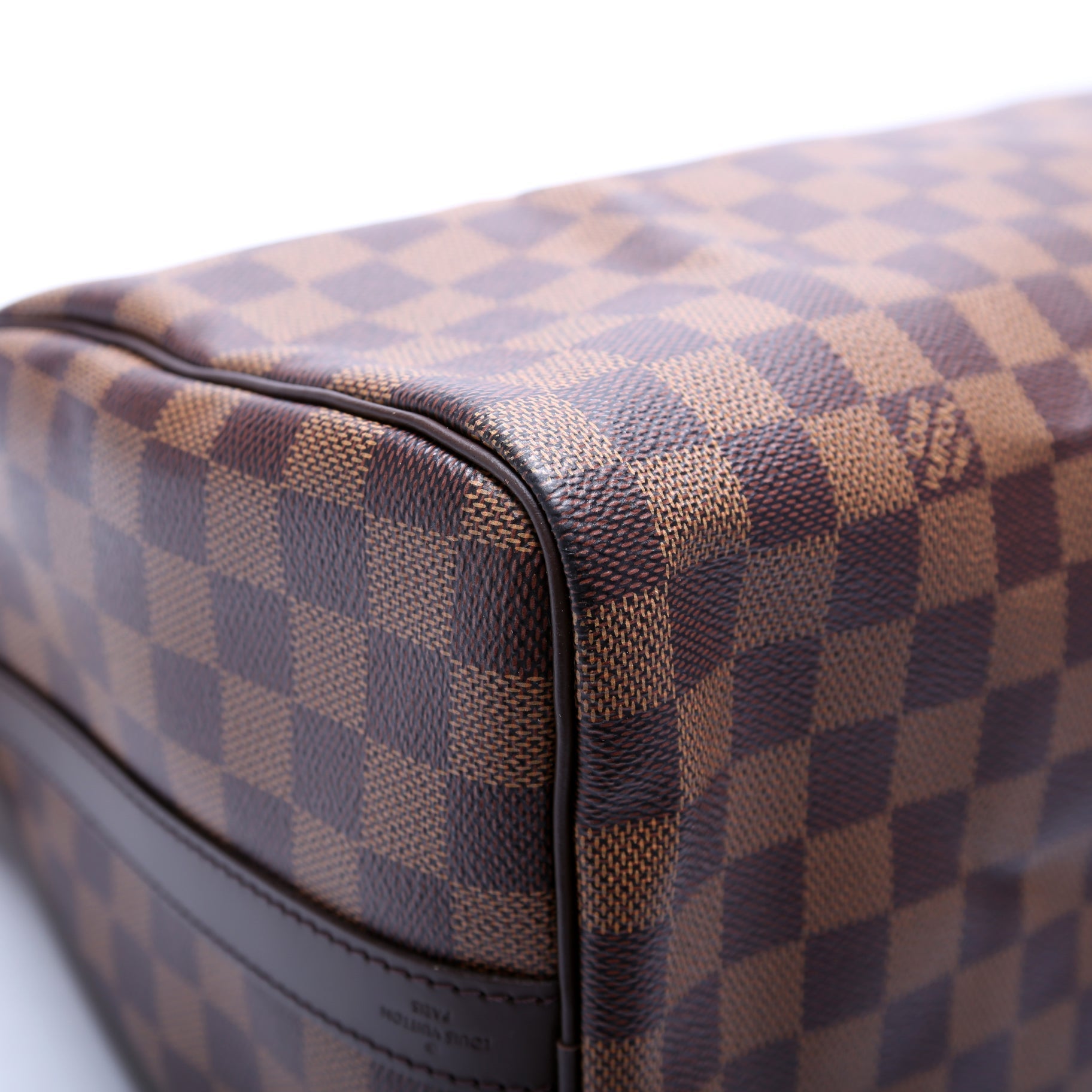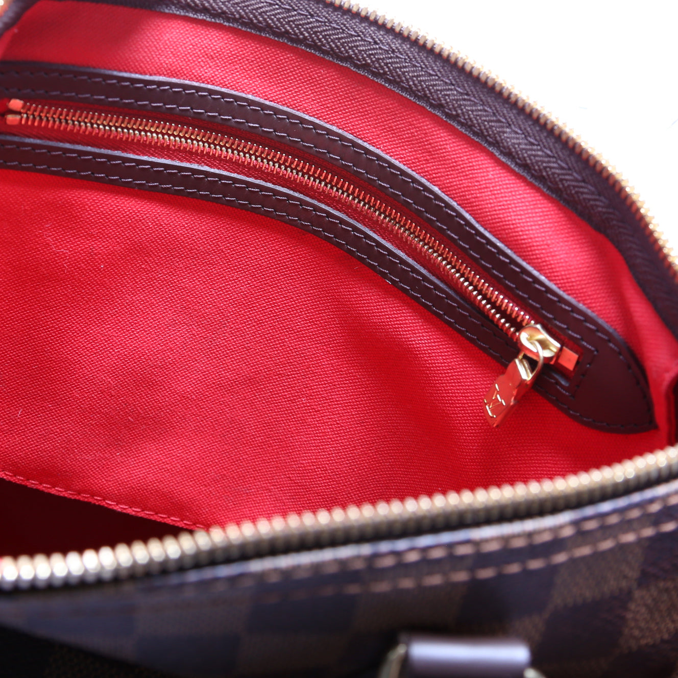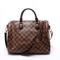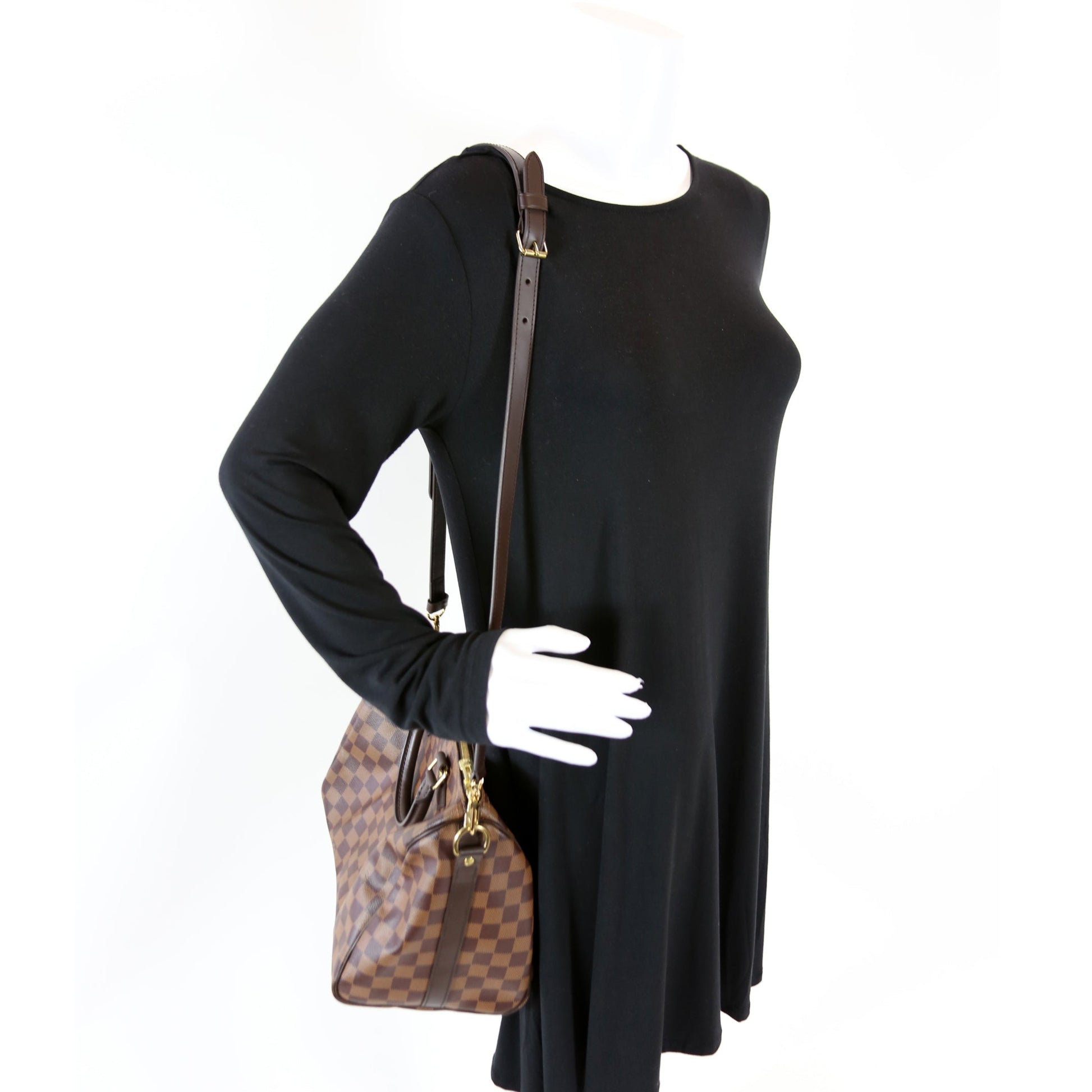 This Louis Vuitton Speedy 30 Bandouliereis eye catching bag. The exterior is in the classic Damier Ebene coated canvas.