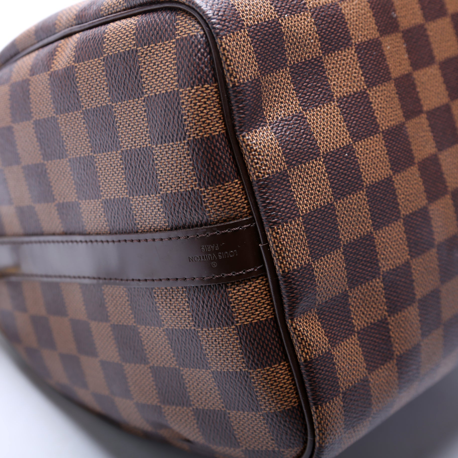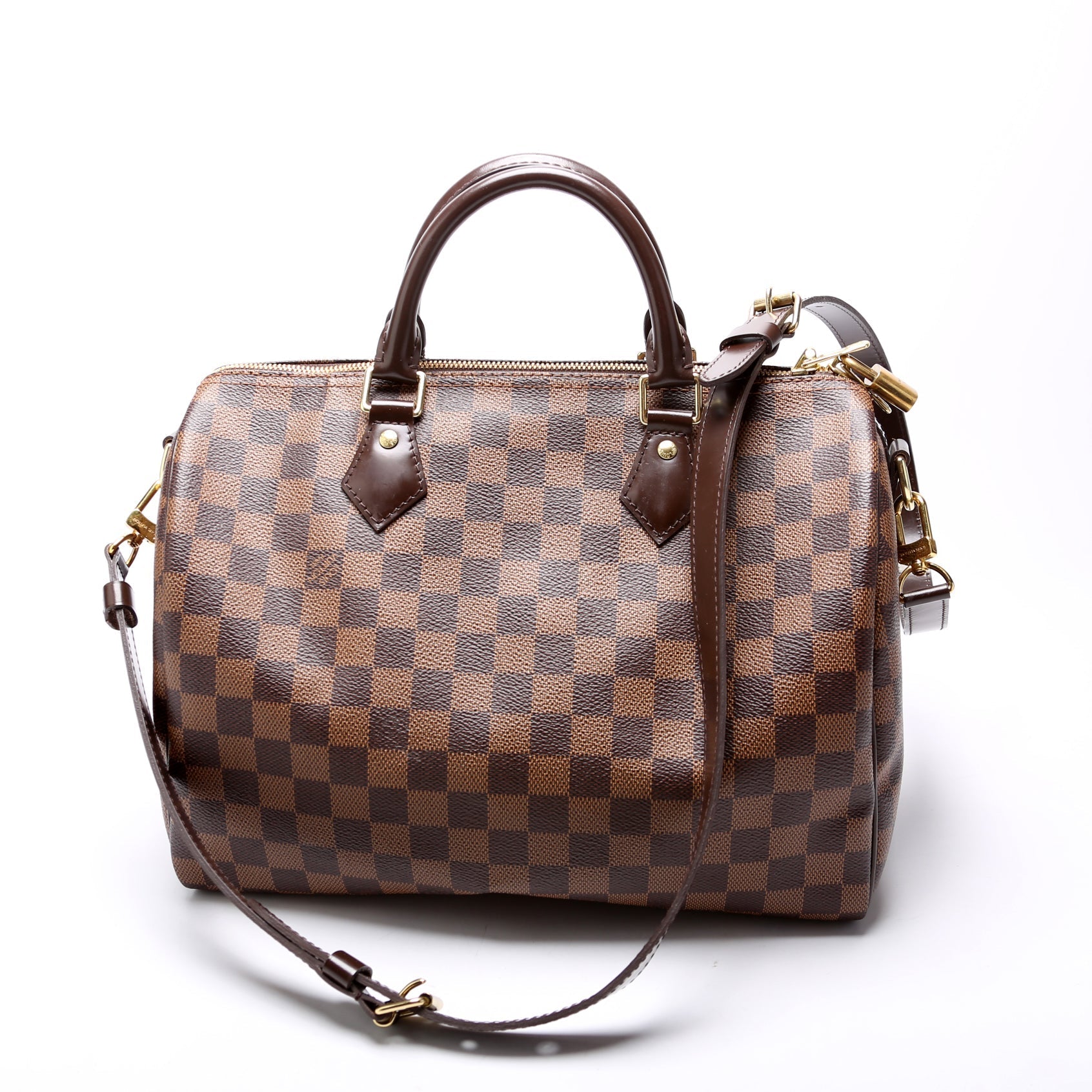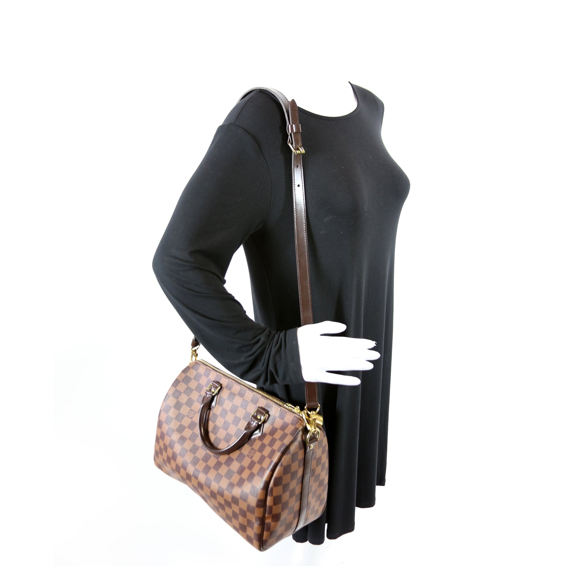 This Louis Vuitton Speedy 30 Bandouliereis eye catching bag. The exterior is in the classic Damier Ebene coated canvas.