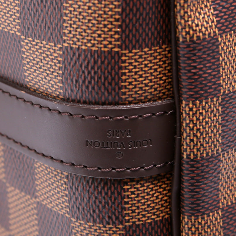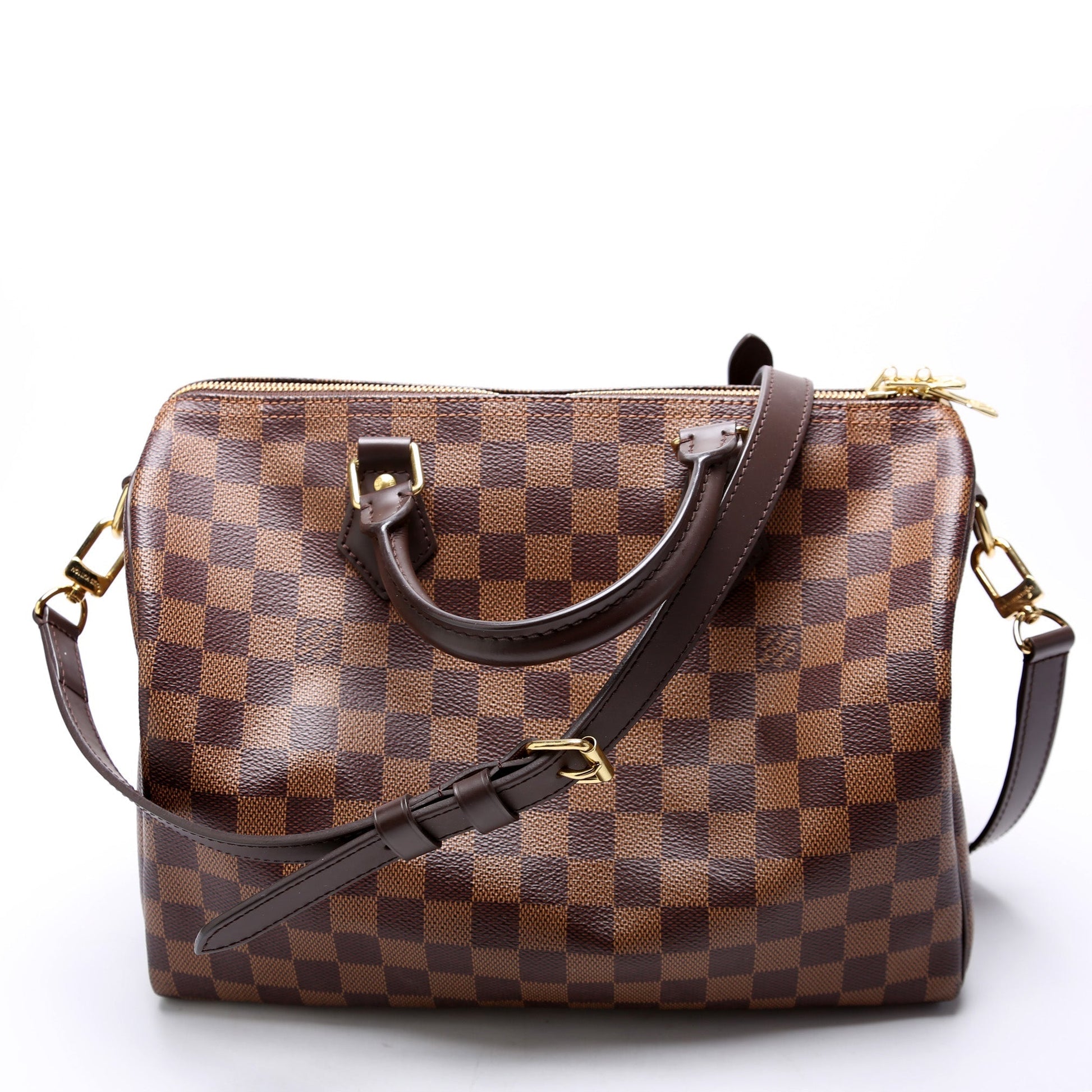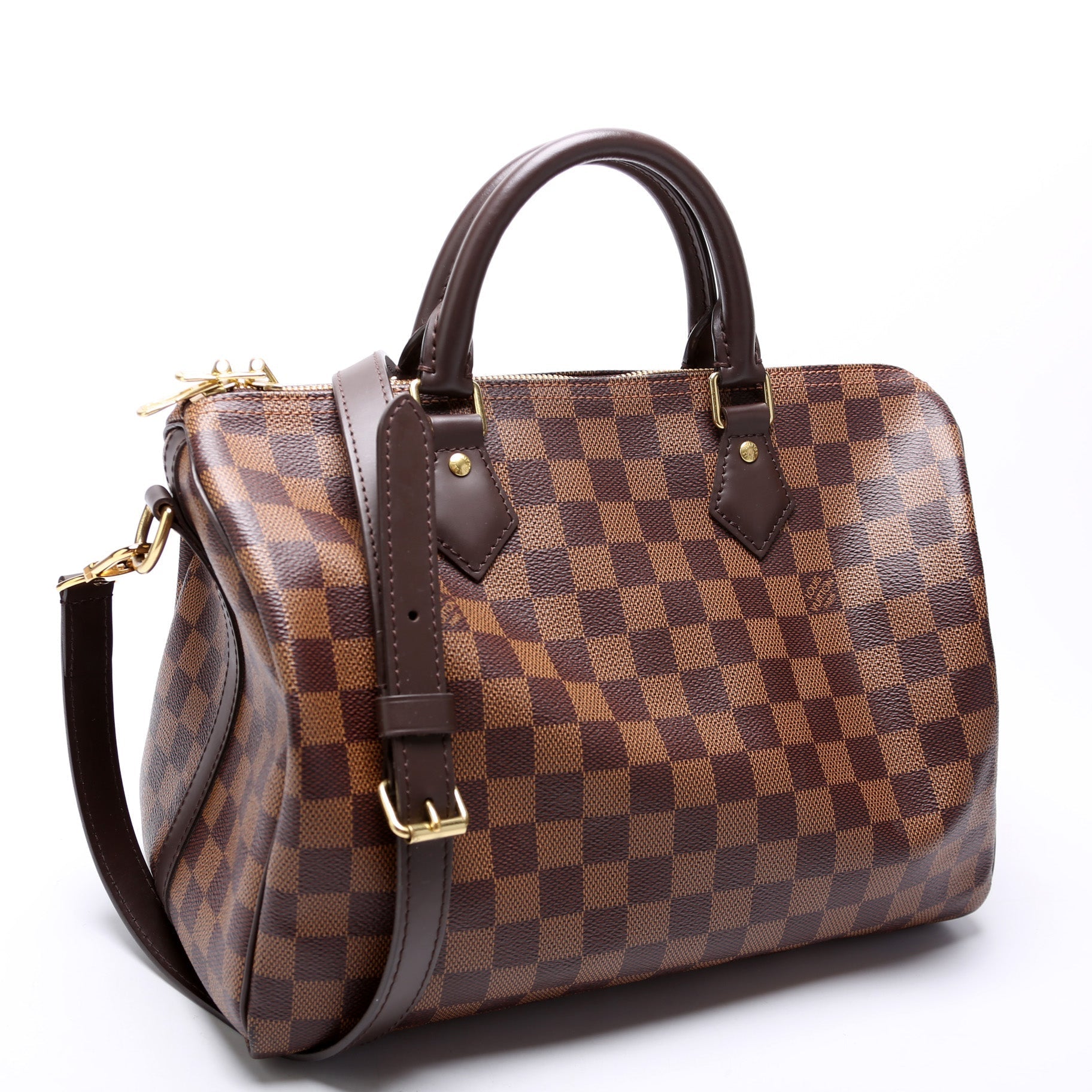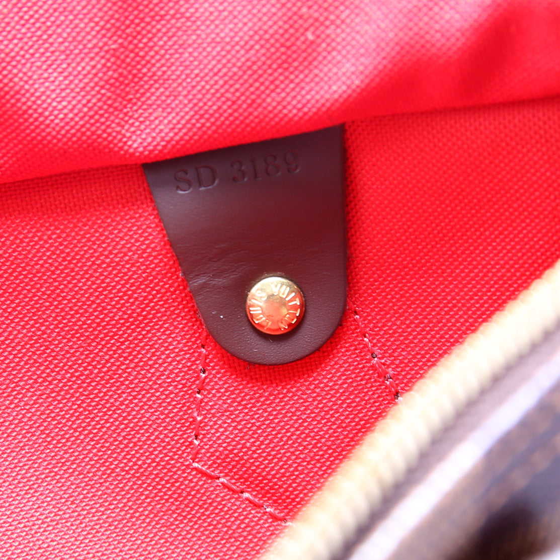 This Louis Vuitton Speedy 30is eye catching bag. The exterior is in the classic Louis Vuitton Damier Ebene coated canvas.