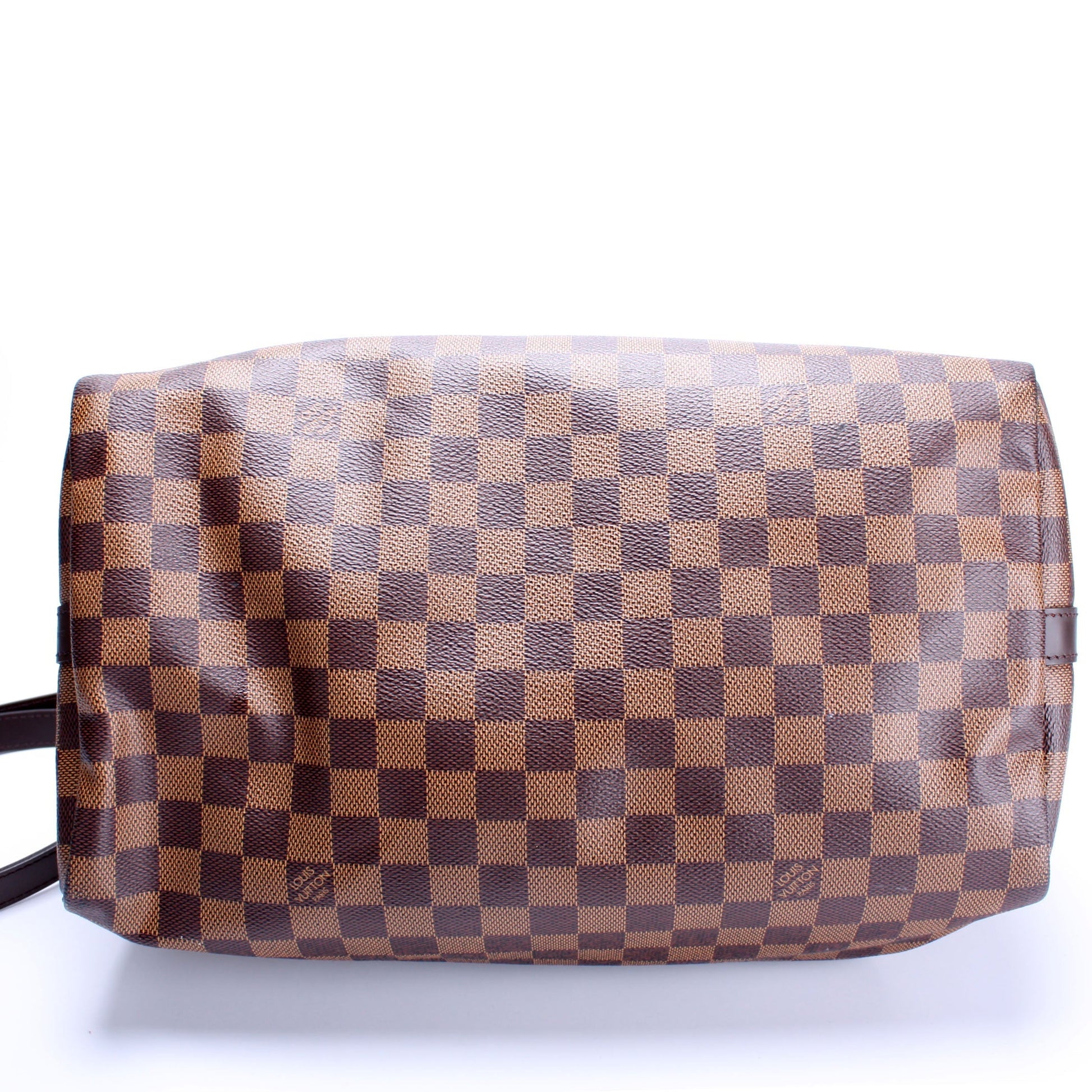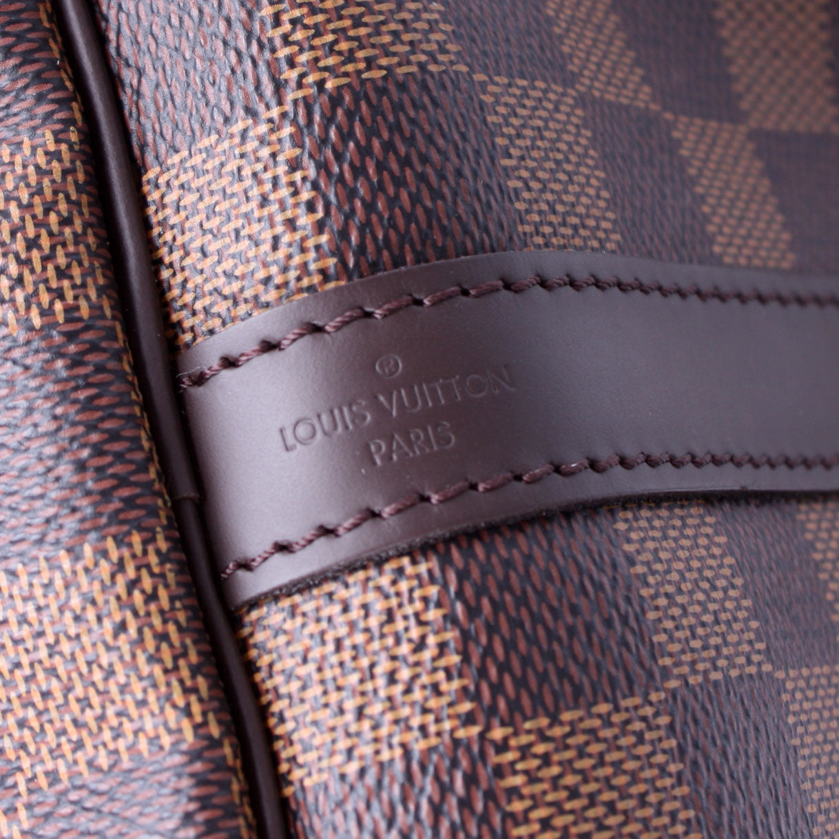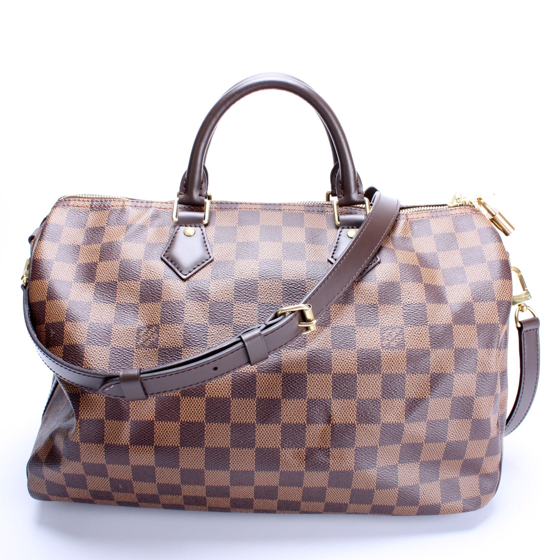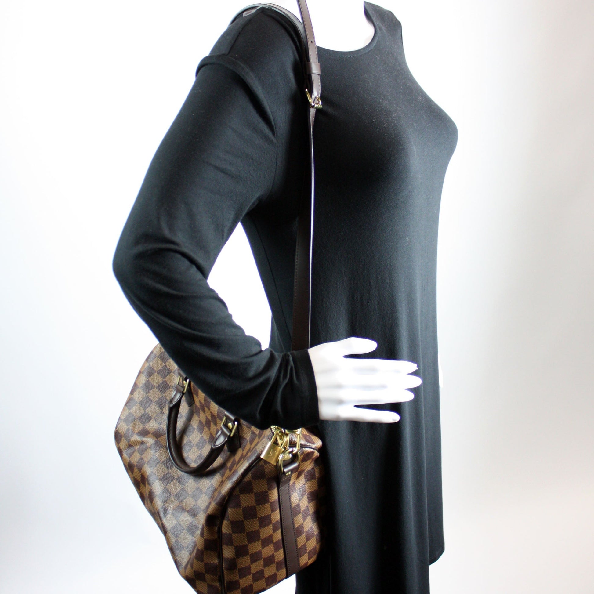 This Louis Vuitton Speedy 30 Bandouliereis eye catching bag. The exterior is in the classic Damier Ebene coated canvas.