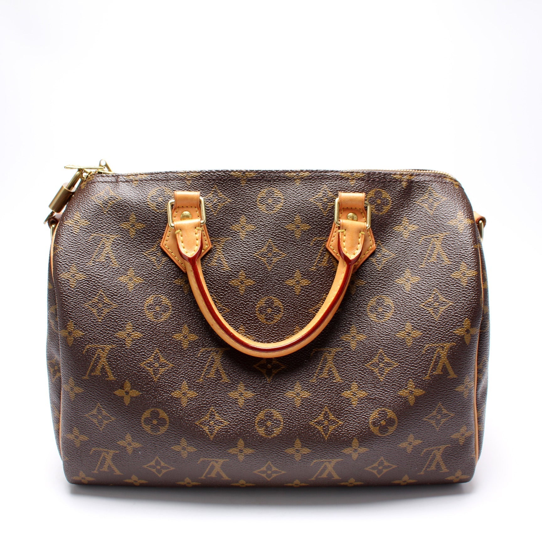 This Louis Vuitton Speedy 30 Bandouliereis eye catching bag. The exterior is in the classic Monogram coated canvas.