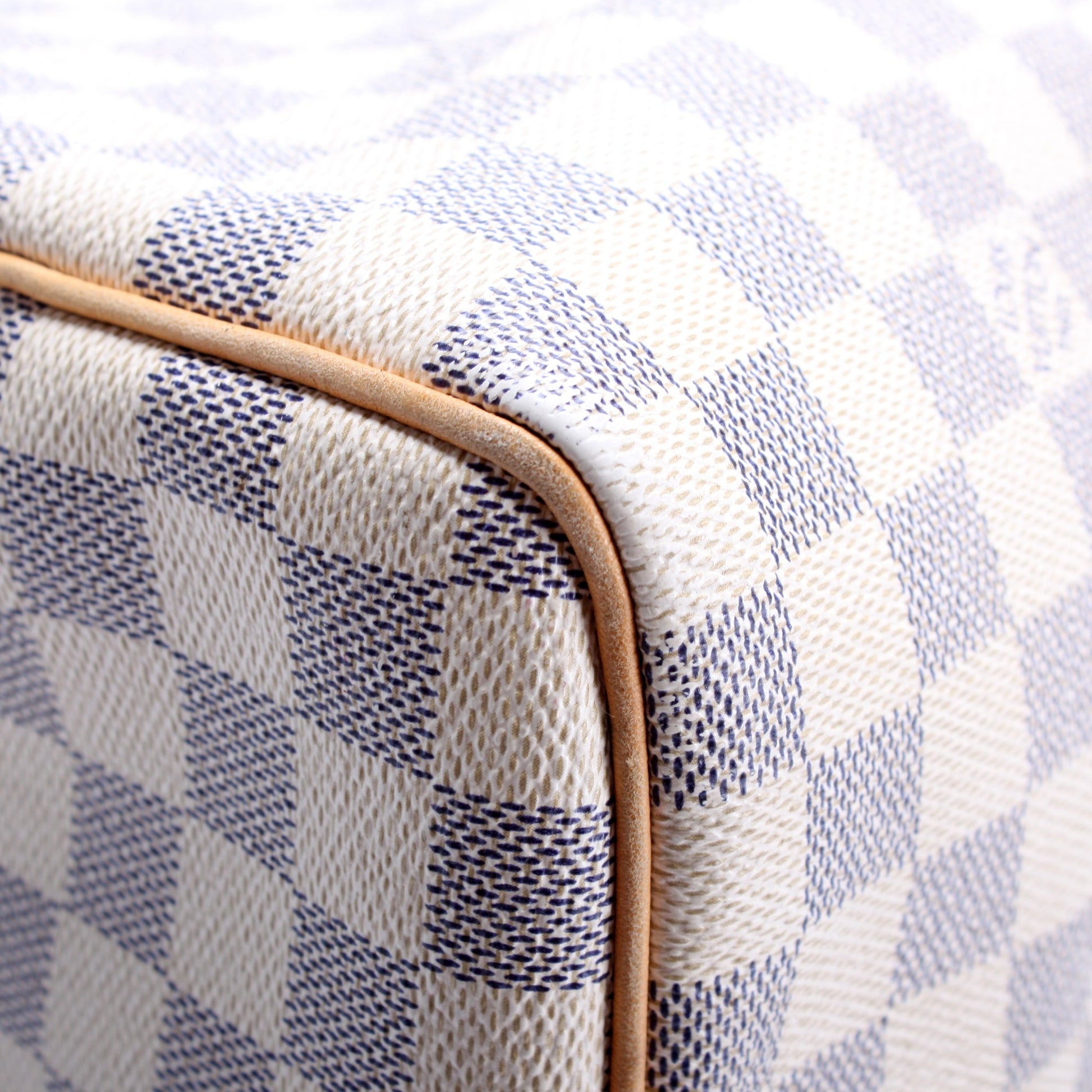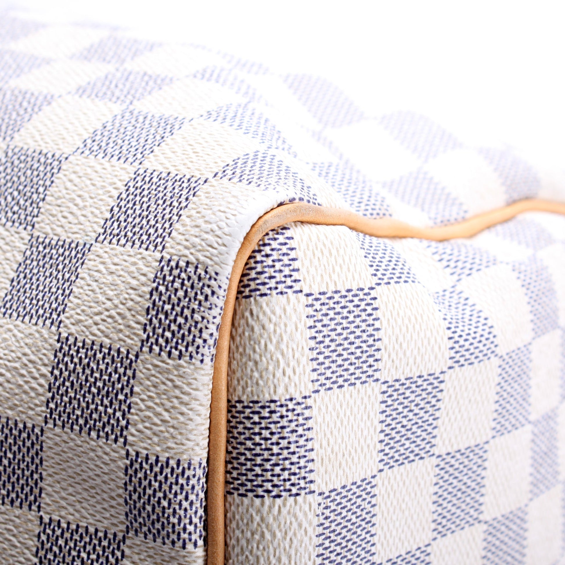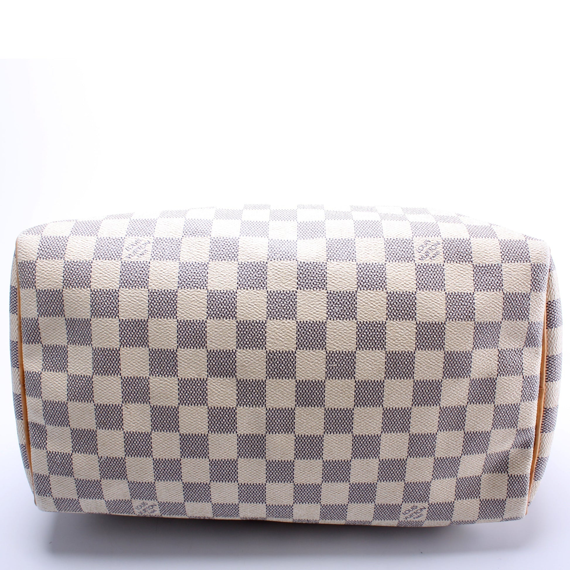 This Louis Vuitton Speedy 30is eye catching bag. The exterior is in the classic Damier Azur coated canvas.