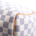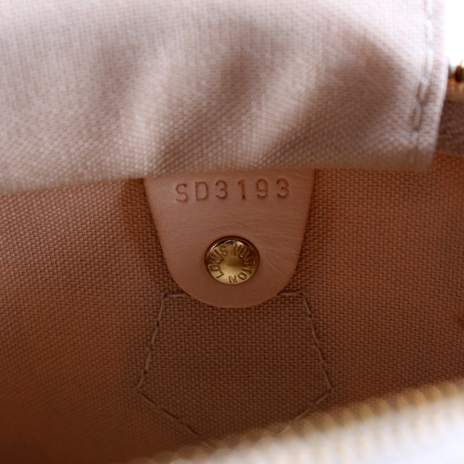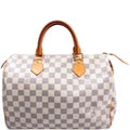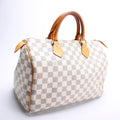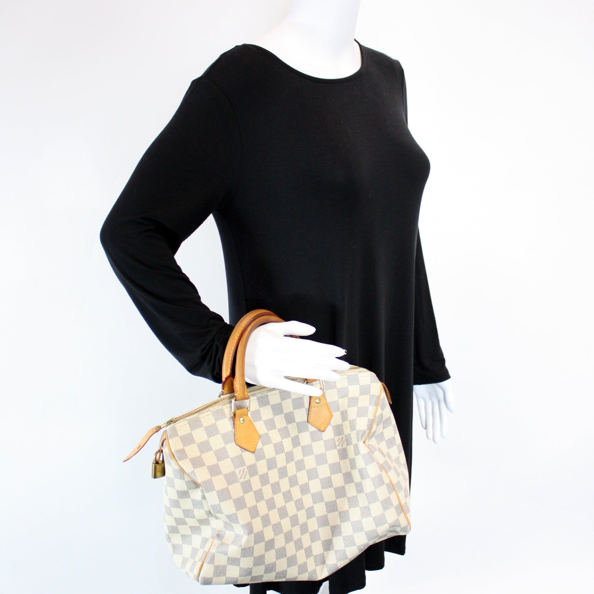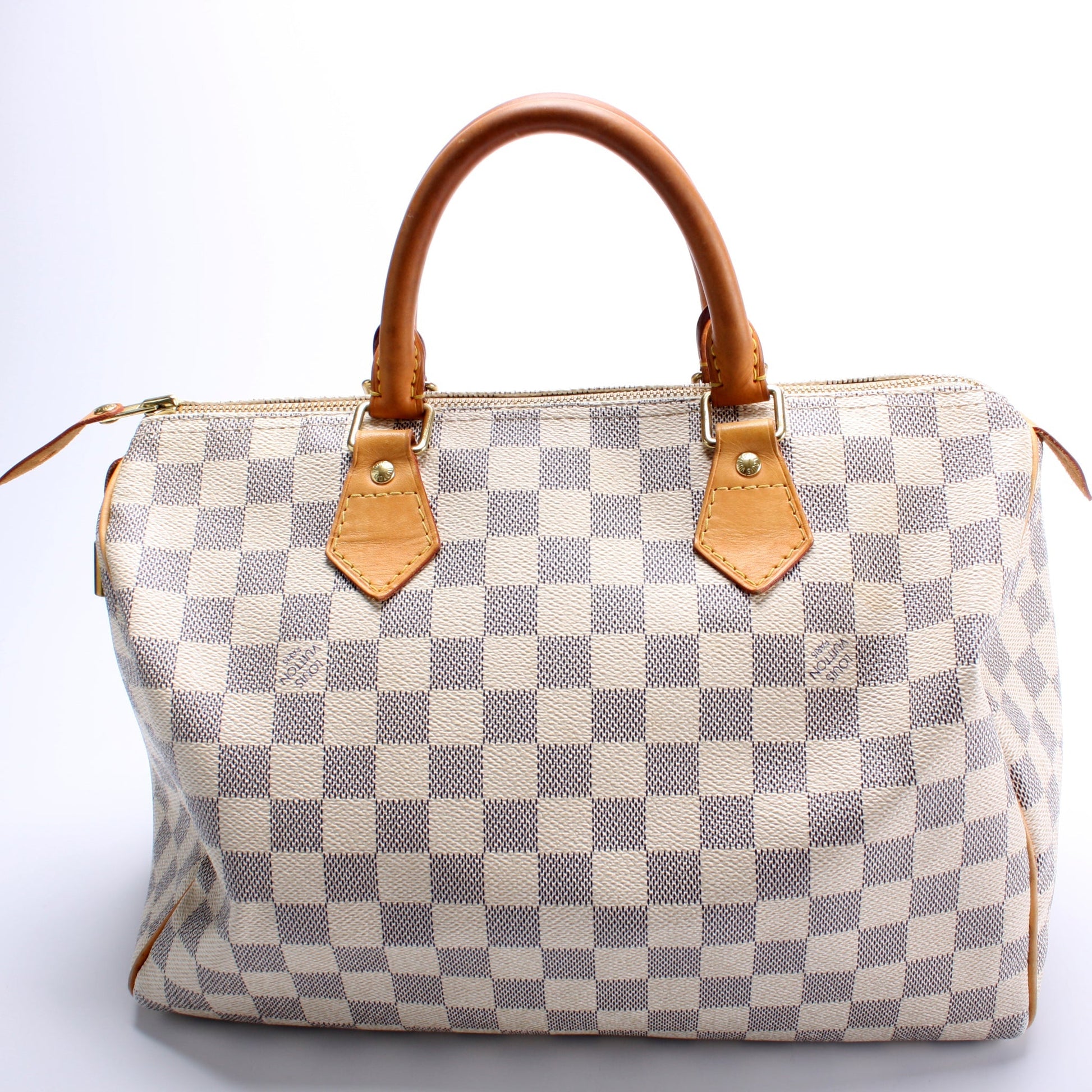 This Louis Vuitton Speedy 30is eye catching bag. The exterior is in the classic Damier Azur coated canvas.
