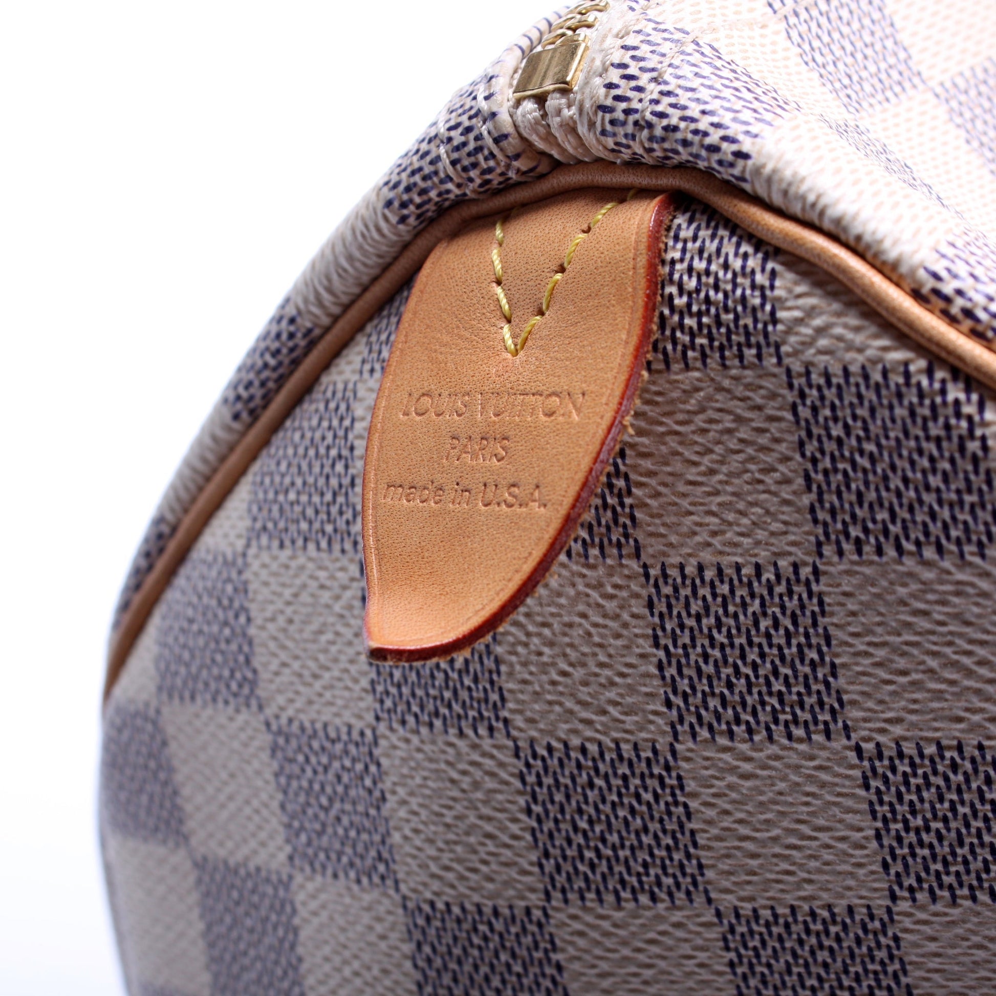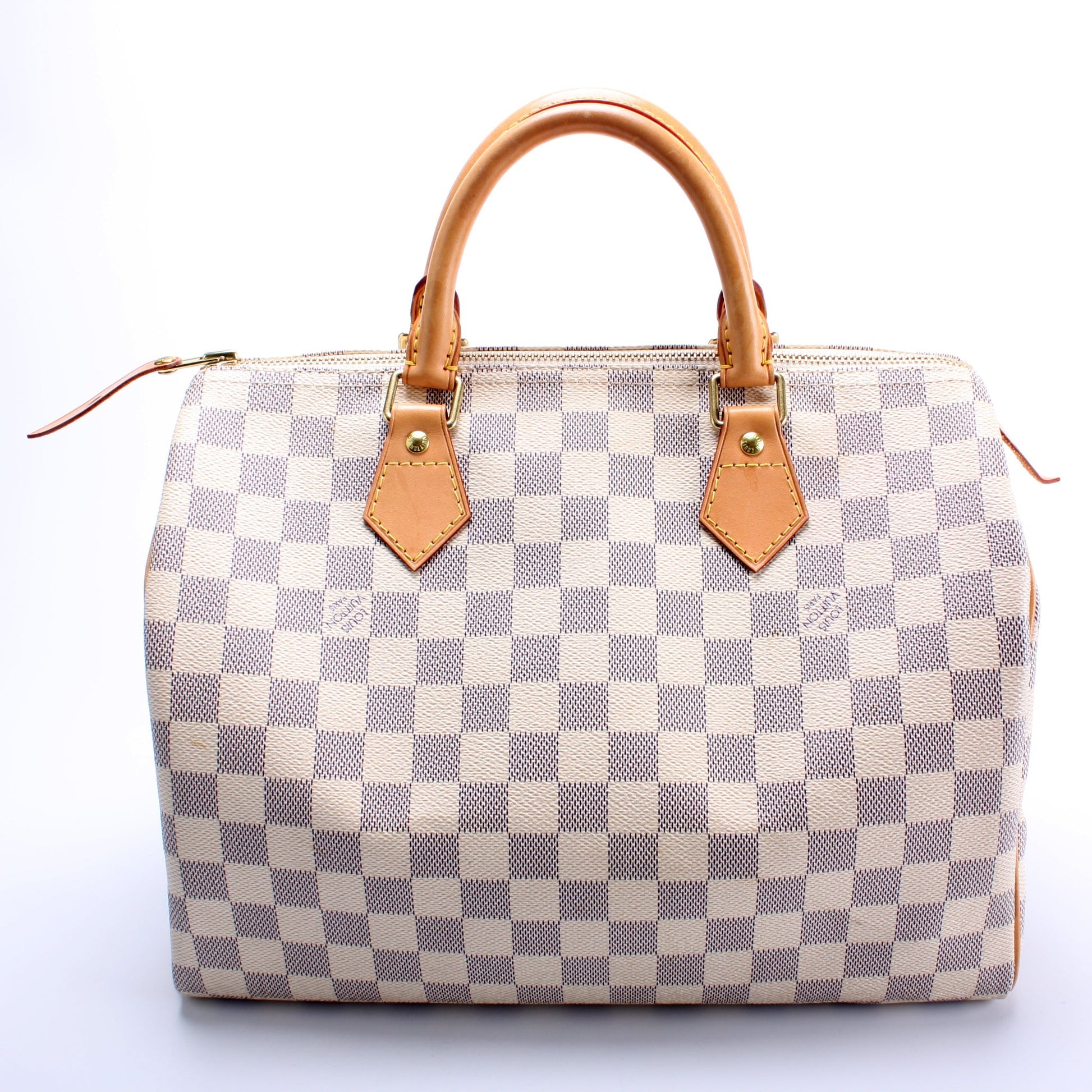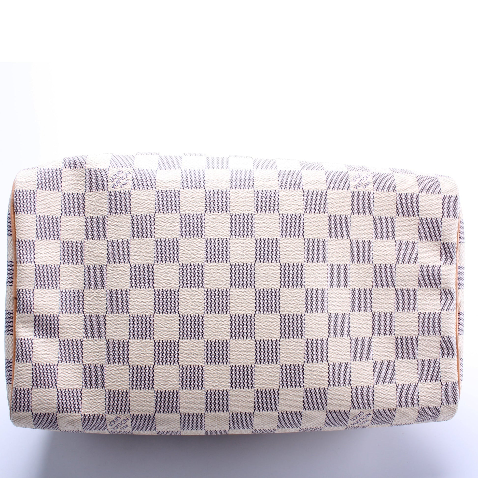 This Louis Vuitton Speedy 30is eye catching bag. The exterior is in the classic Louis Vuitton Damier Azur coated canvas.