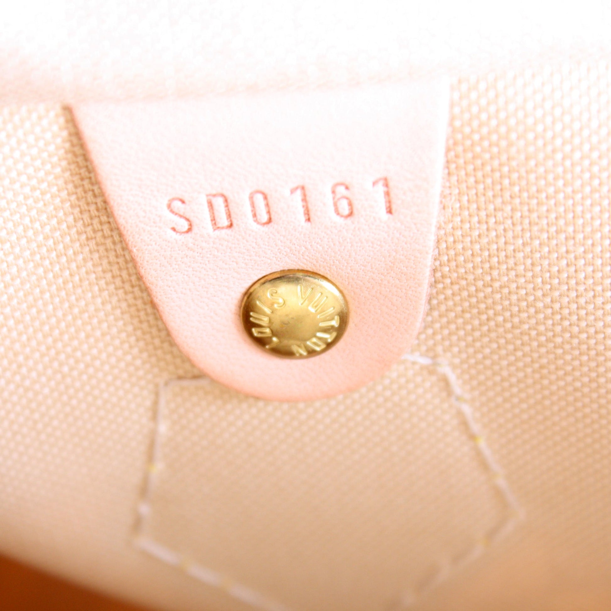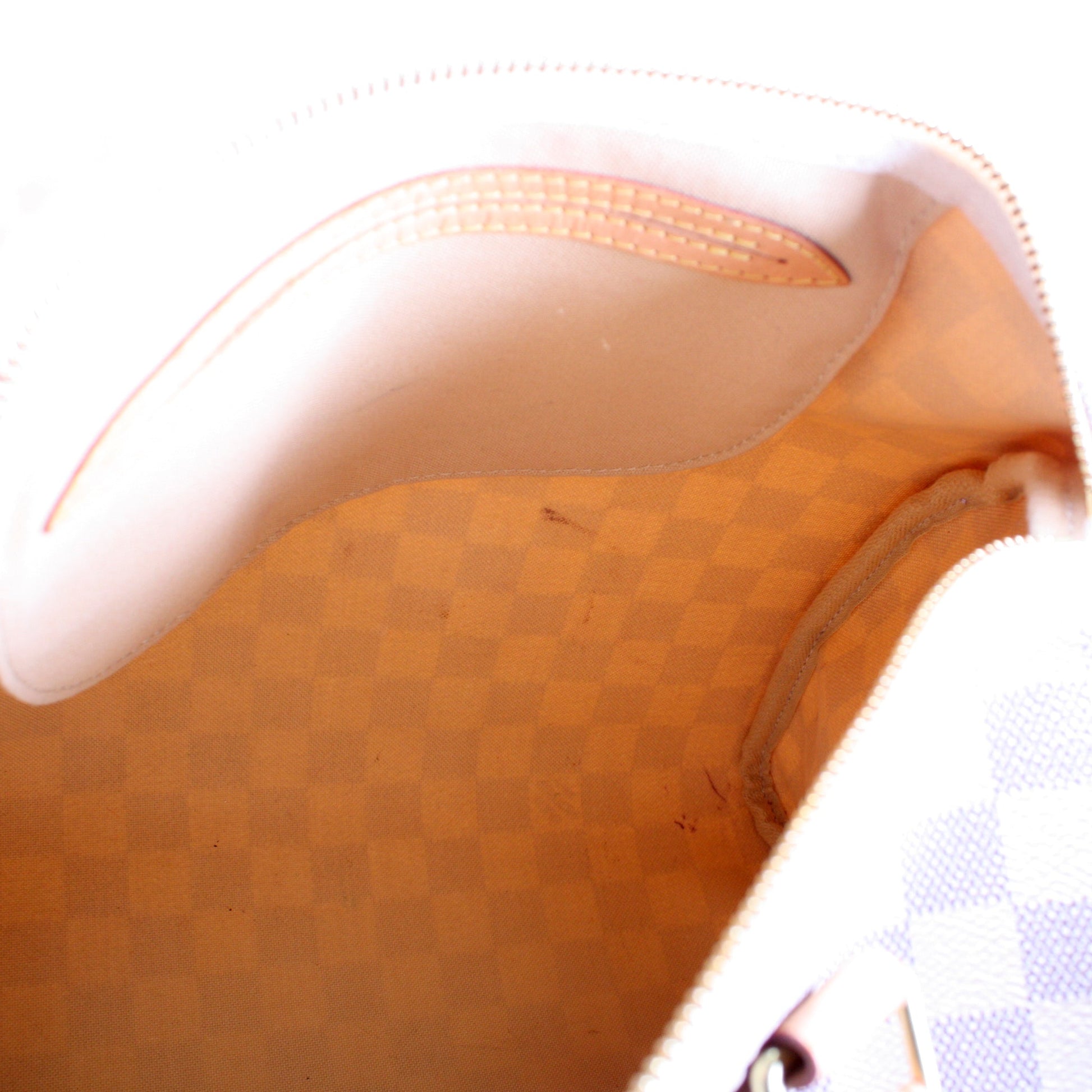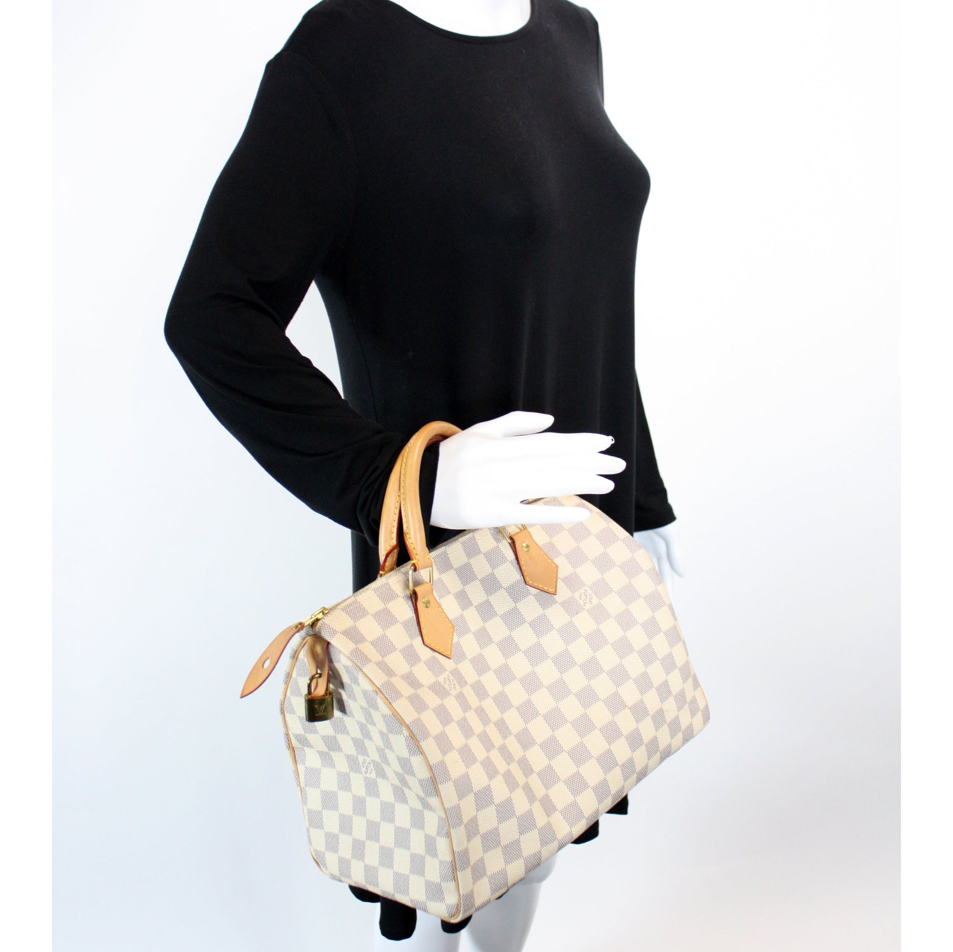 This Louis Vuitton Speedy 30is eye catching bag. The exterior is in the classic Louis Vuitton Damier Azur coated canvas.