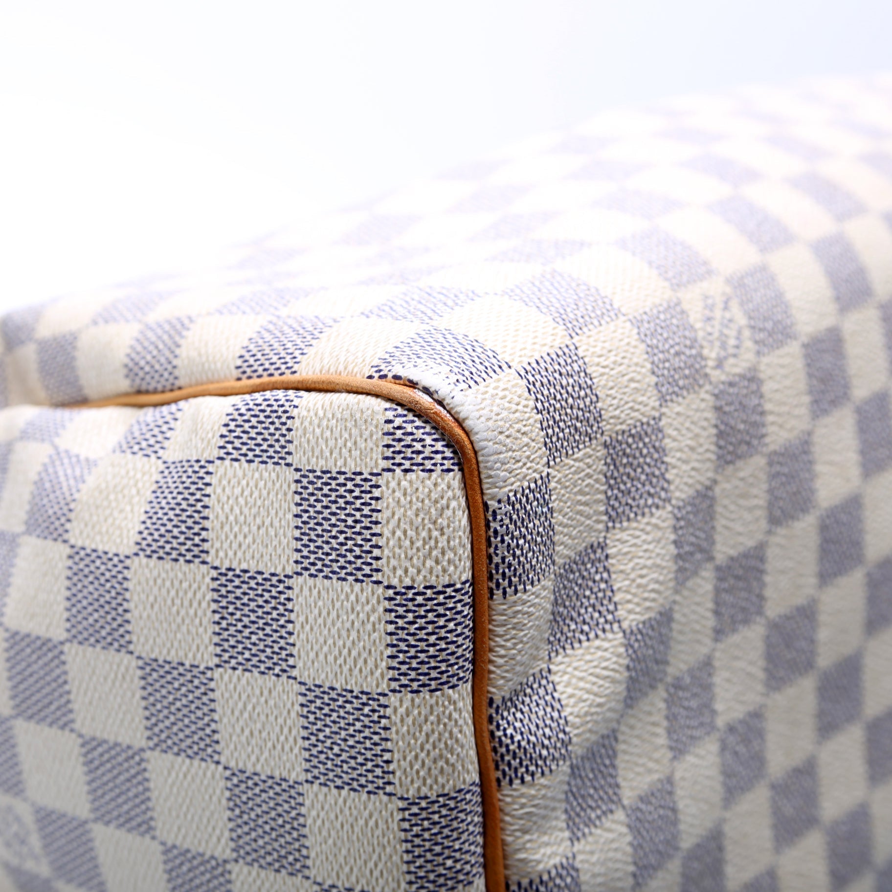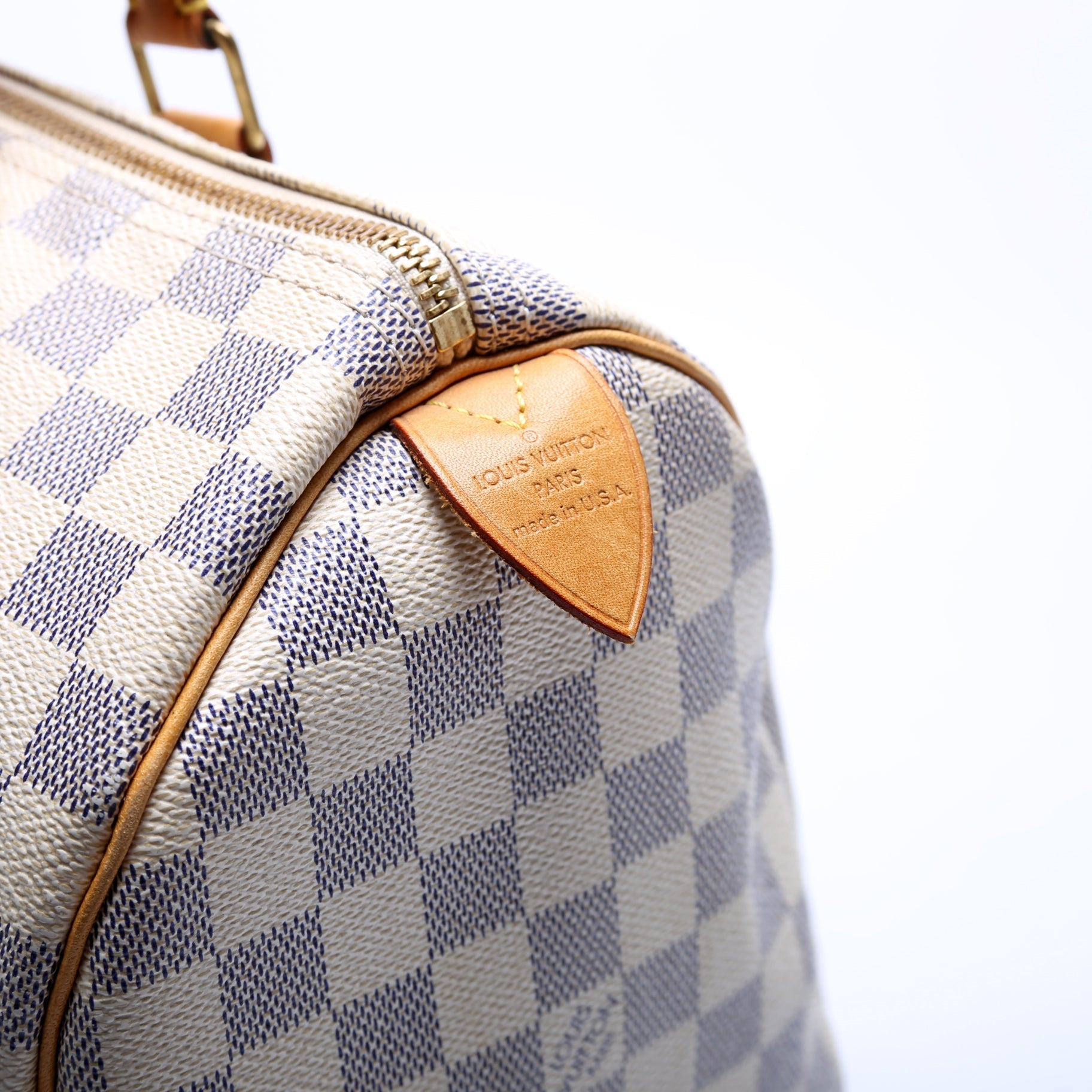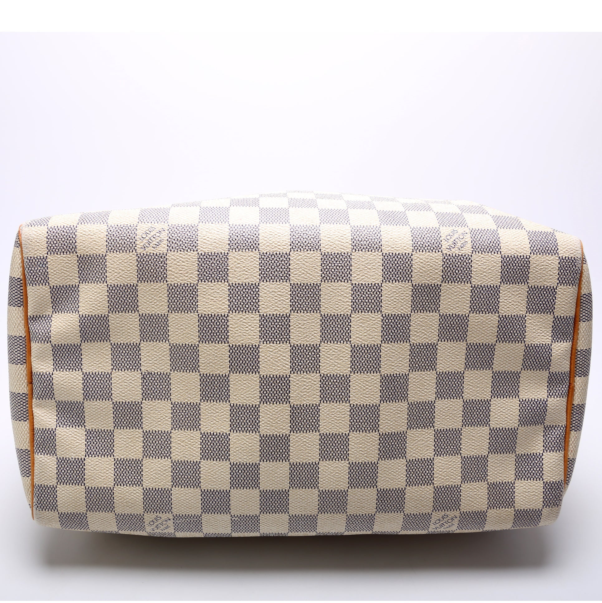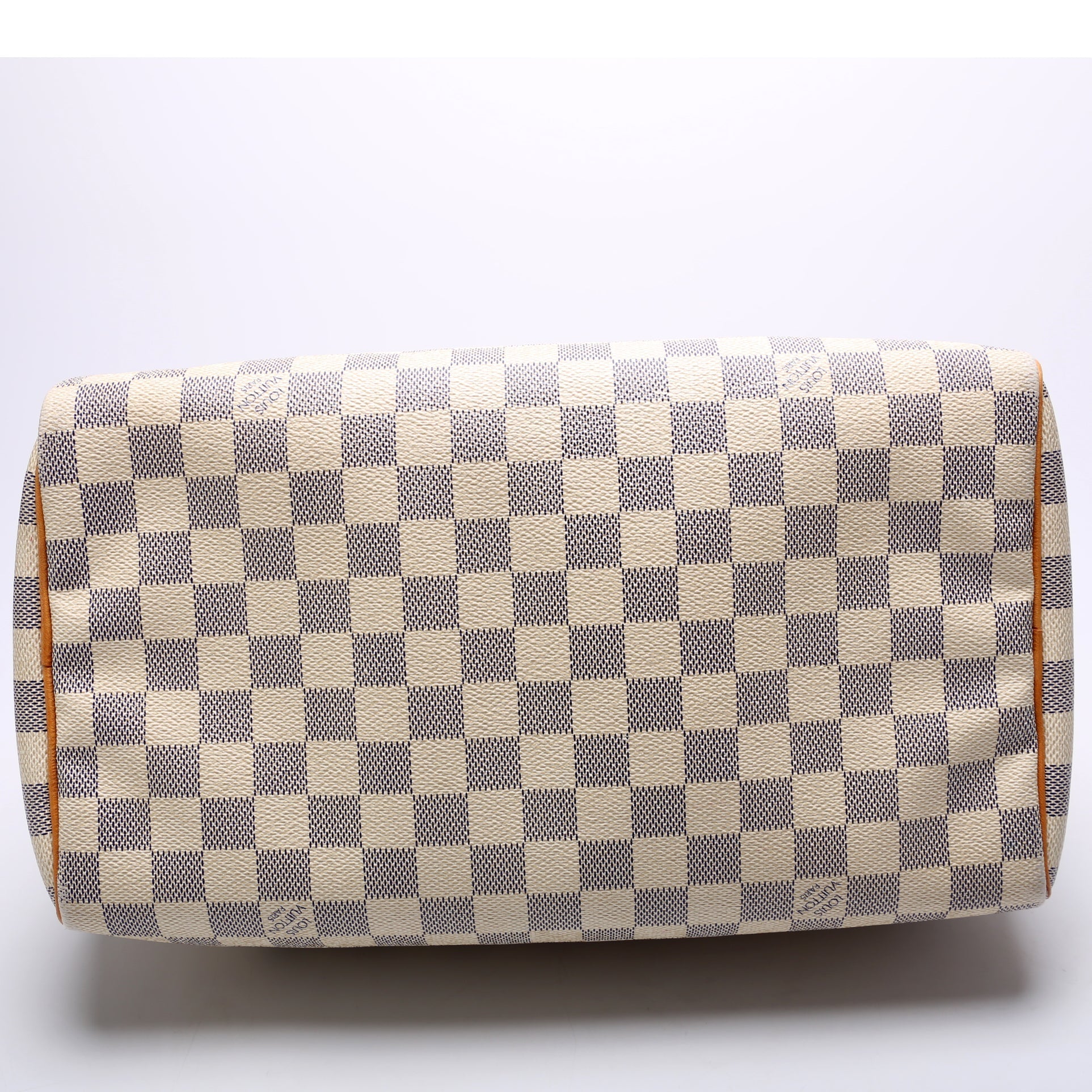 This Louis Vuitton Speedy 30is eye catching bag. The exterior is in the classic Louis Vuitton Damier Azur coated canvas.