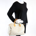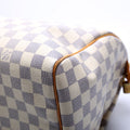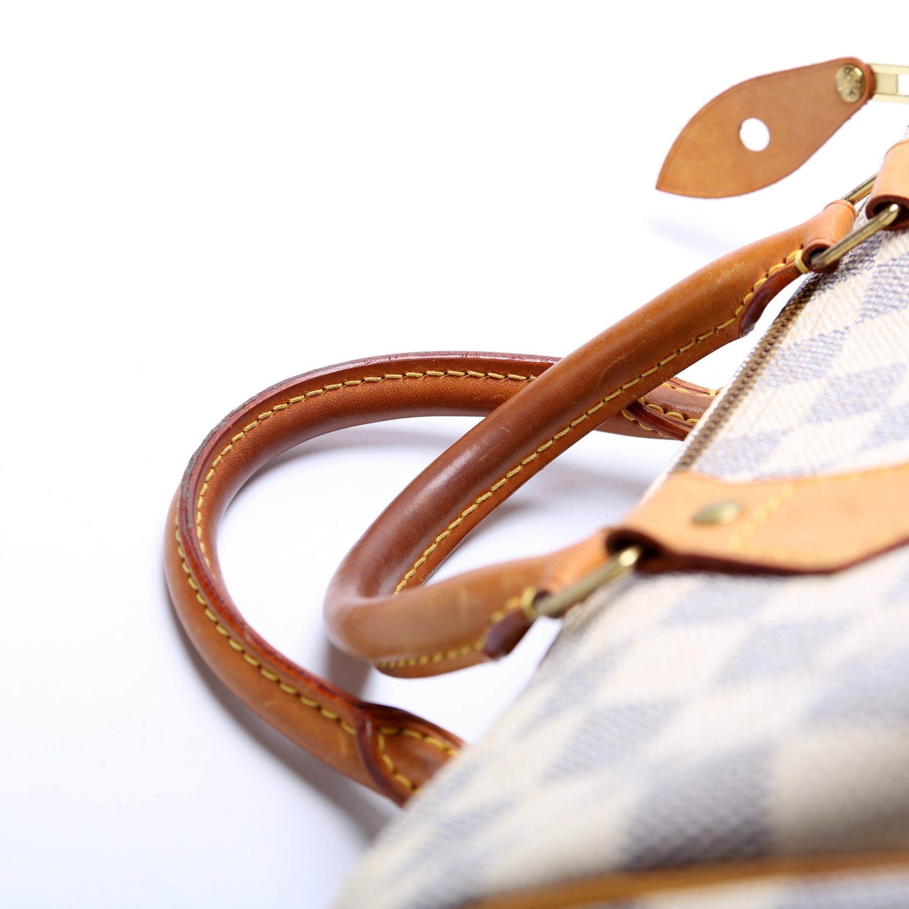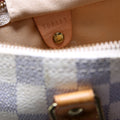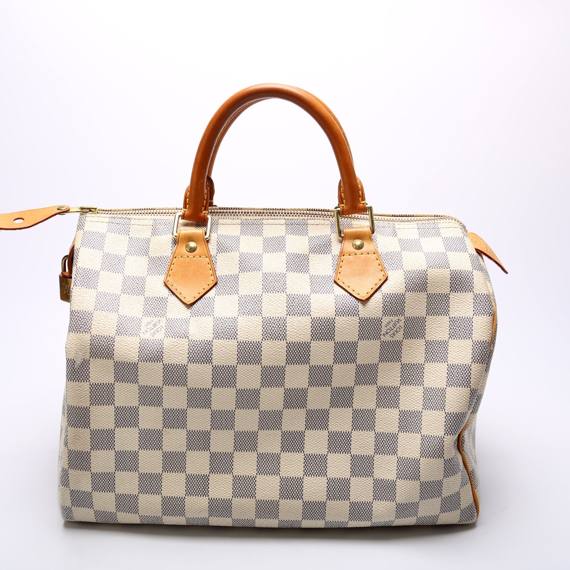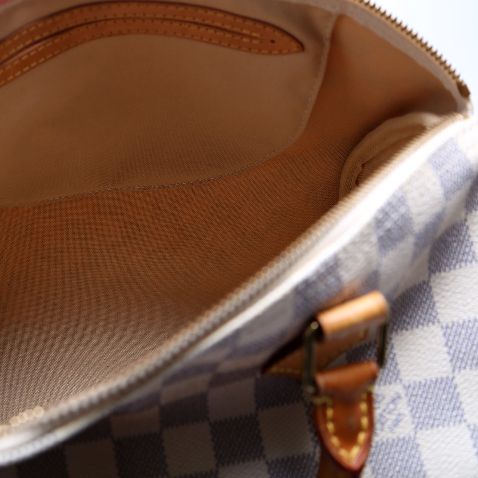 This Louis Vuitton Speedy 30is eye catching bag. The exterior is in the classic Louis Vuitton Damier Azur coated canvas.