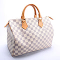 This Louis Vuitton Speedy 30is eye catching bag. The exterior is in the classic Louis Vuitton Damier Azur coated canvas.