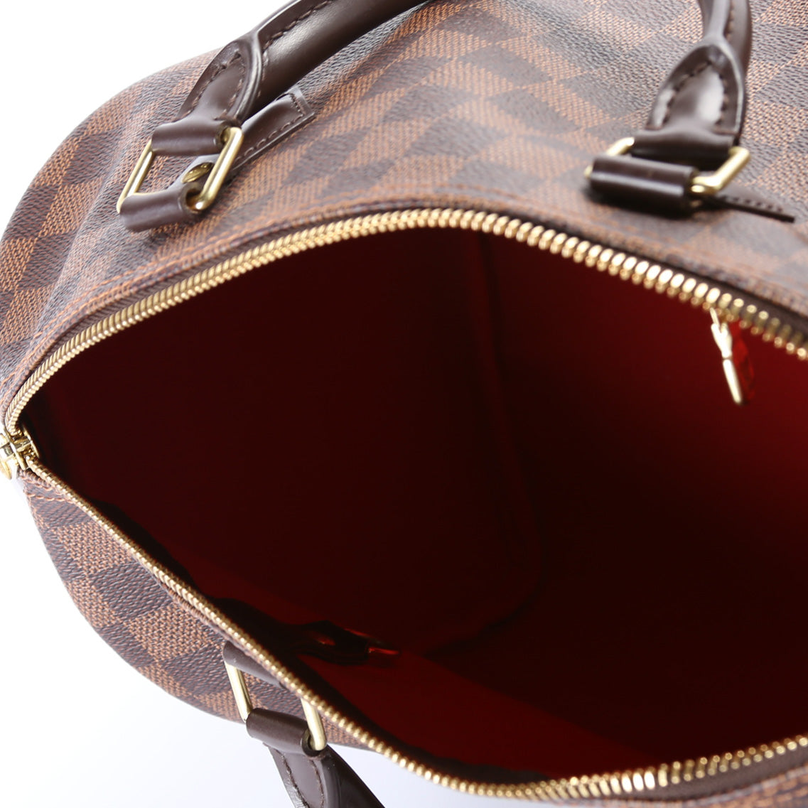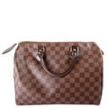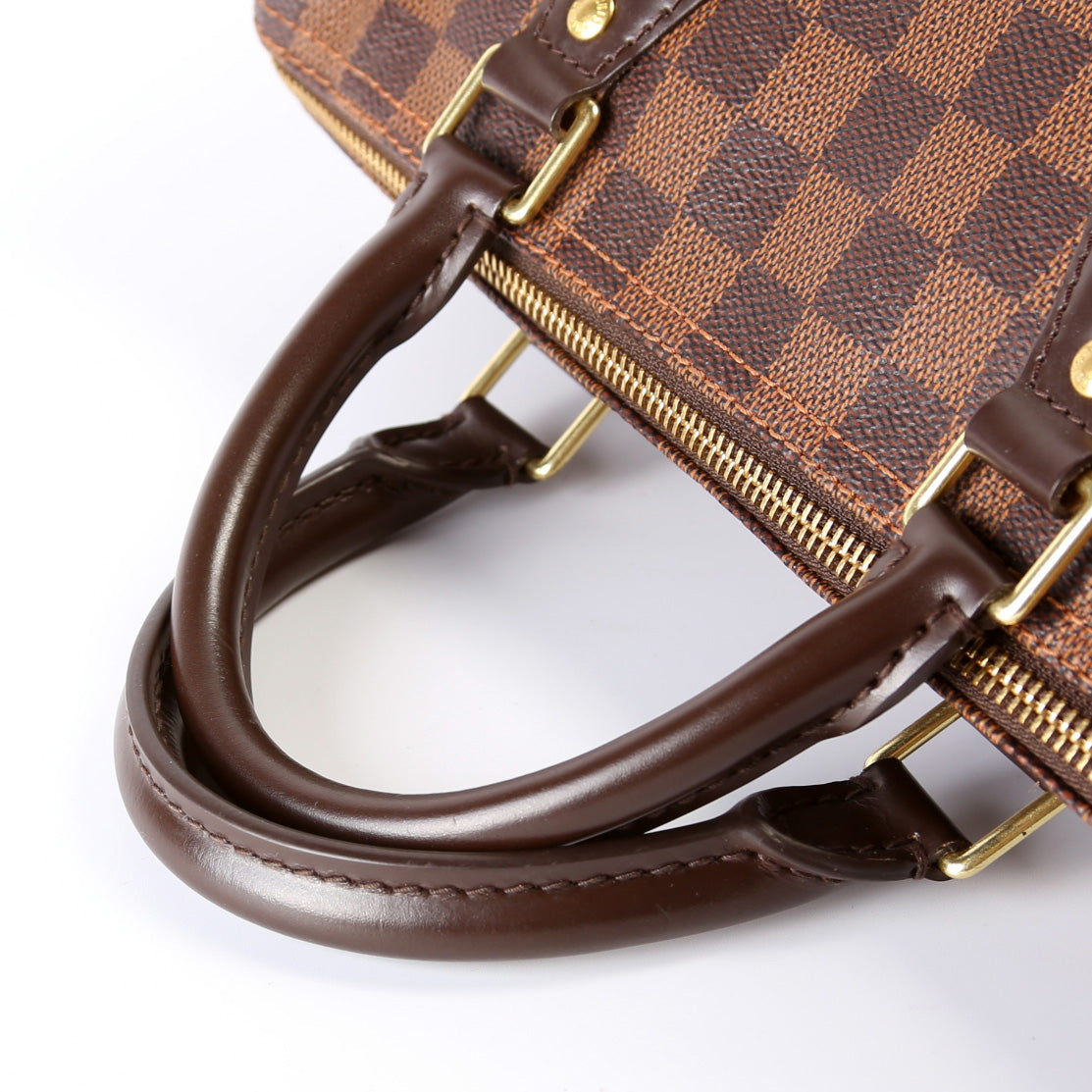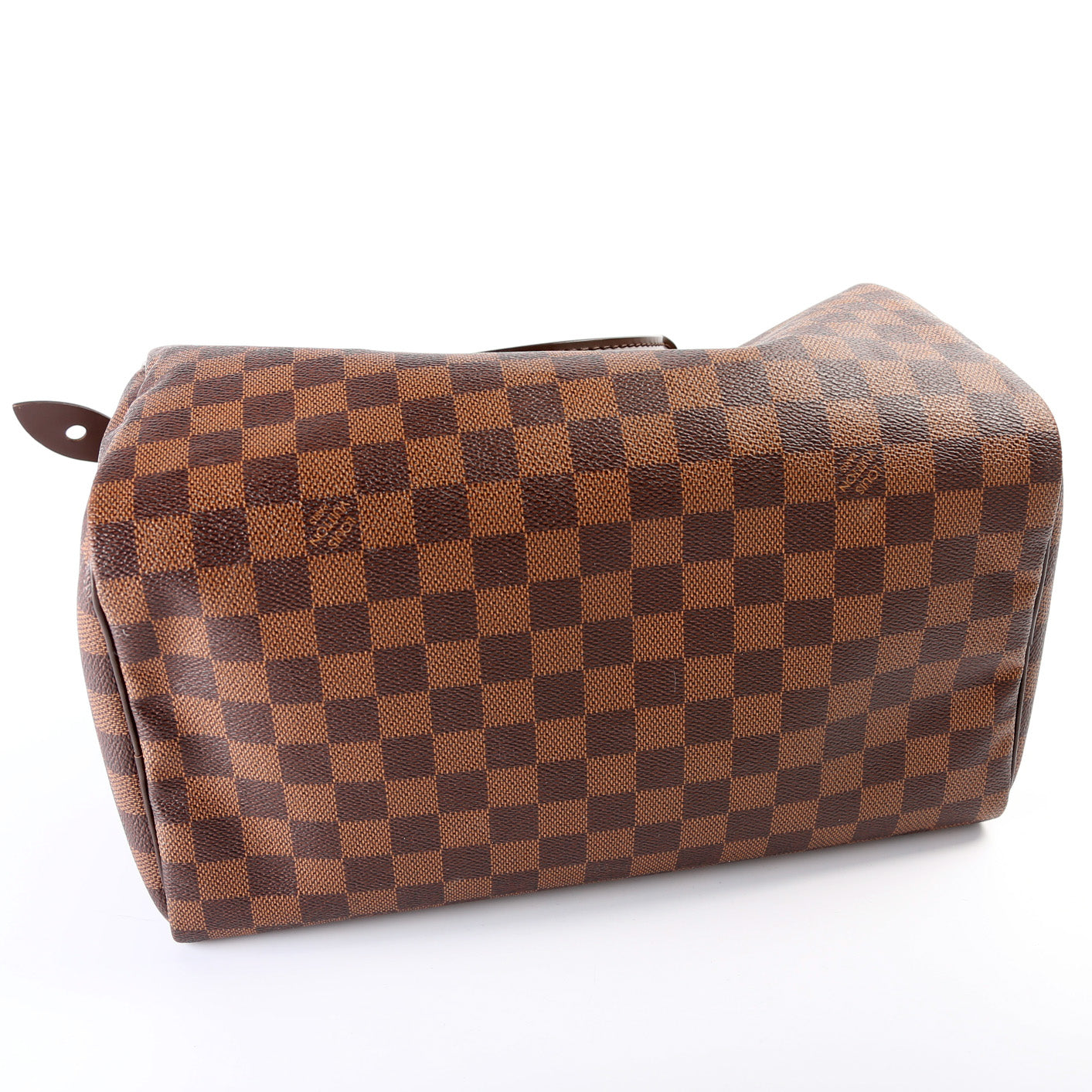 This Louis Vuitton Speedy 30is eye catching bag. The exterior is in the classic Louis Vuitton Damier Ebene coated canvas.