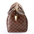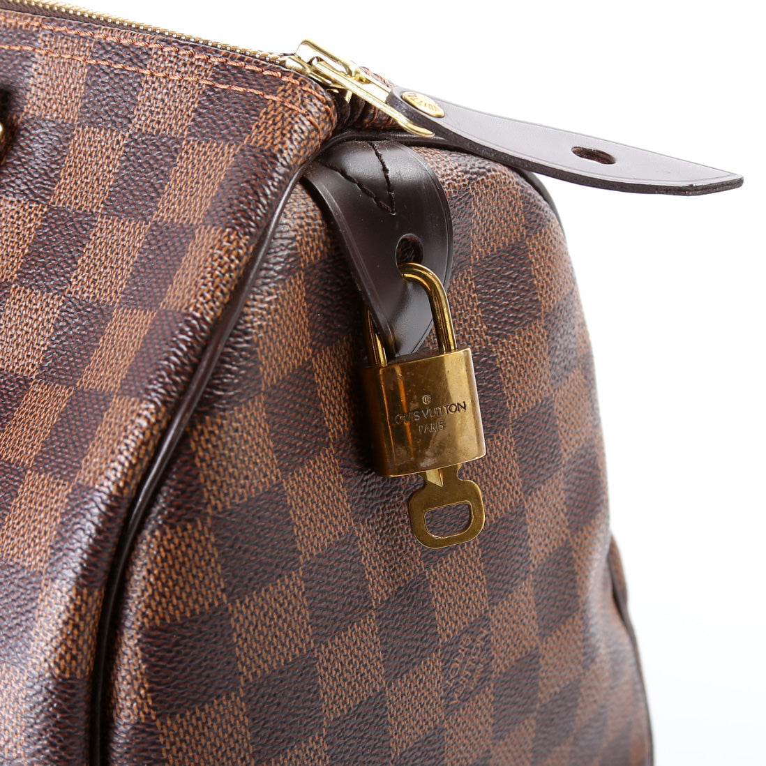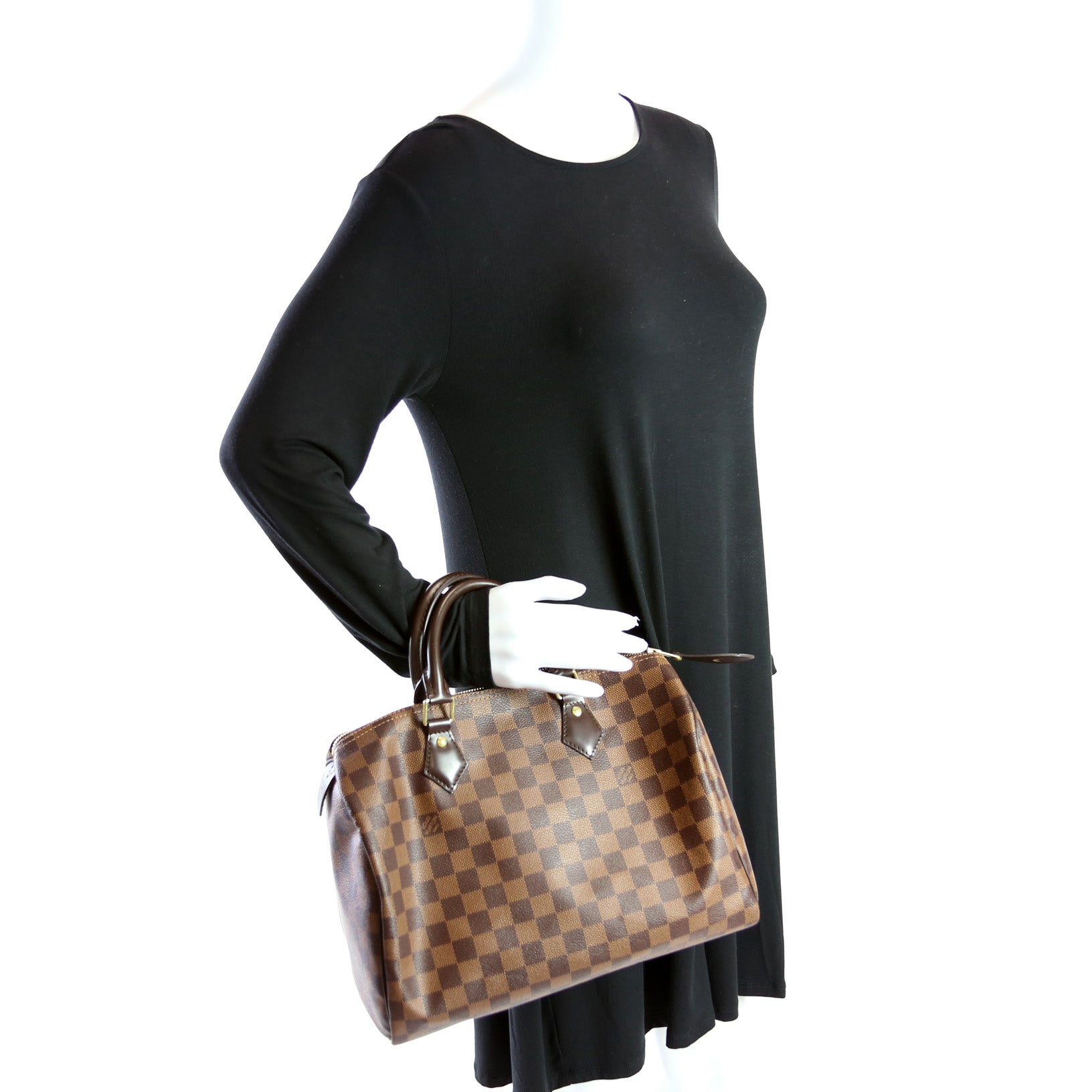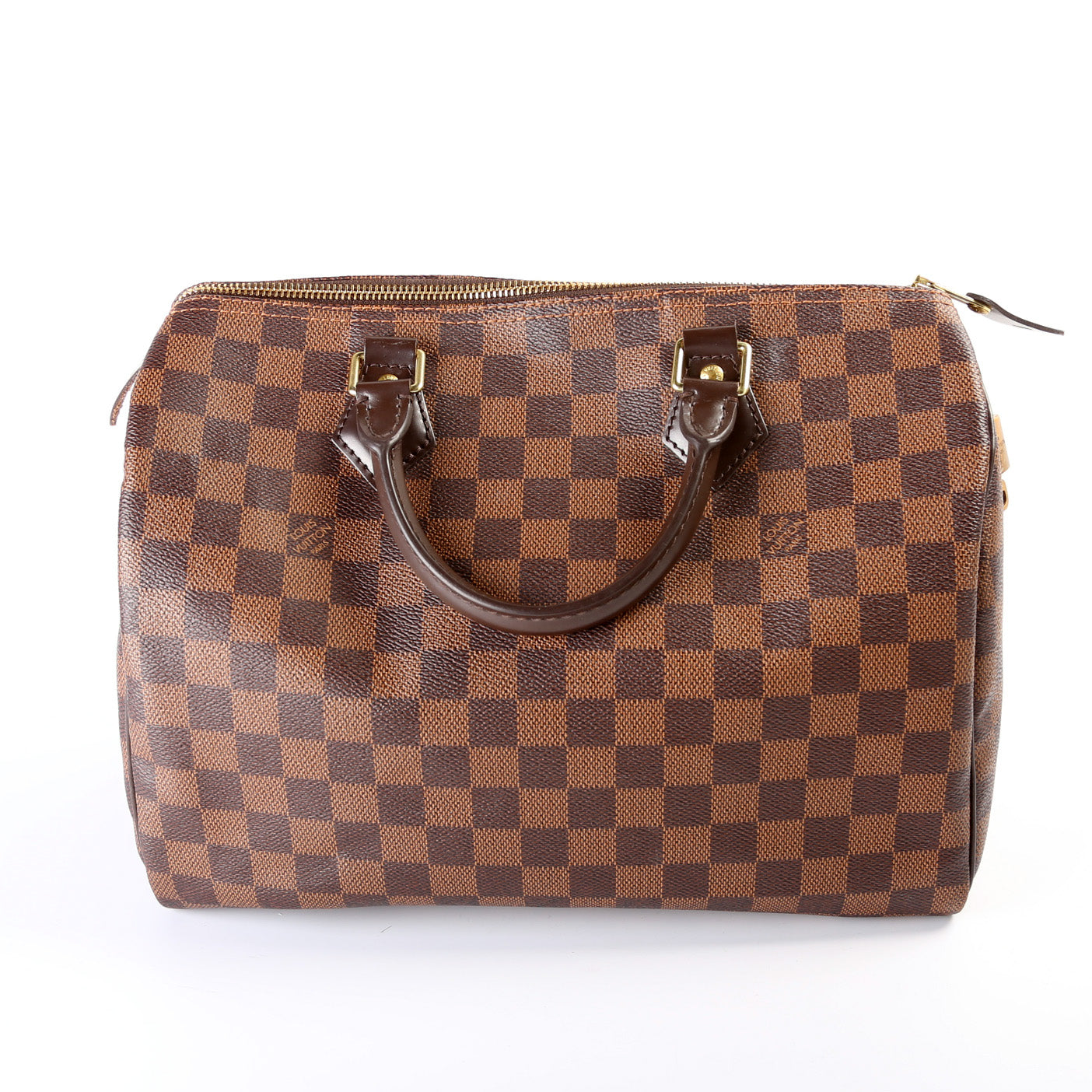 This Louis Vuitton Speedy 30is eye catching bag. The exterior is in the classic Louis Vuitton Damier Ebene coated canvas.