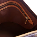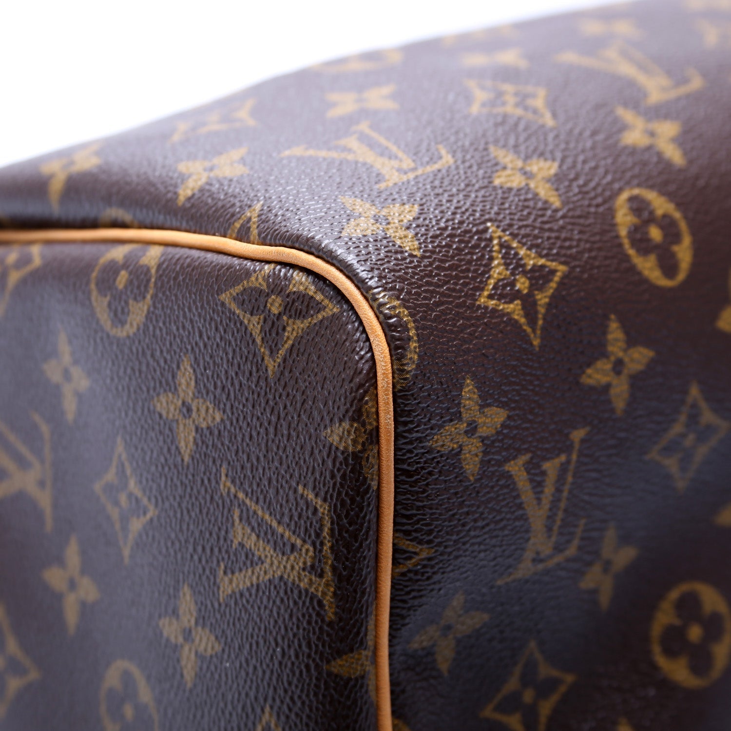 Exterior: The exterior coated canvas is free of any rips or cracks. The leather detail shows minor discoloration. There are minor scuffs in the corners and along the leather piping.