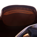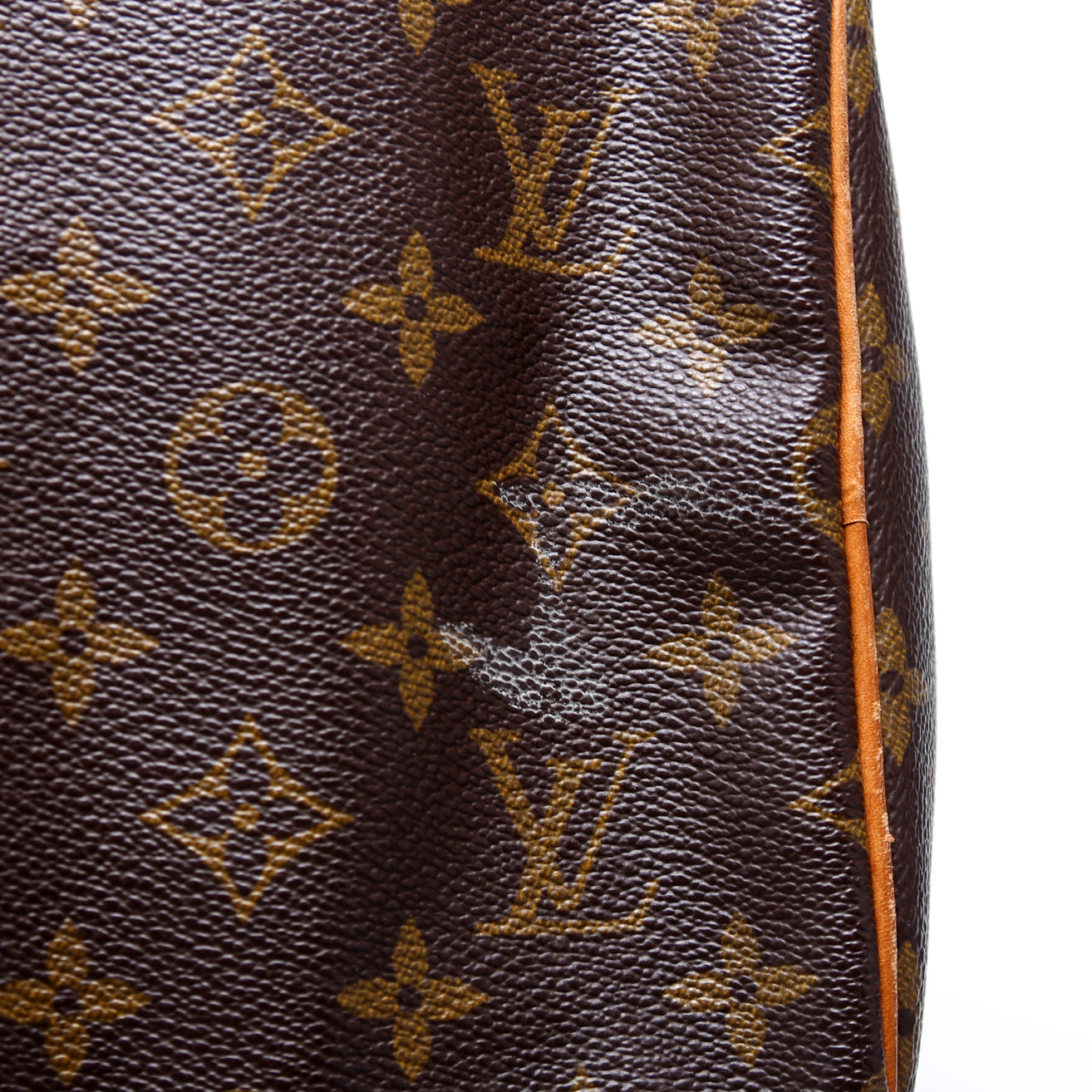 Exterior: The exterior coated canvas is free from wear. The leather trim shows minor discoloration throughout.