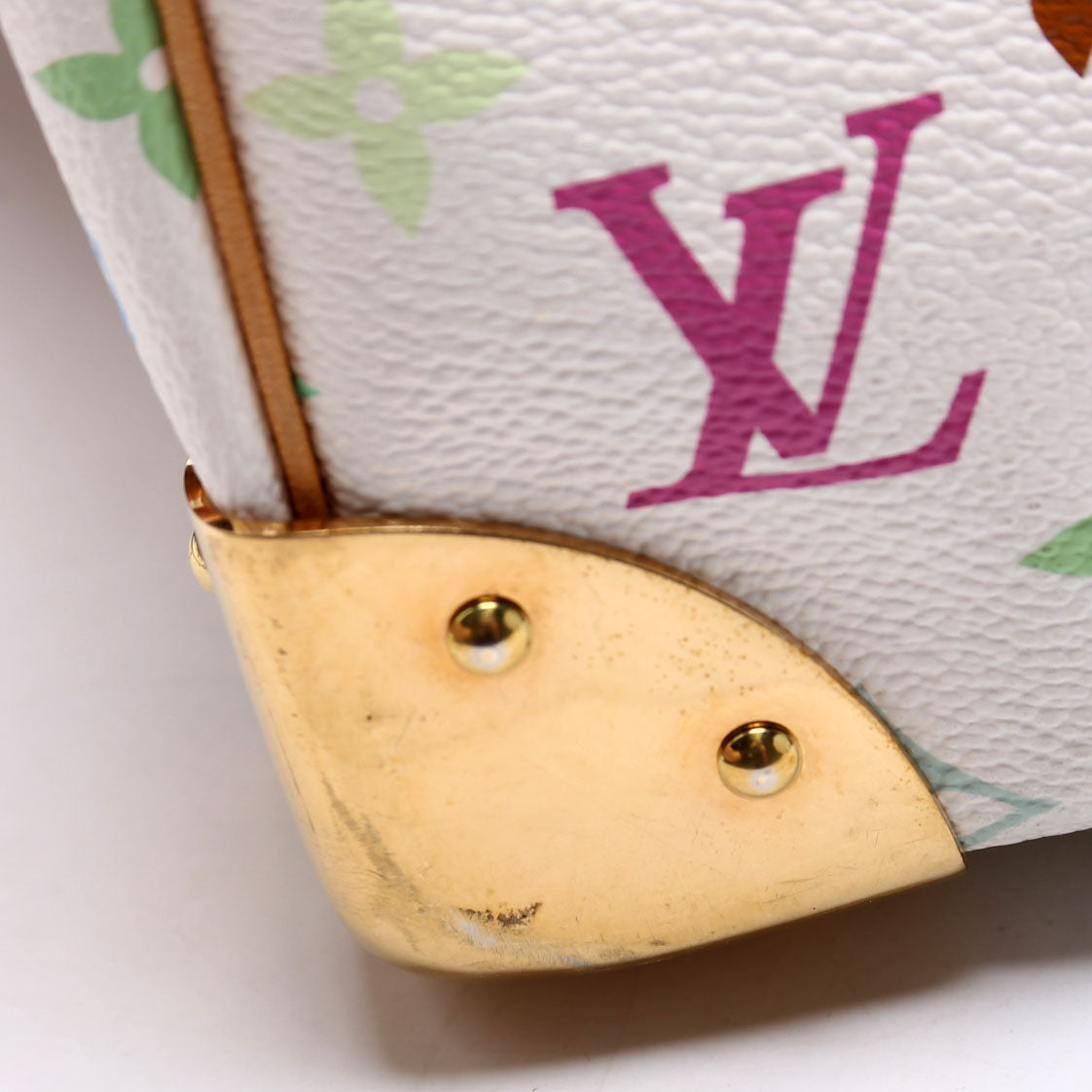 Exterior: The exterior coated canvas is free from major wear. The gold corners show minor scratches and wear. The exterior features one pocket.