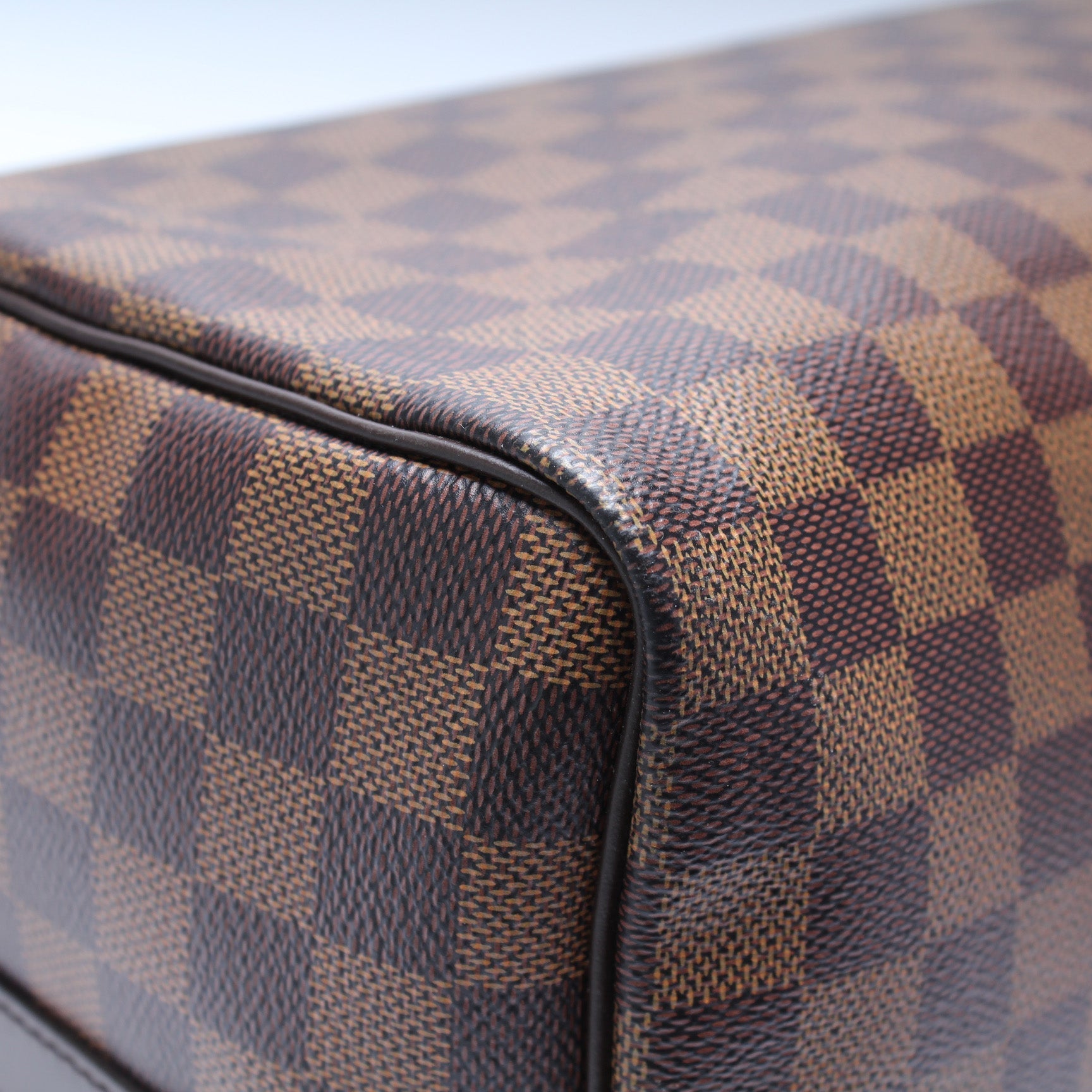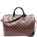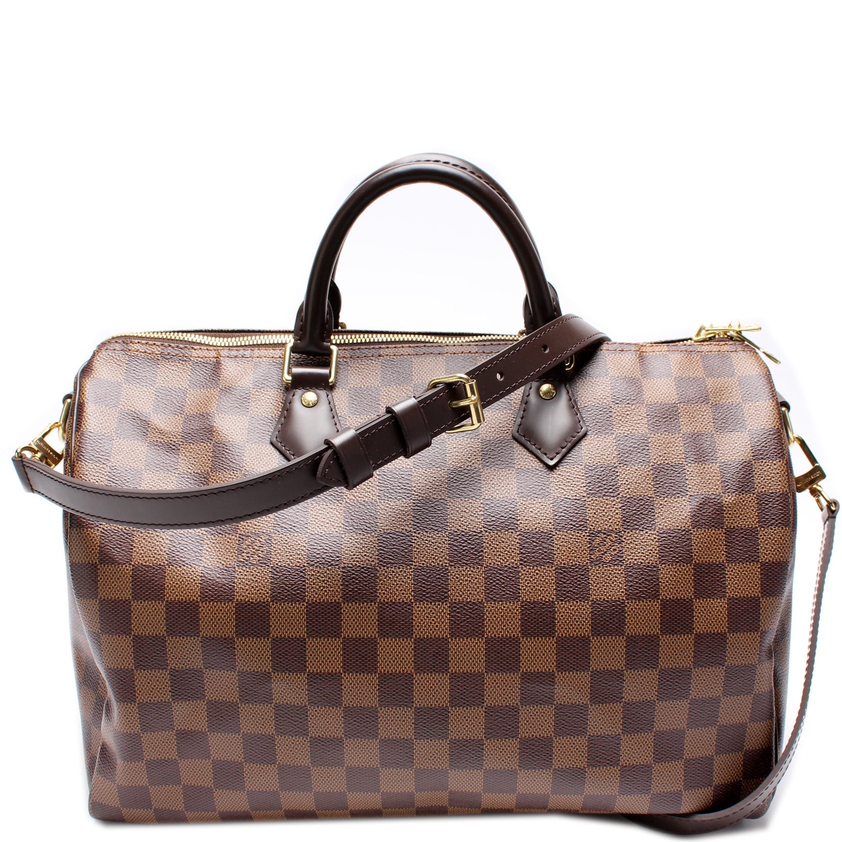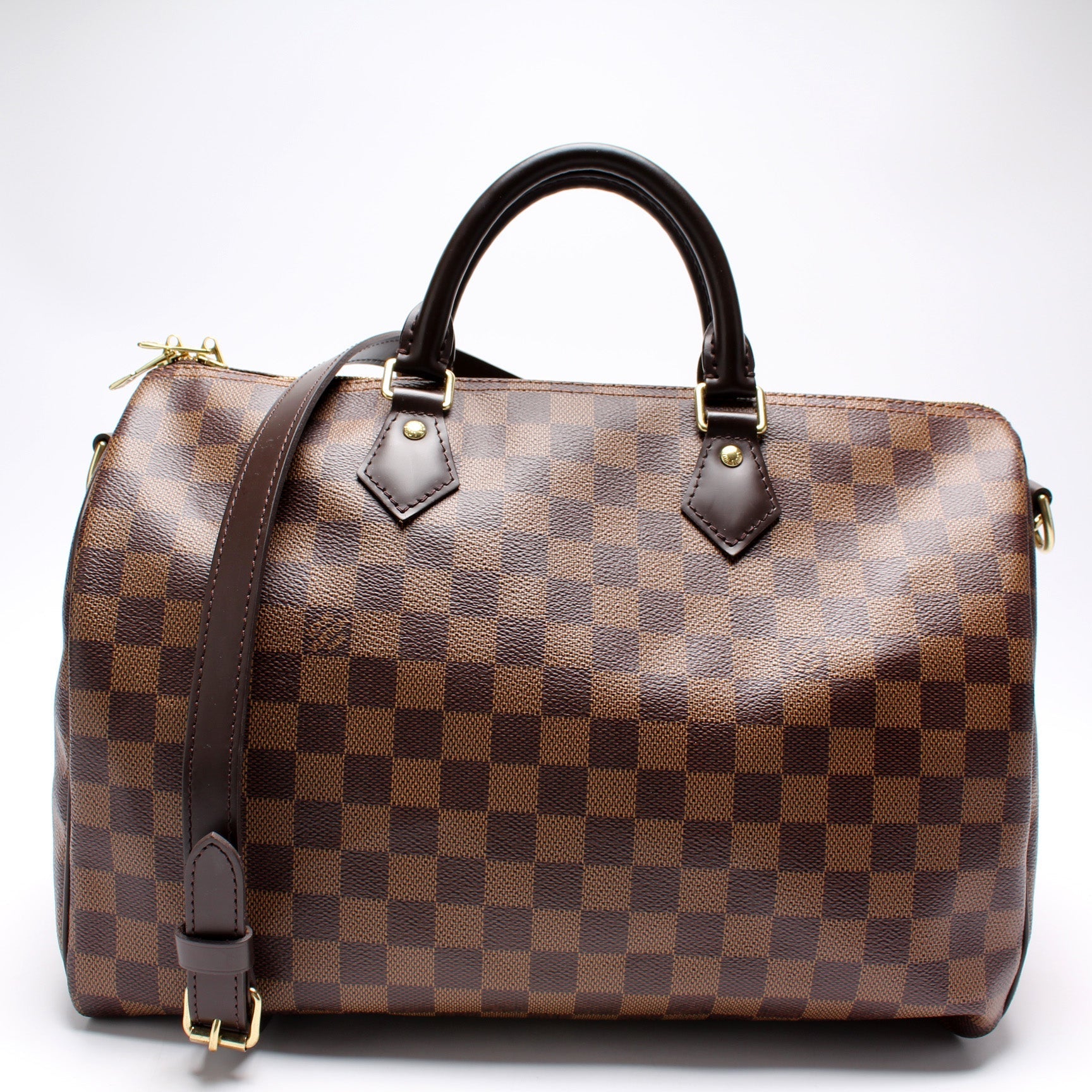 This Louis Vuitton Speedy 35 Bandouliereis eye catching bag. The exterior is in the classic Louis Vuitton Damier Ebene coated canvas.