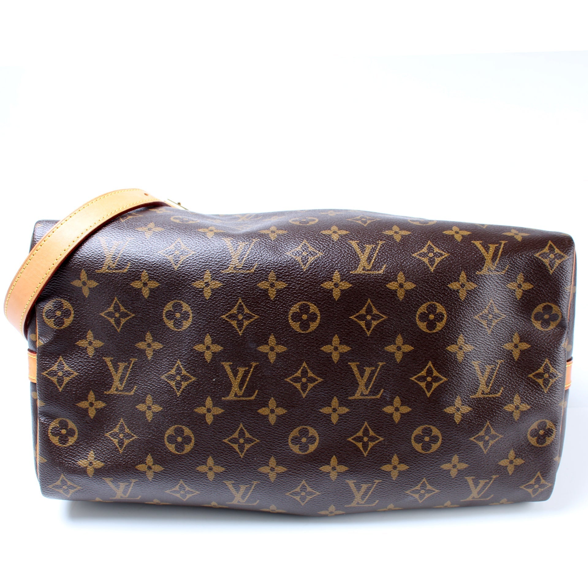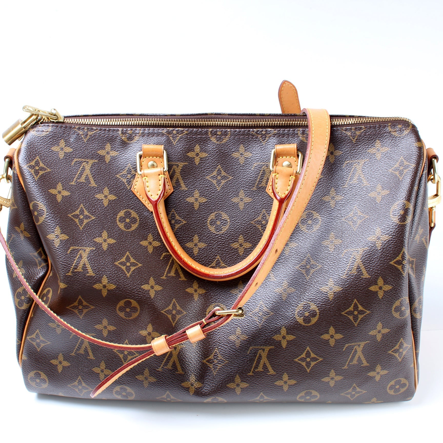 This Louis Vuitton Speedy 35 Bandouliereis eye catching bag. The exterior is in the classic Louis Vuitton Monogram coated canvas.