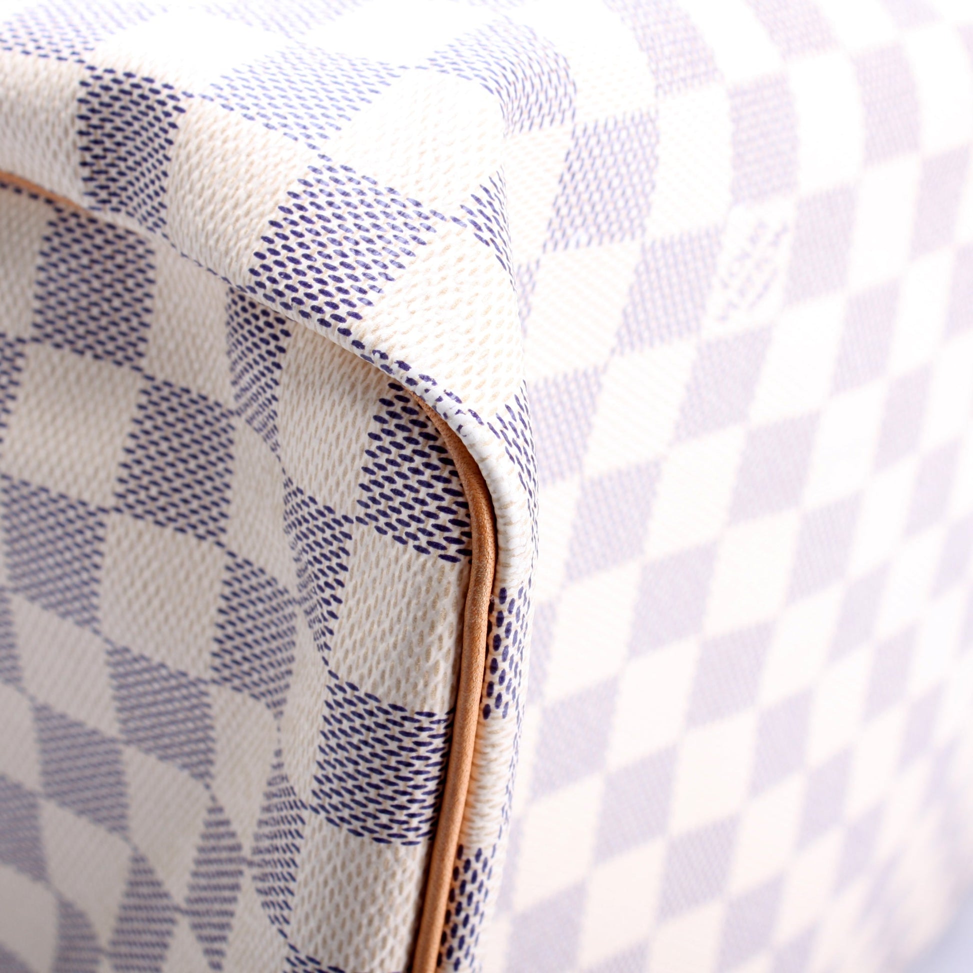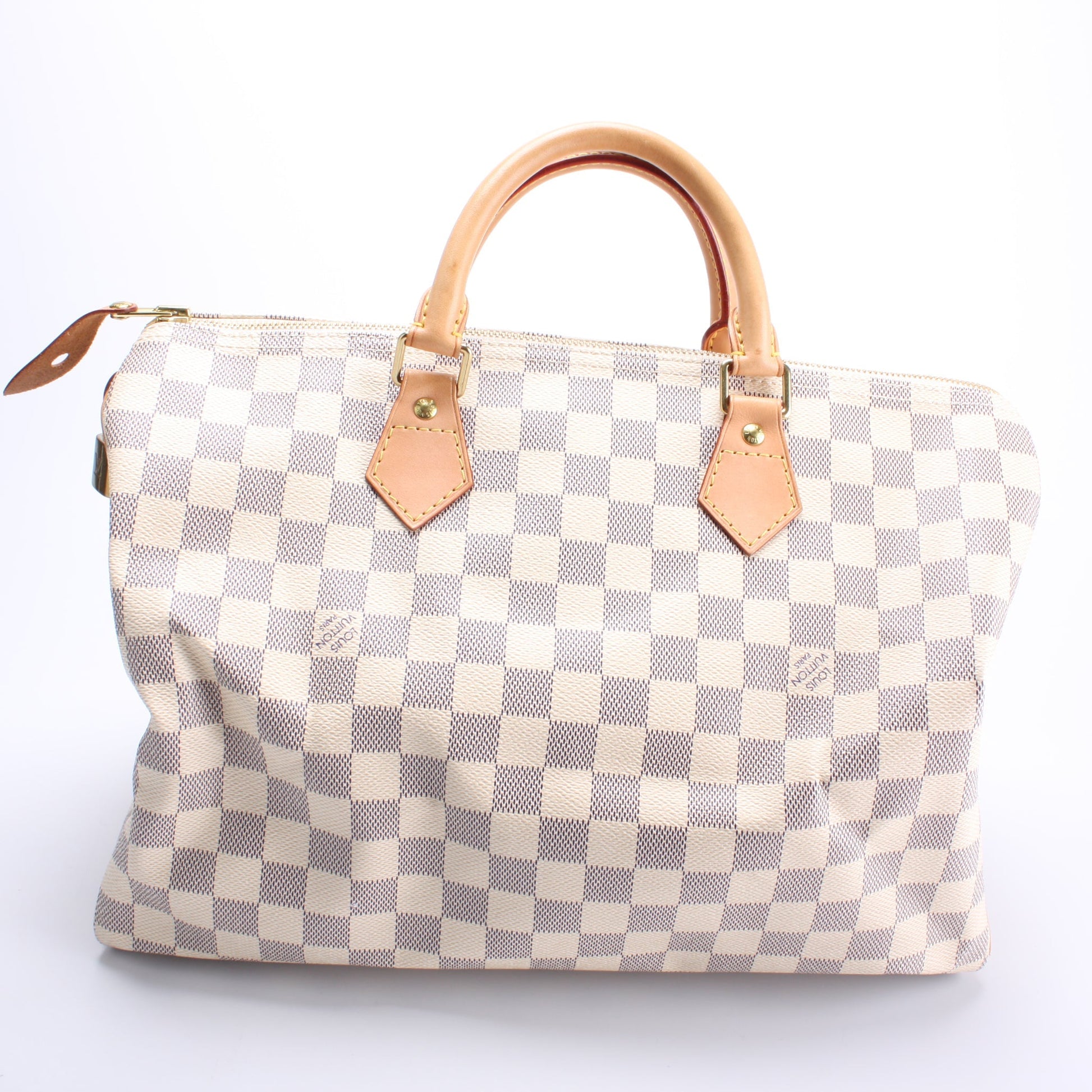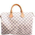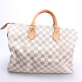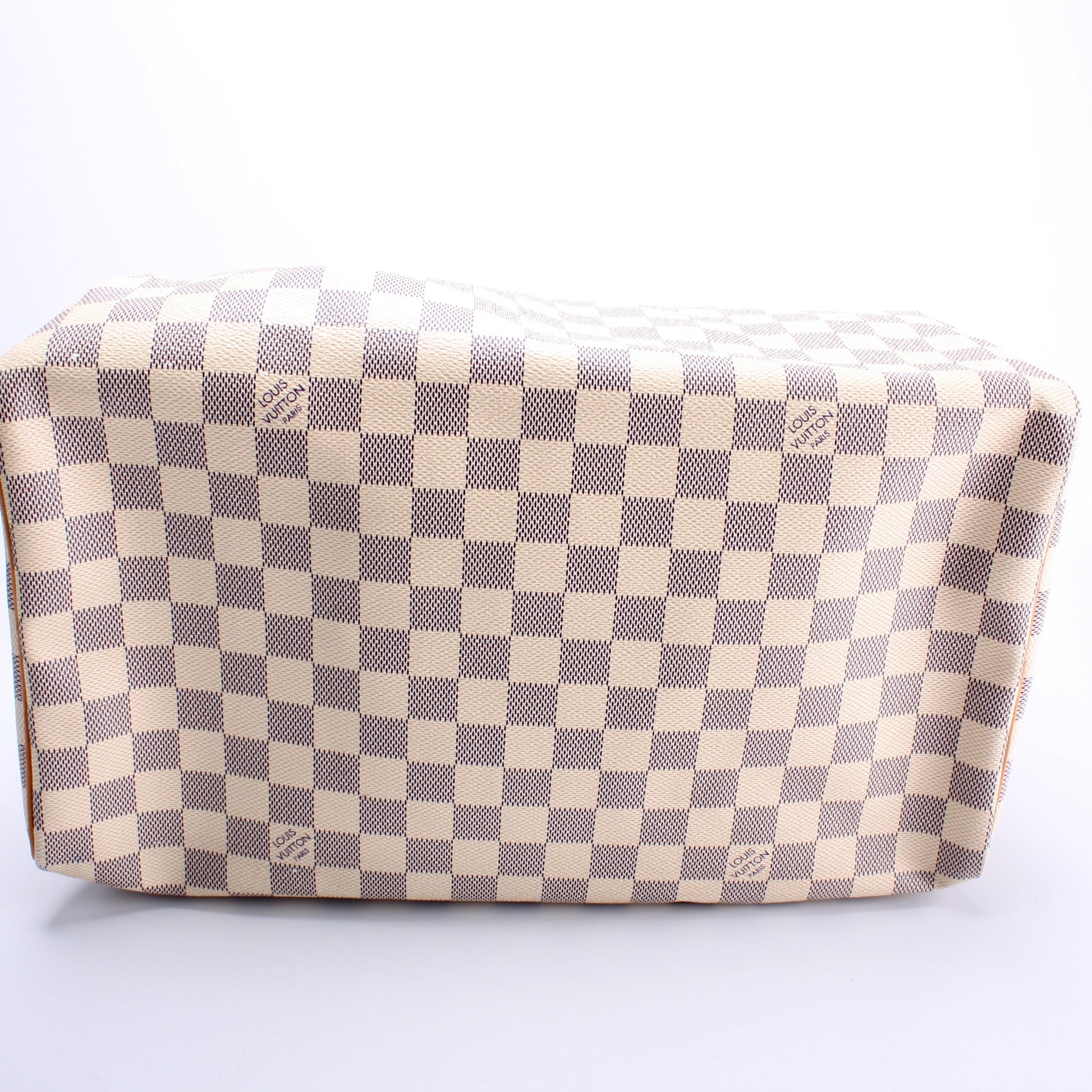 This Louis Vuitton Speedy 35is eye catching bag. The exterior is in the classic Louis Vuitton Damier Azur coated canvas.