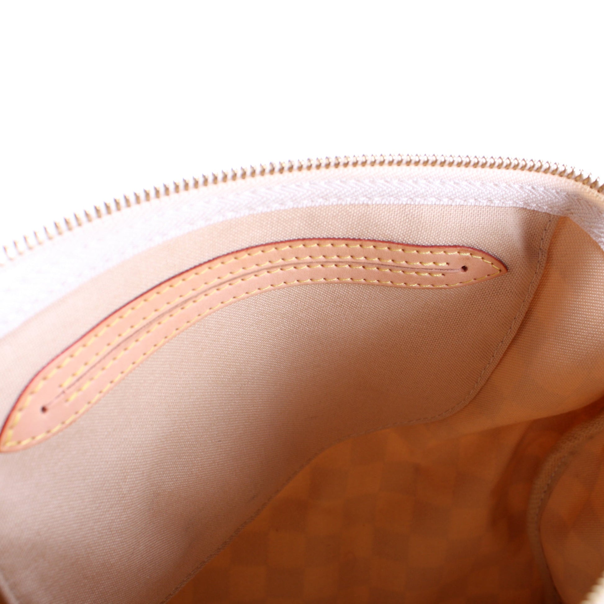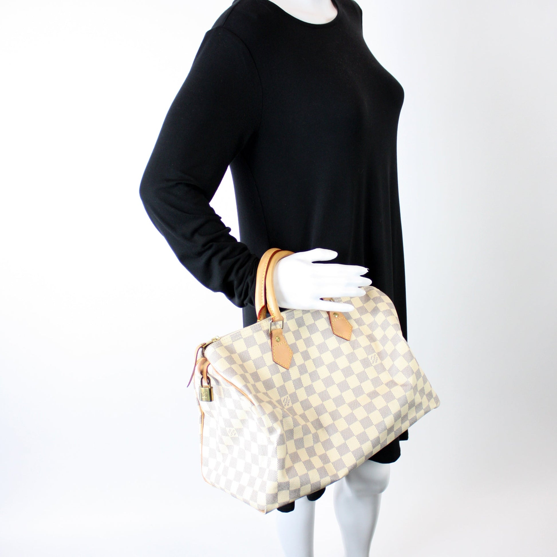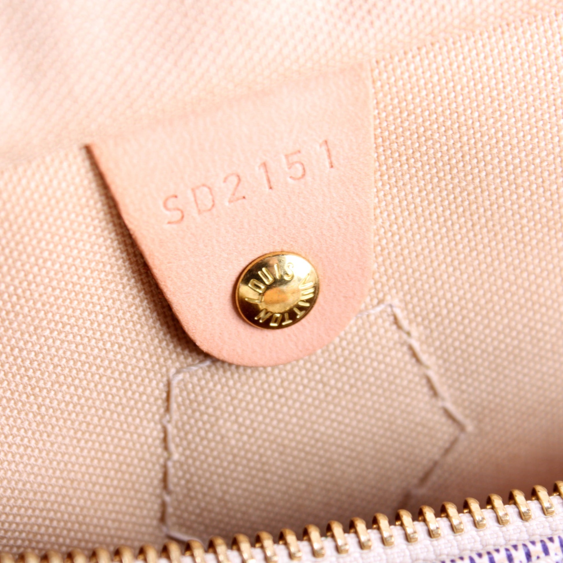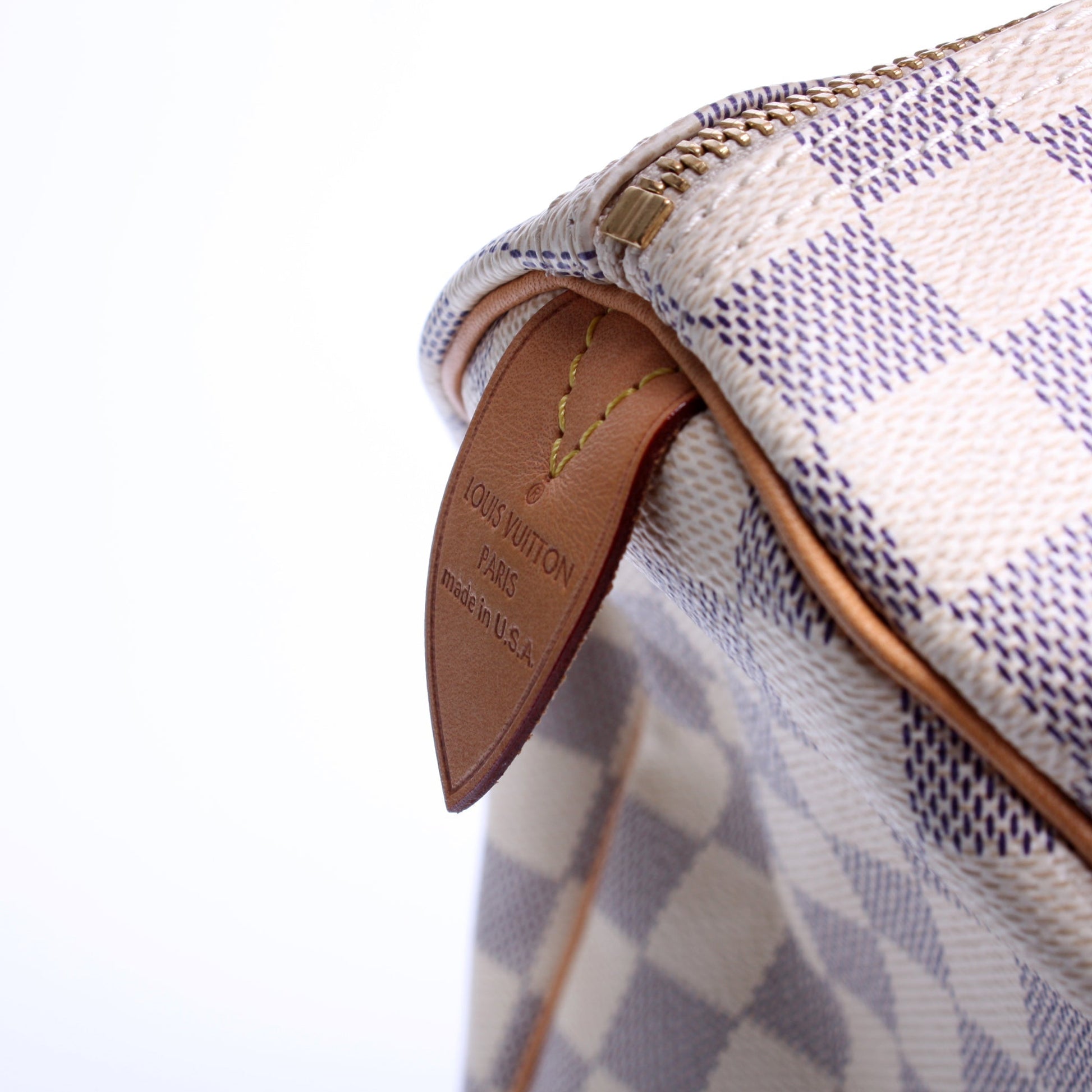 This Louis Vuitton Speedy 35is eye catching bag. The exterior is in the classic Louis Vuitton Damier Azur coated canvas.