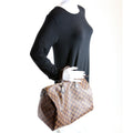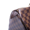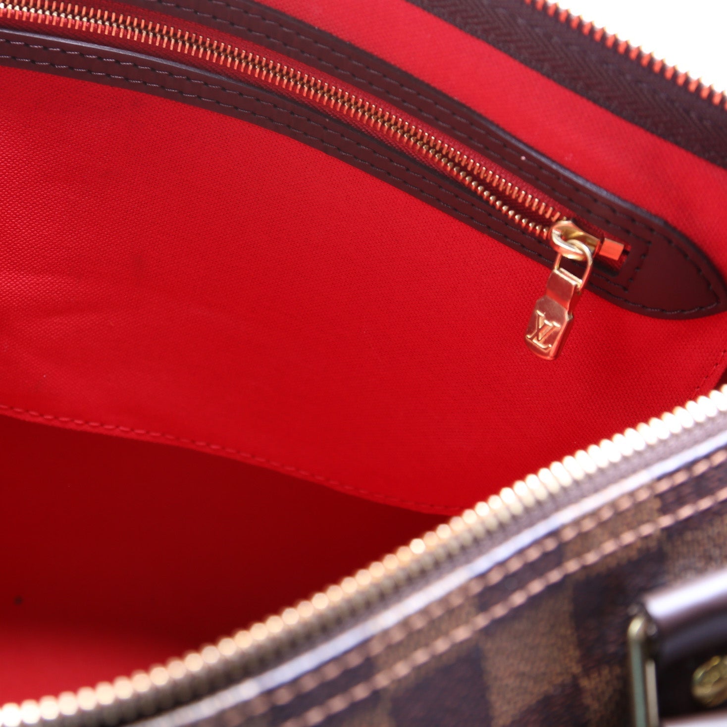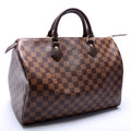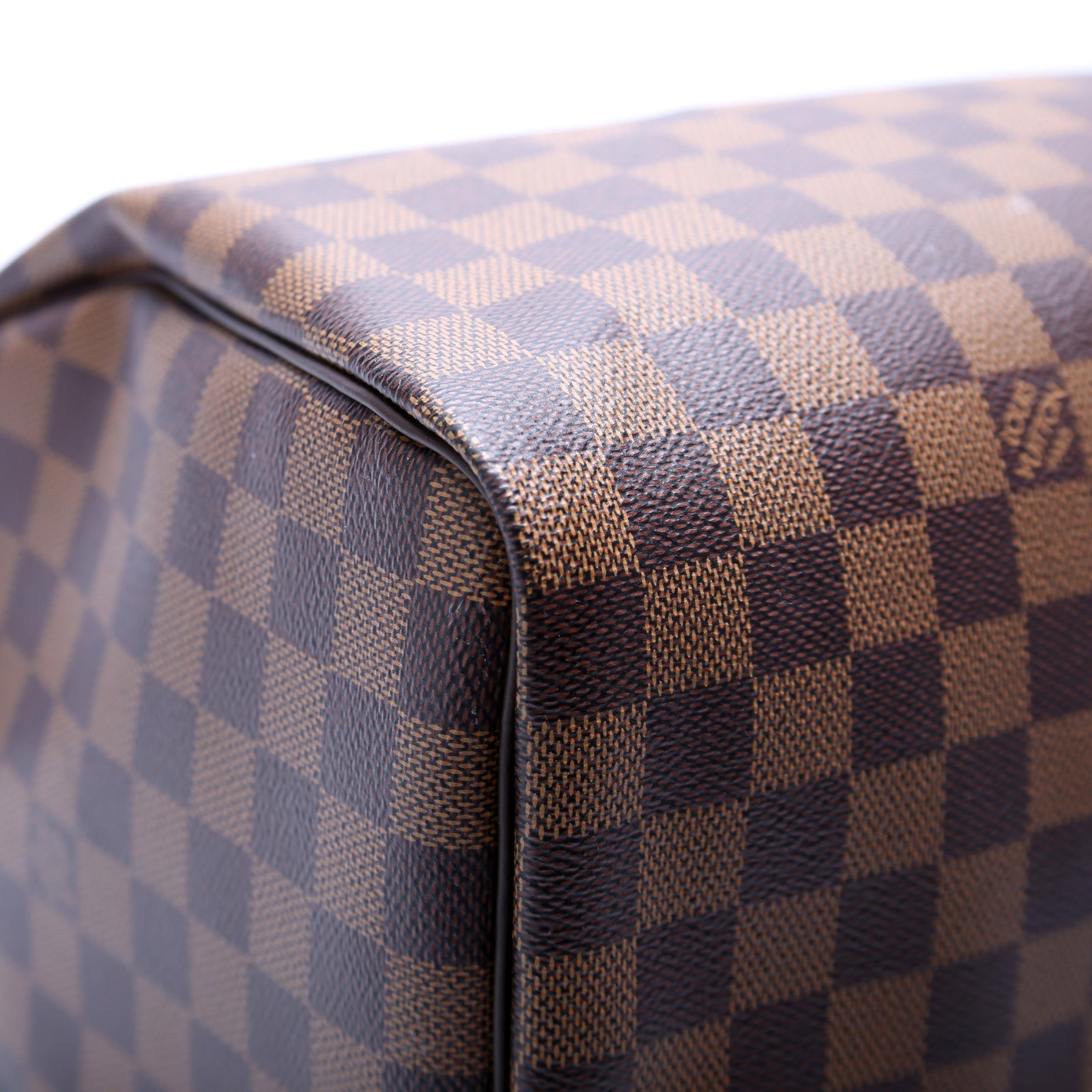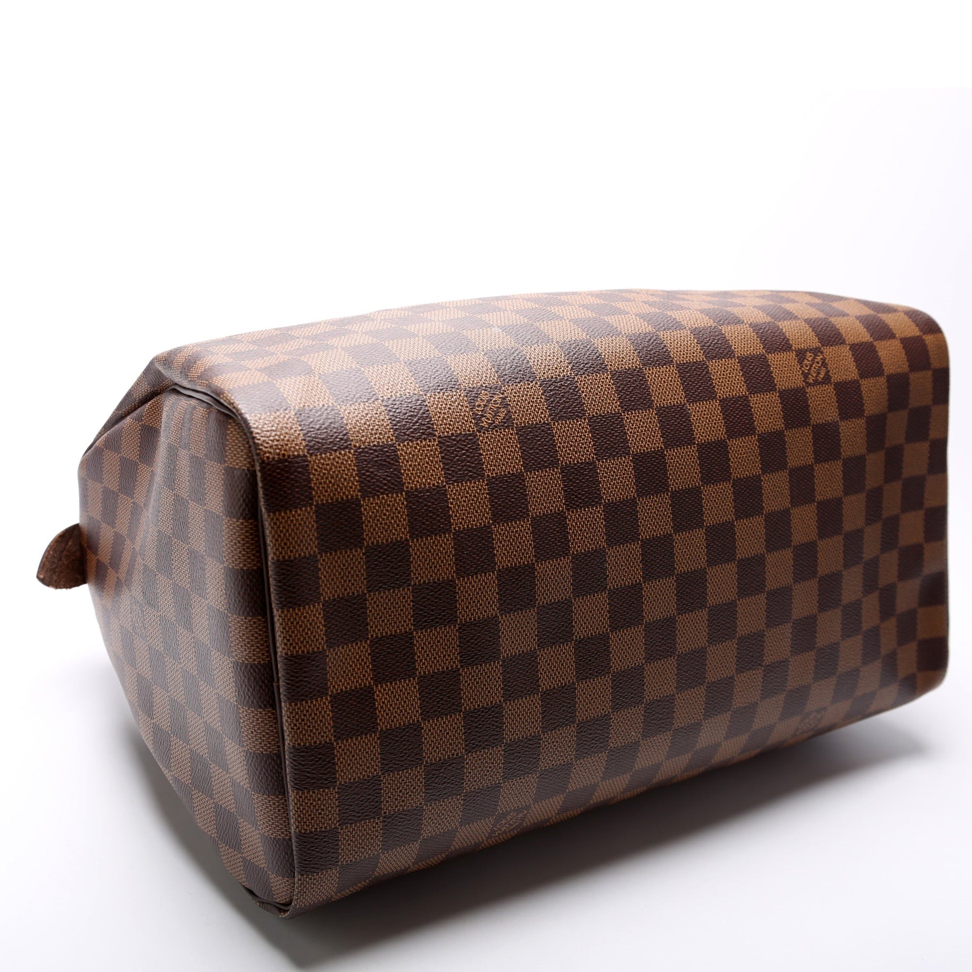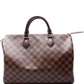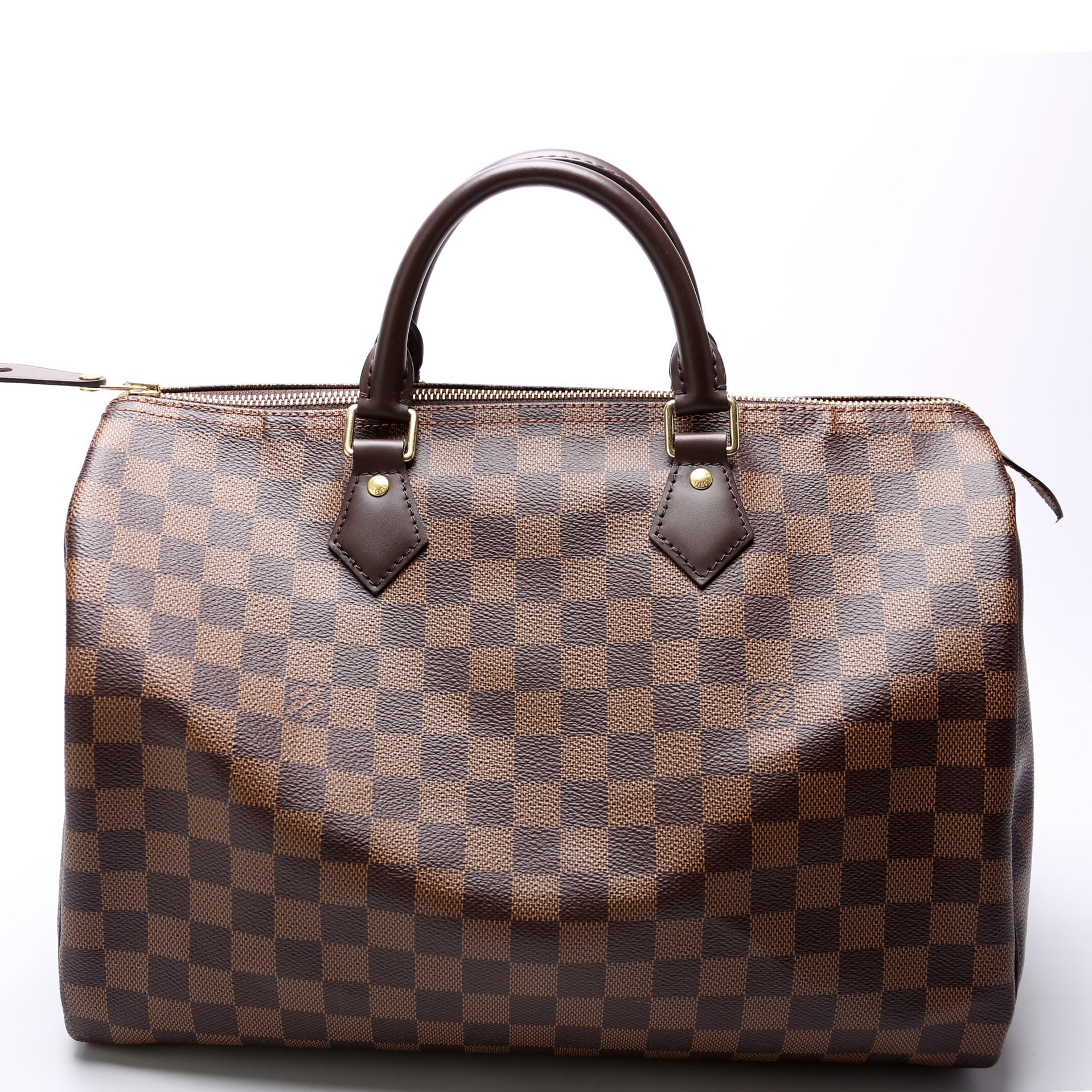 This Louis Vuitton Speedy 35is eye catching bag. The exterior is in the classic Louis Vuitton Damier Ebene coated canvas.