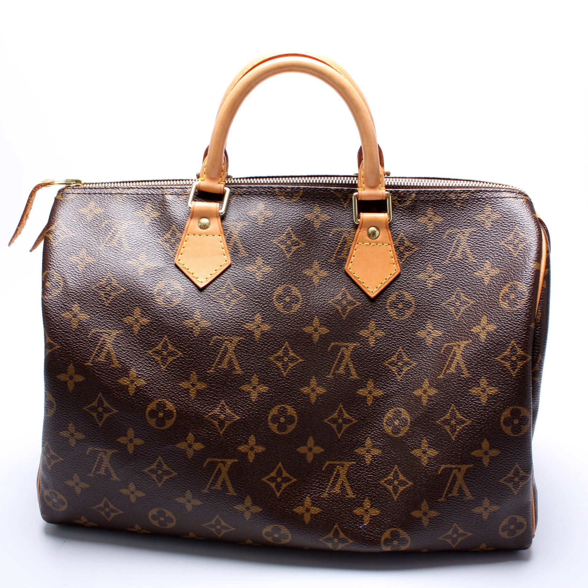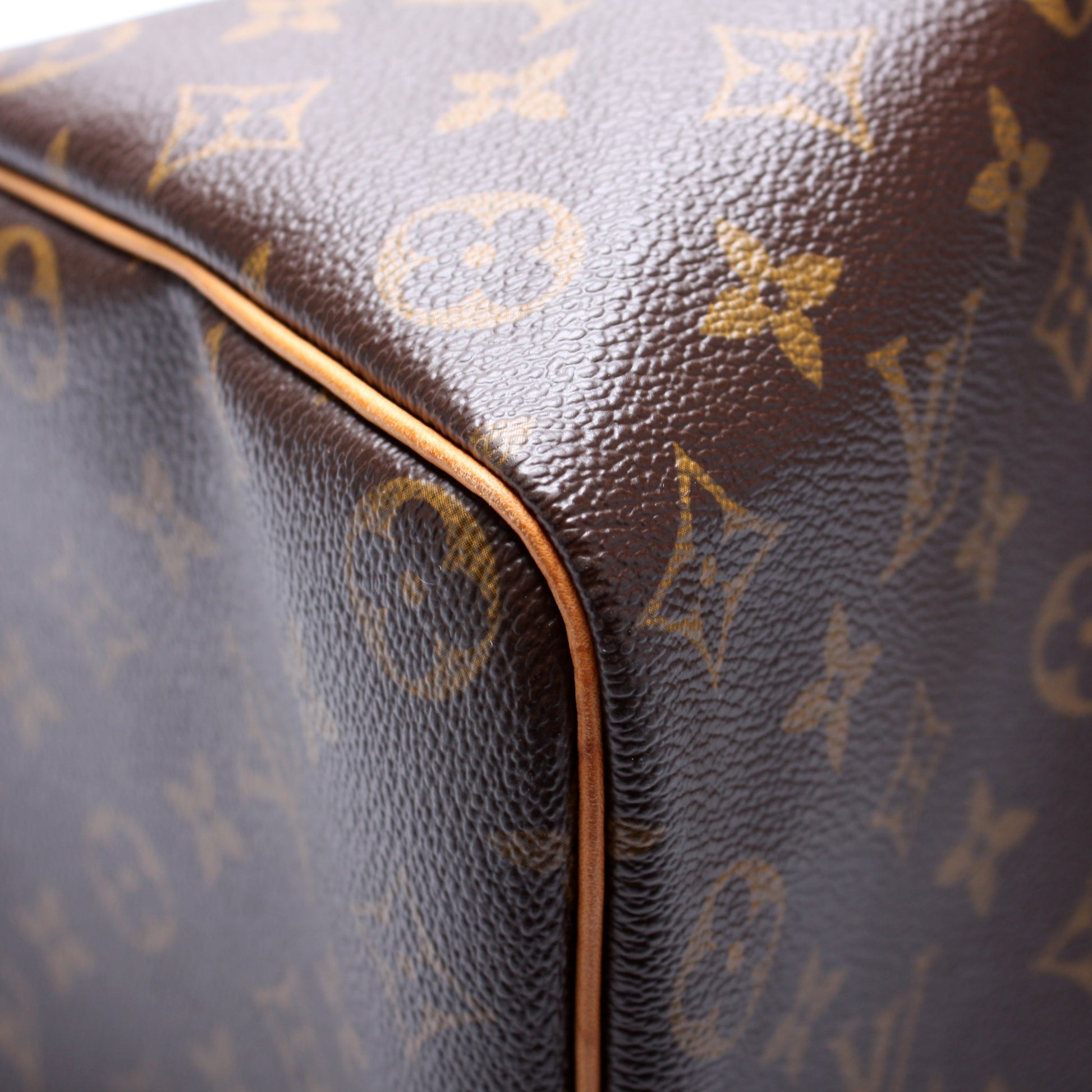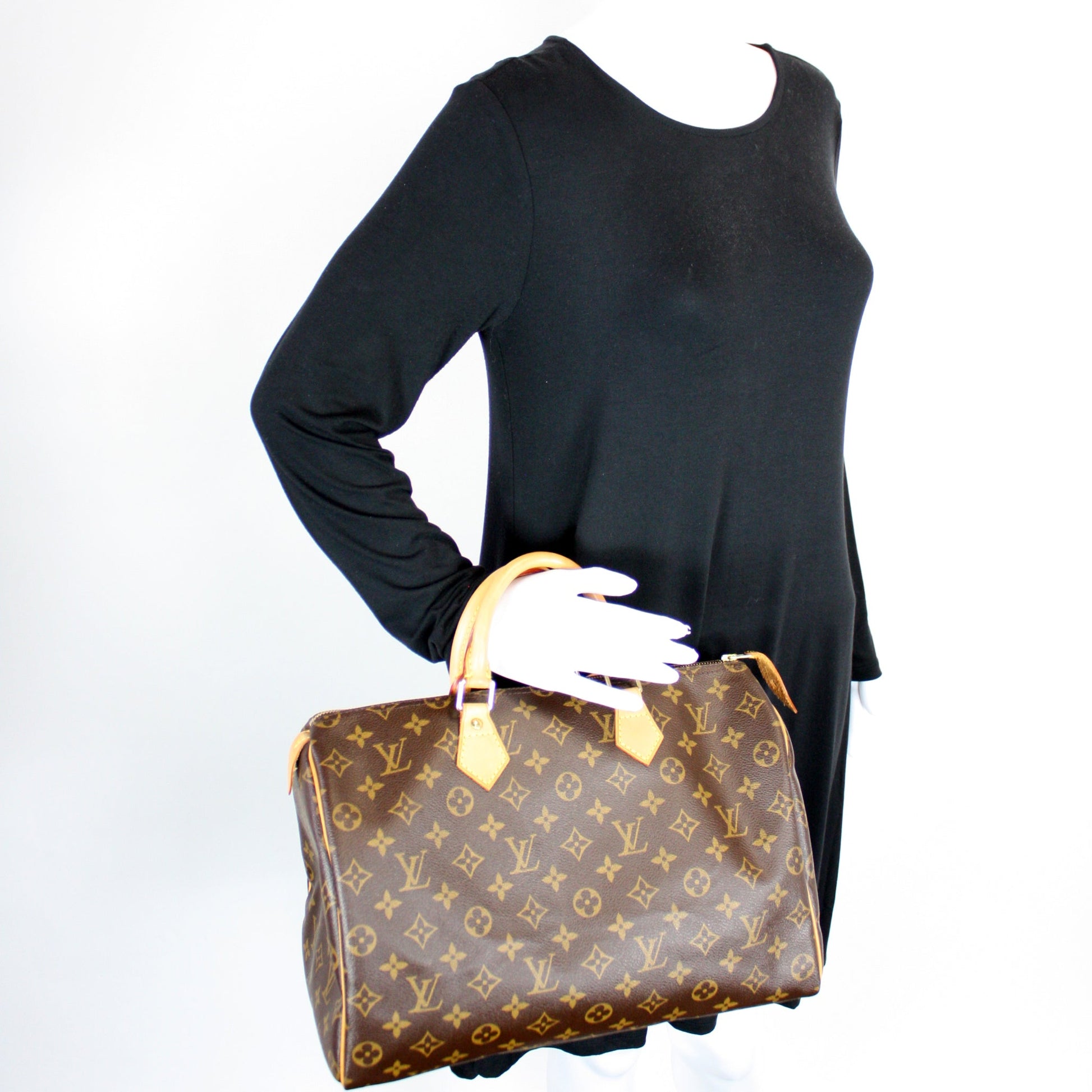 This Louis Vuitton Speedy 35is eye catching bag. The exterior is in the classic Louis Vuitton Monogram coated canvas.