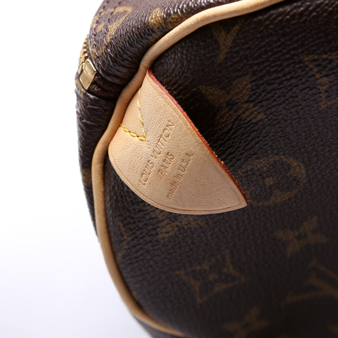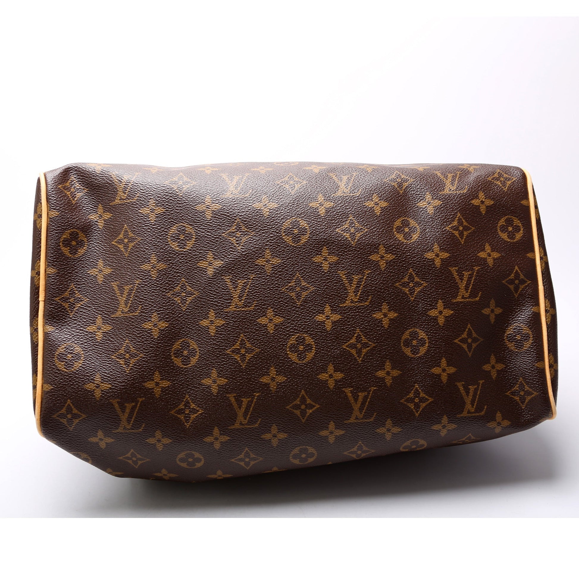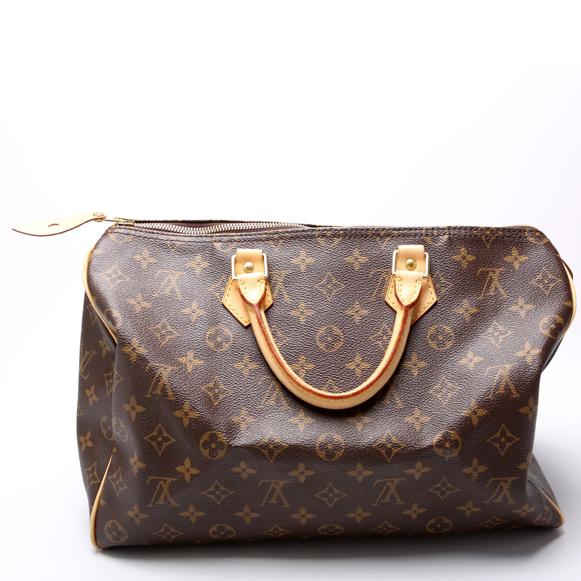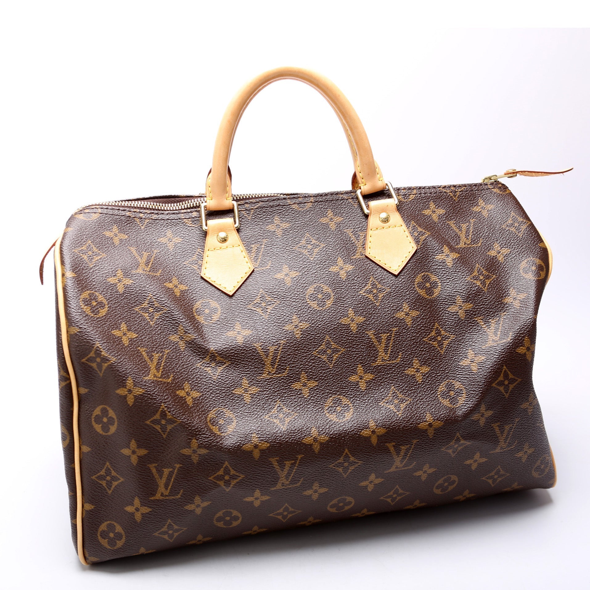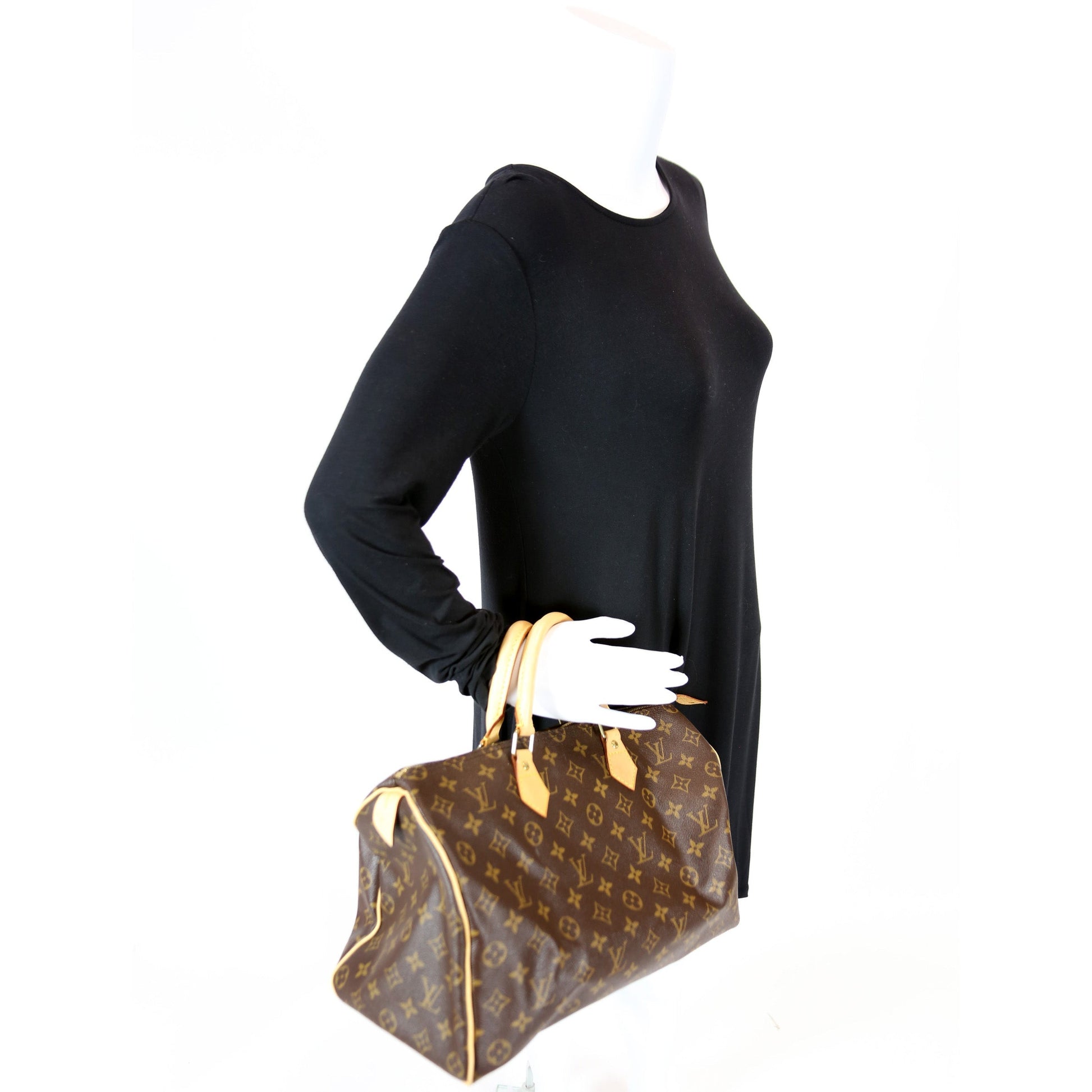 This Louis Vuitton Speedy 35is eye catching bag. The exterior is in the classic Louis Vuitton Monogram coated canvas.