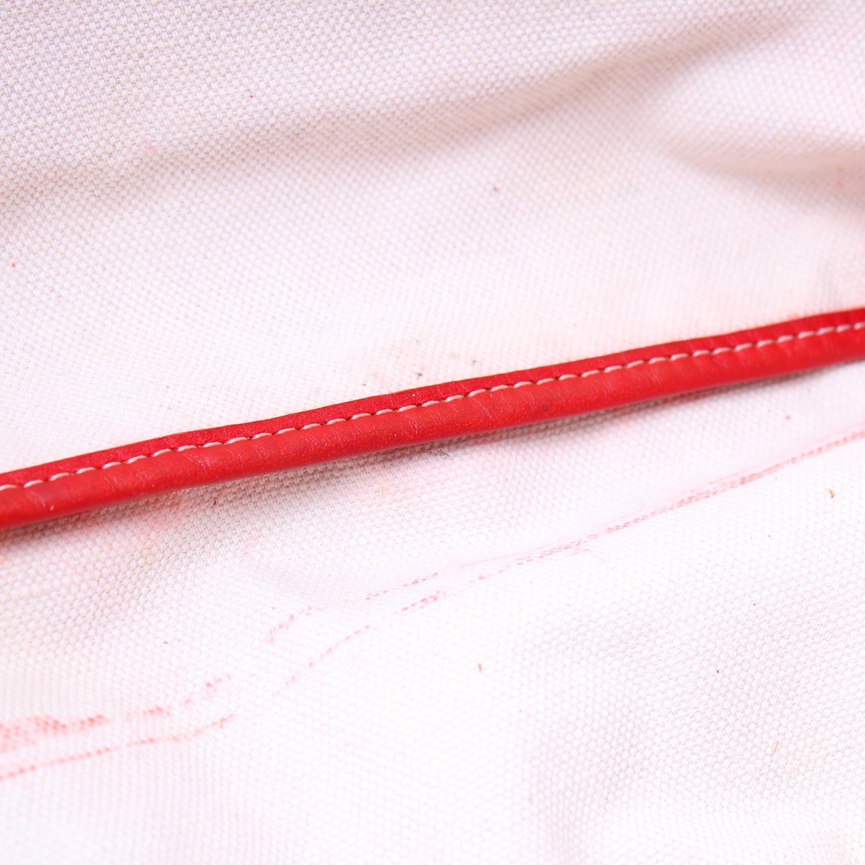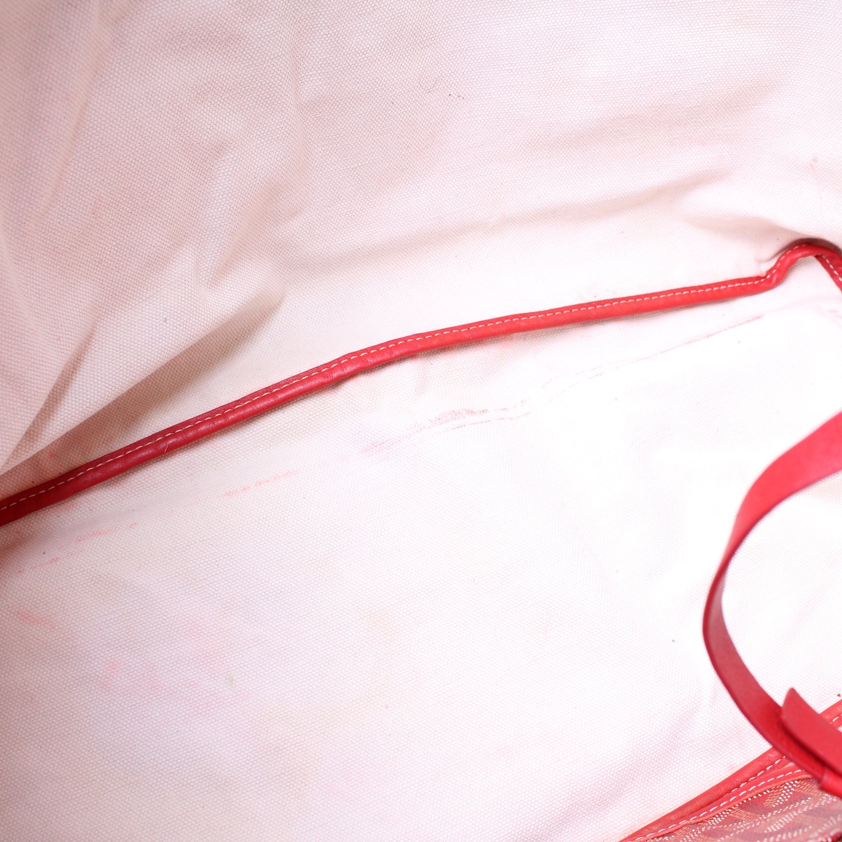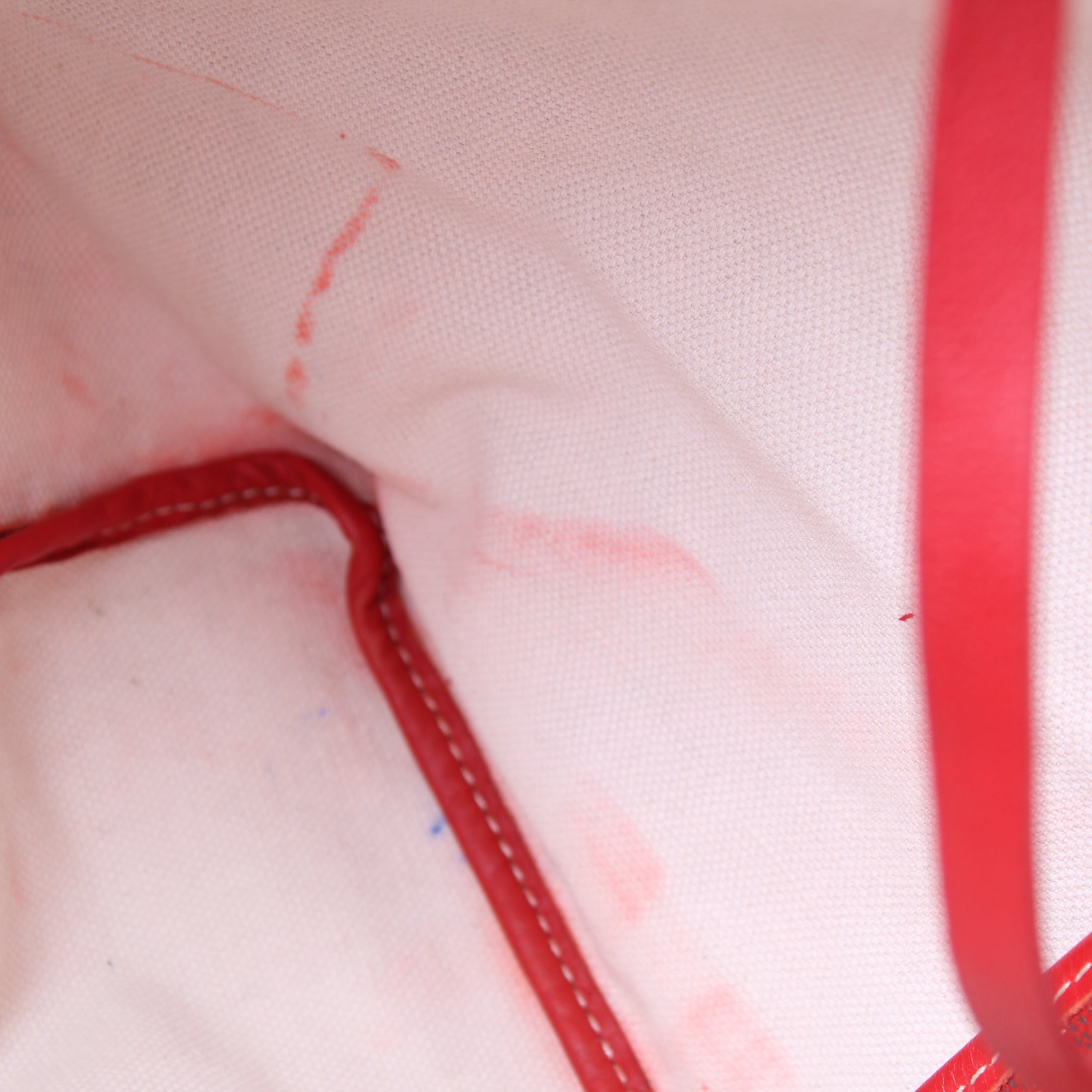 Interior: The interior is free of rips or tears. The interior features one removable pouch. The interior has stains and red color transfer throughout.