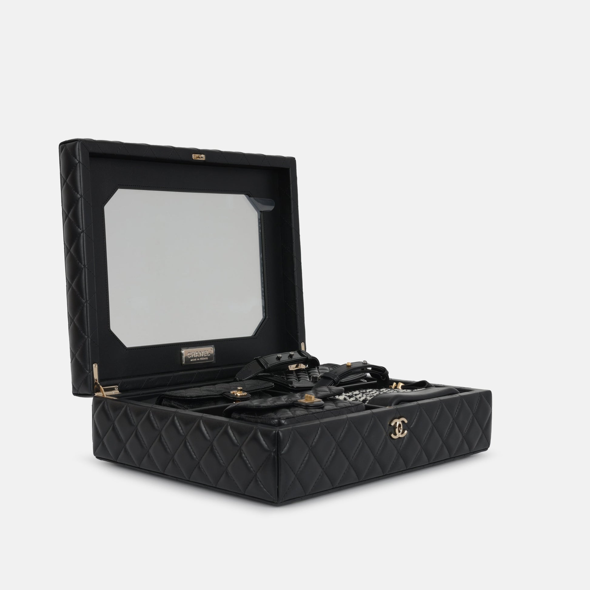 This highly collectible Success Story trunk showcases four miniature versions of Chanel’s most iconic bags (Classic Flap, 2.55 Reissue, Gabrielle Bag, Boy Bag) , all housed in a luxurious black lambskin leather trunk with pale gold-tone hardware. The trunk features a signature CC lock closure, an interior mirror, four compartments to store the mini bags, studded feet, and two keys for added security.