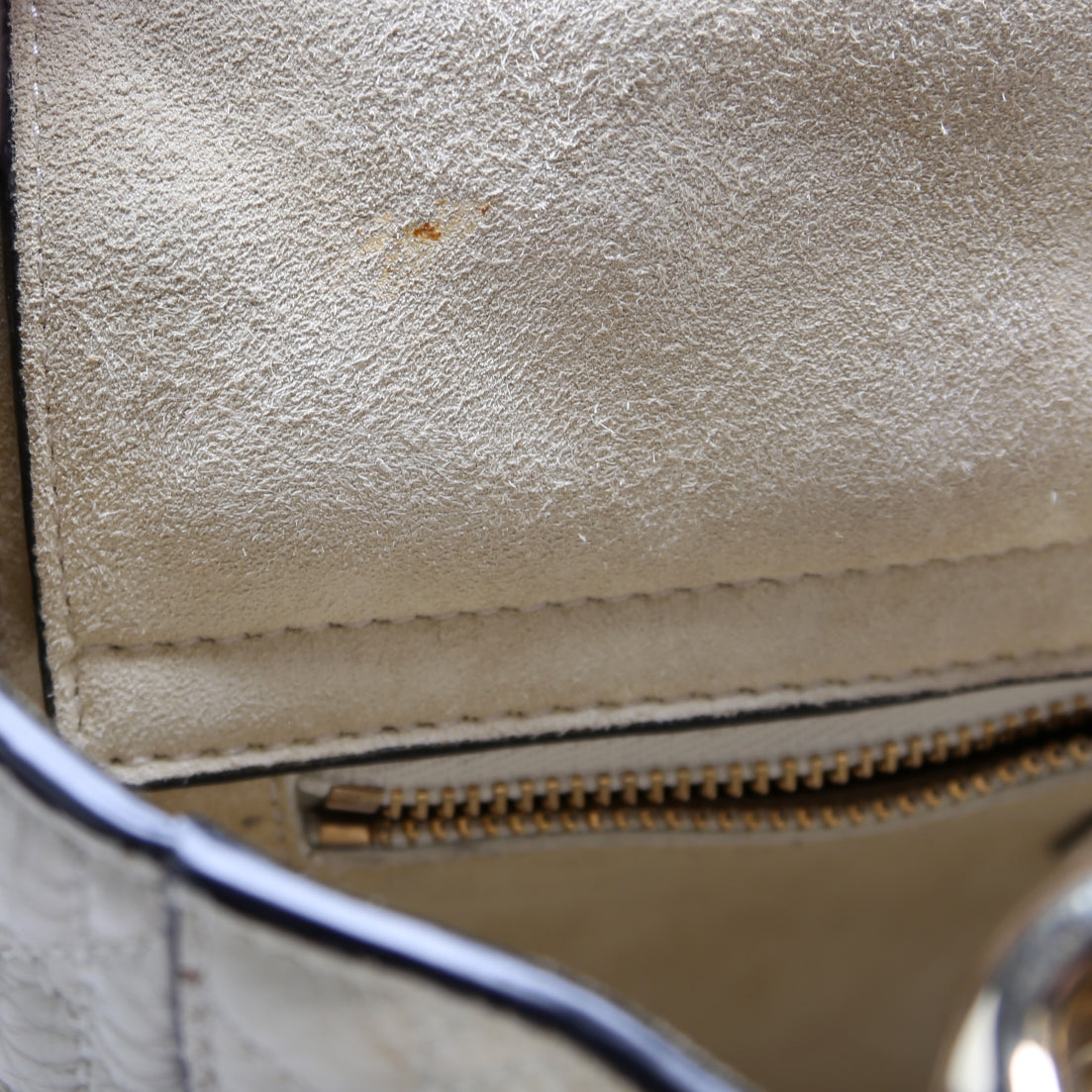 Interior: The interior shows minor wear and discoloration throughout. The interior features one zip closure pocket and one open pocket.