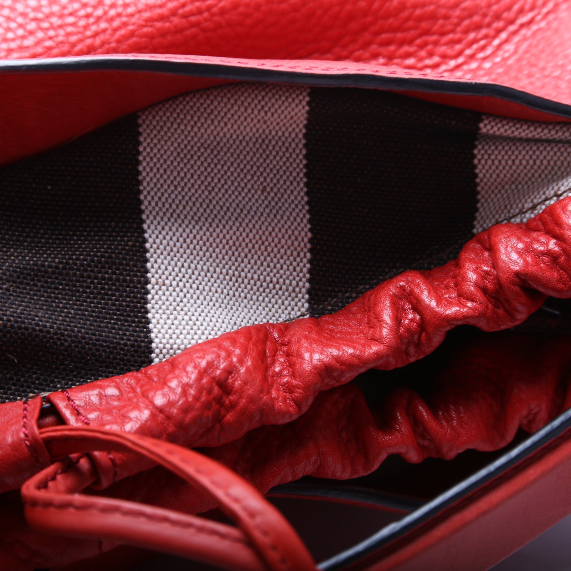 Exterior: The exterior leather has minor wear and discoloration on the corners.