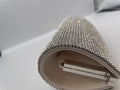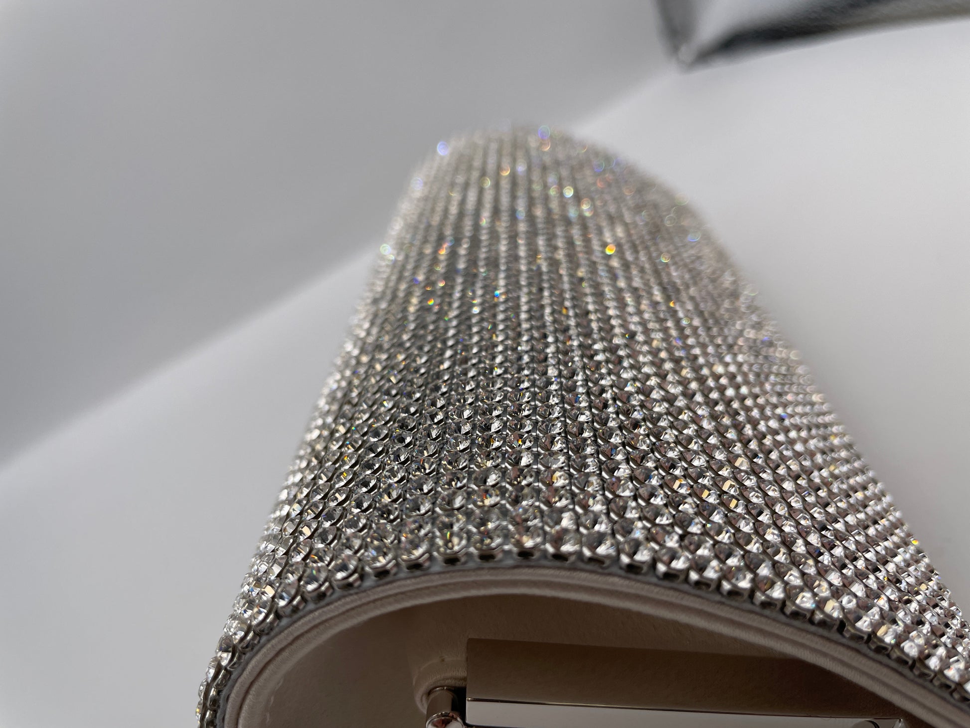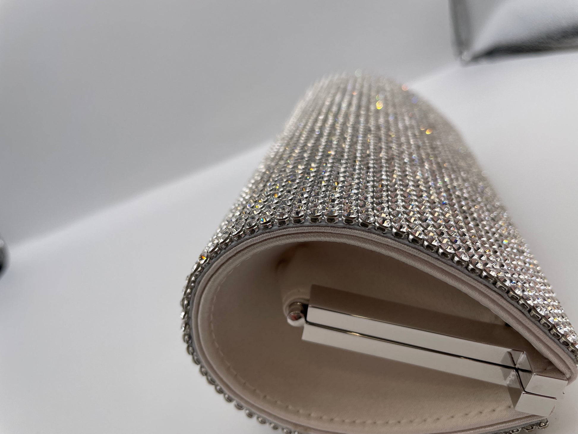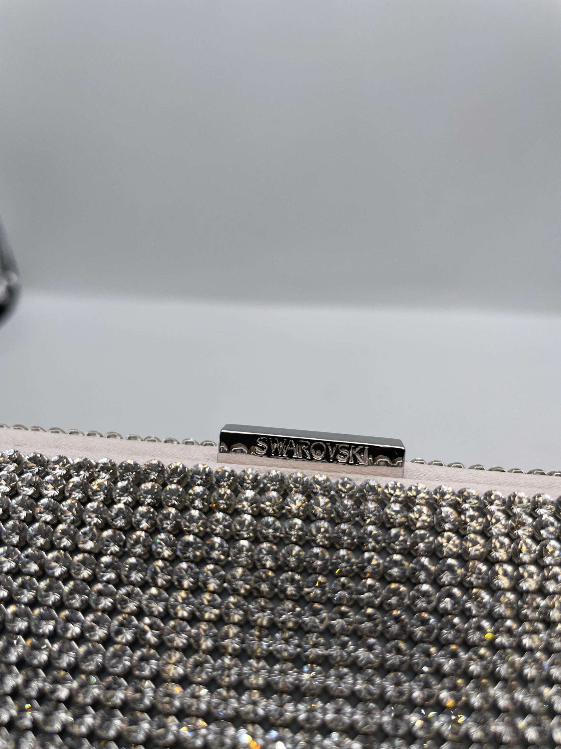 A stunning Swarovski clutch bag, embellished with white Swarovski crystals with a crystal push button opening and detachable silver chain shoulder strap.