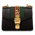 The Gucci Sylvie is one of those bags that became a classic the moment it landed in stores. Featuring the brand’s signature green and red front fabric stripe and a charming gold tone hardware chain strap, this mini Gucci baby is an absolute must-have. With a gold buckle chain prominently depicted on the front flap, the Sylvie is luxurious, glamorous and the perfect accessory to compliment to anything you may have in your wardrobe. Whether you dress the Sylvie up or down, you can be sure this “understated statement” is the ideal accessory for any occasion. Sleek, stylish, sophisticated, but youthful and playful at the same time, the Sylvie is a well-worthy addition to any luxury handbag collection.