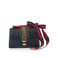 The Gucci Sylvie is regal and timeless; with shined calfskin leather and classic red, green and gold Gucci colours for a luxurious finish. Gucci have been generous in providing two straps so you can chose you style according to occasion or mood. The first is classic black leather, and the second is the more quirky red and navy ribbon that intertwines to create a charming bow -interchangeable for daytime or evening use. Look royal with The Sylvie in a fitted suit or midi dress.