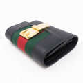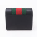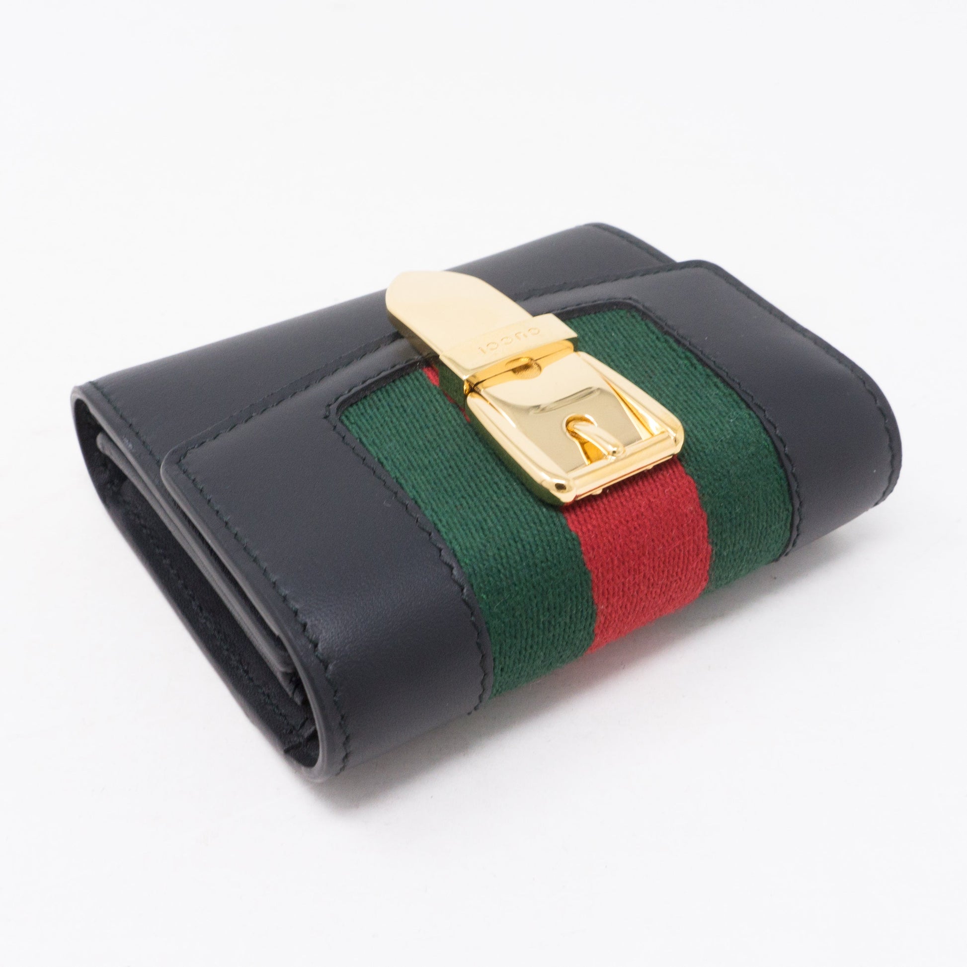 A compact fold wallet by Gucci with a gold-tone metal buckle inspired by Gucci's house archives. Made with black leather with a red-green web strip in the middle. Opens to card slots, coin pocket and cash compartment on the side. Retail price €495.