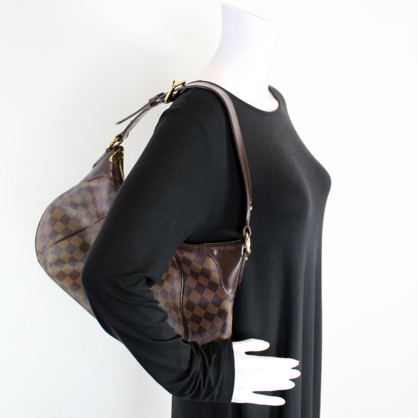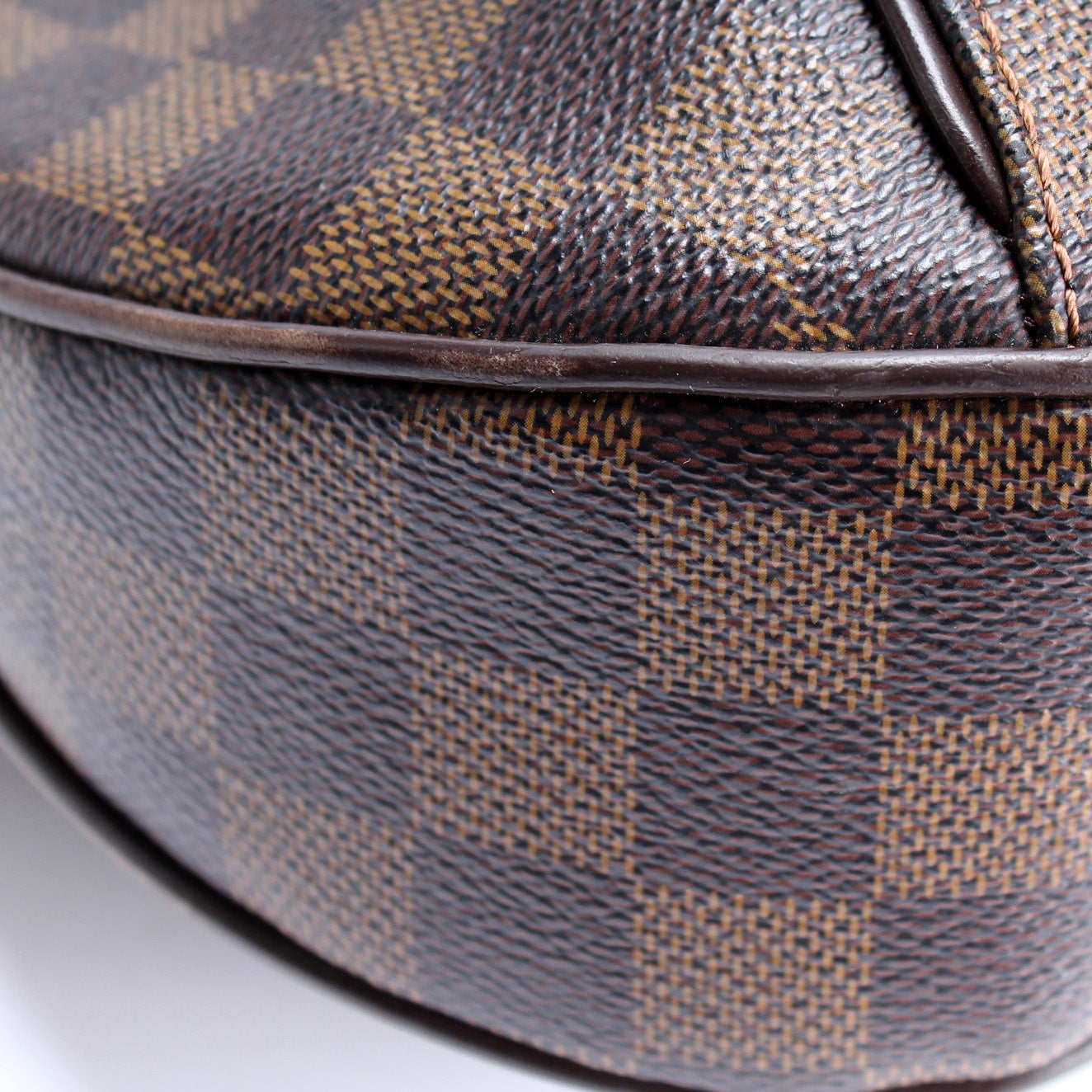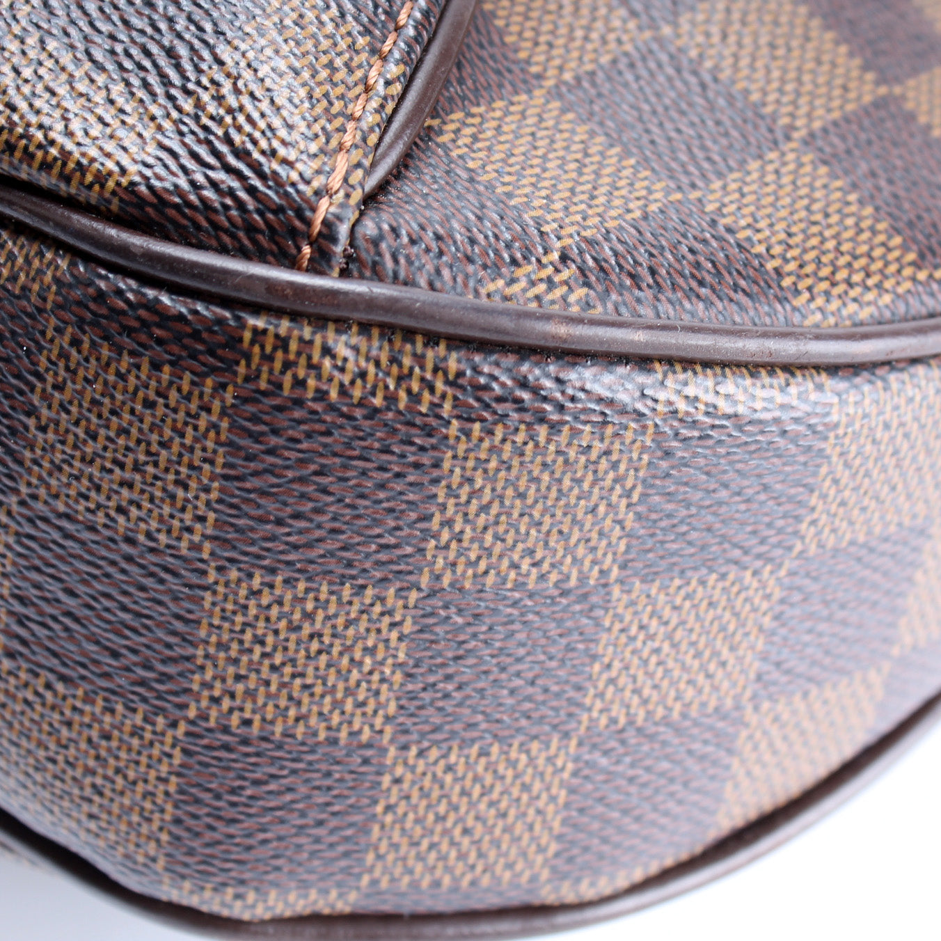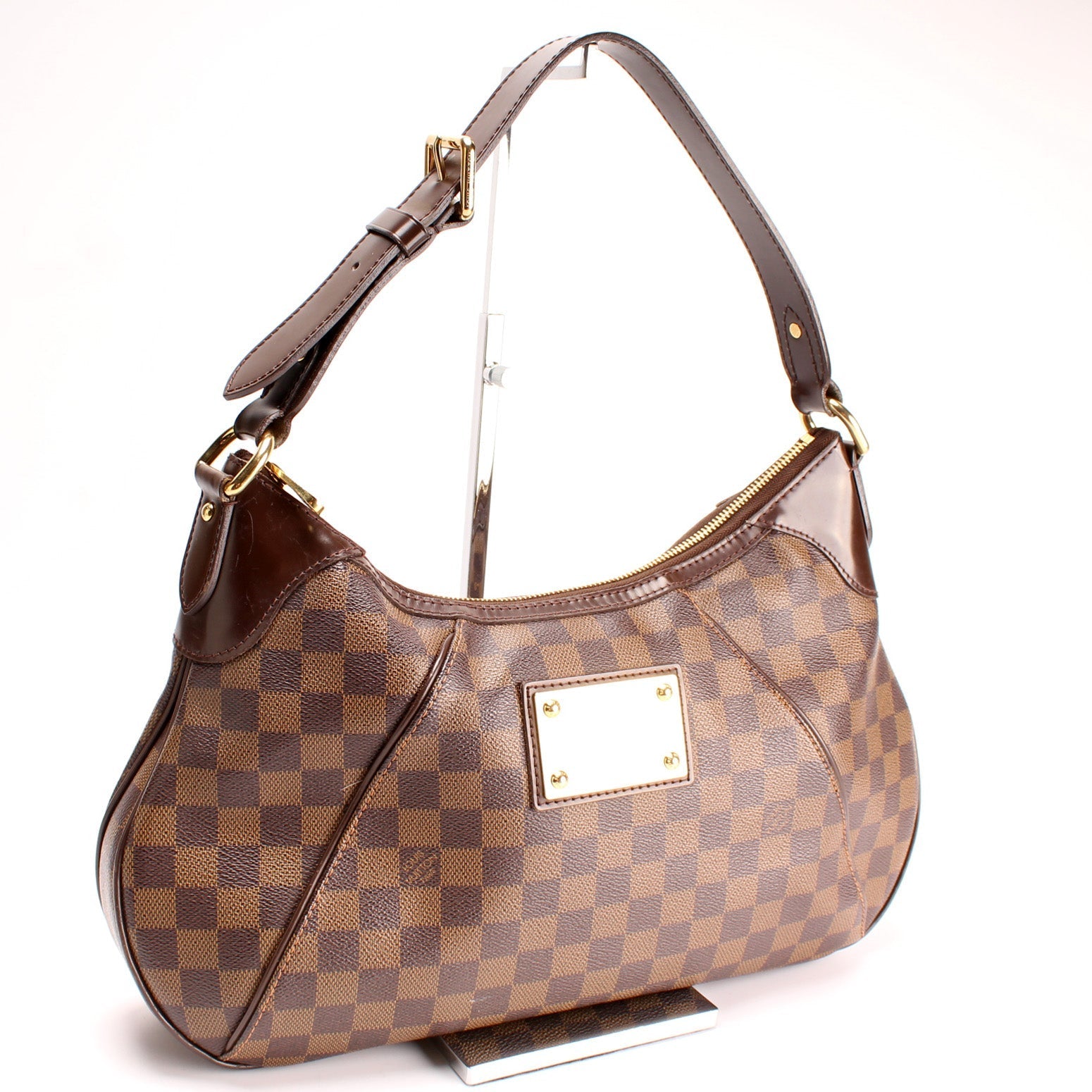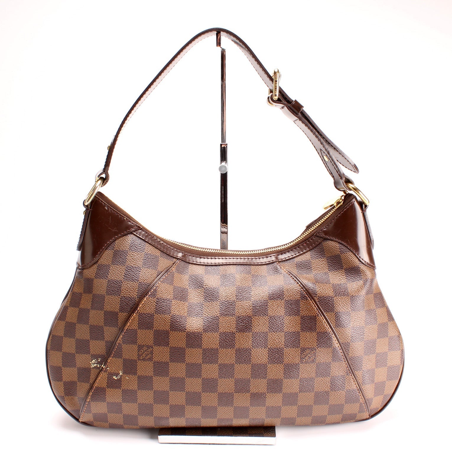 This Louis Vuitton Thames GMis eye catching bag. The exterior is in the classic Louis Vuitton Damier Ebene coated canvas.