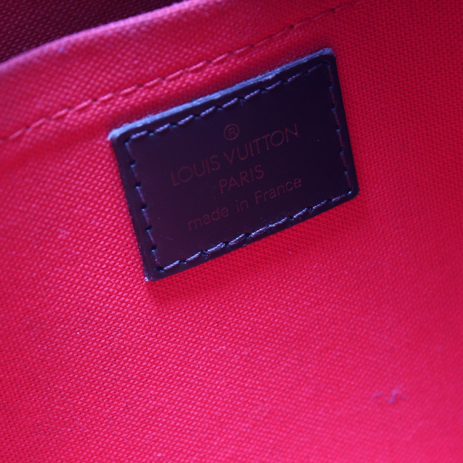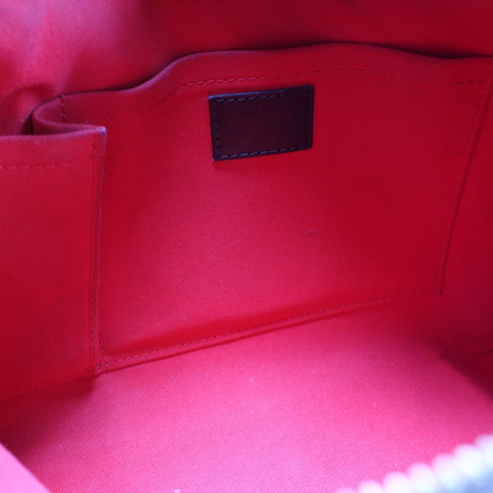 Interior: The interior is free of rips or tears. The interior features two open pockets. There is discoloration to the interior fabric.