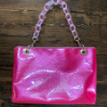 The top is stitched by hand with pink leather lace. I added brass eyelets and rings so that you can can wear either the fun leather pink cross body strap, or the plastic resin chain, IT COMES WITH BOTH, and both are adorable with it!! The pink leather strap is adjustable from 39-48" long, while the pink resin strap is 22" long. This bag measures 14? W x 9? H x 4.5? D. I did not add a magnetic snap closure, but I can add one for free (see last picture) if you want me to!!!