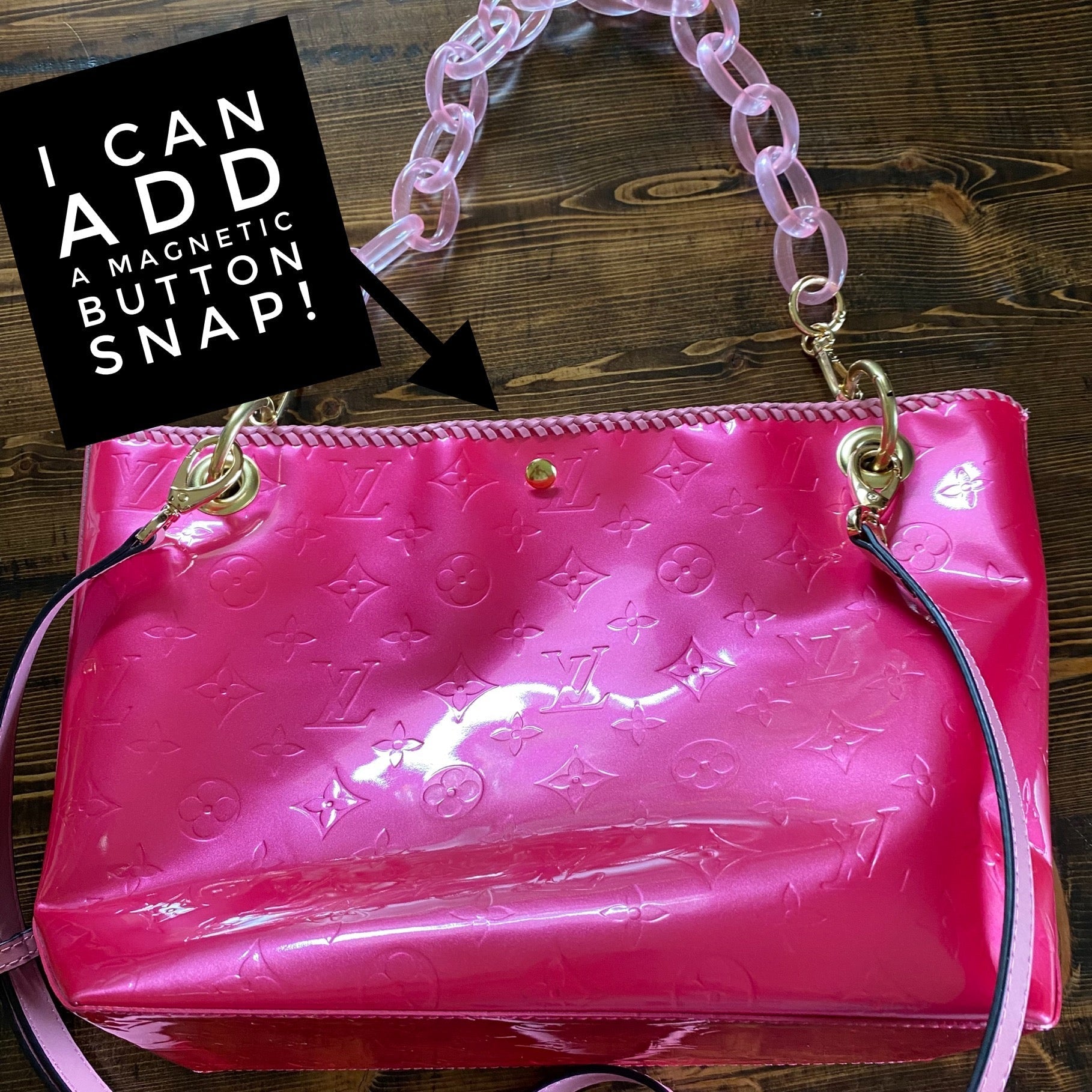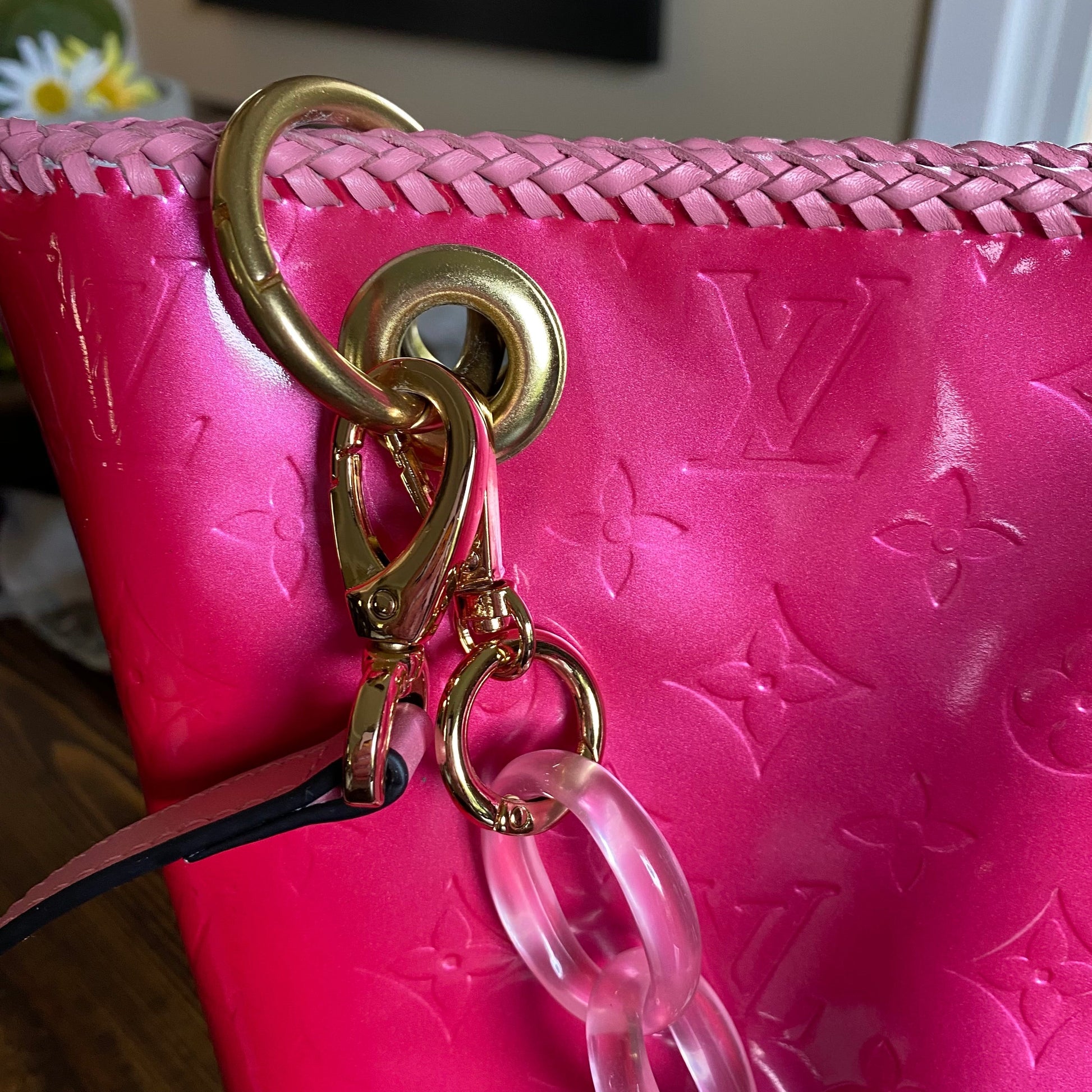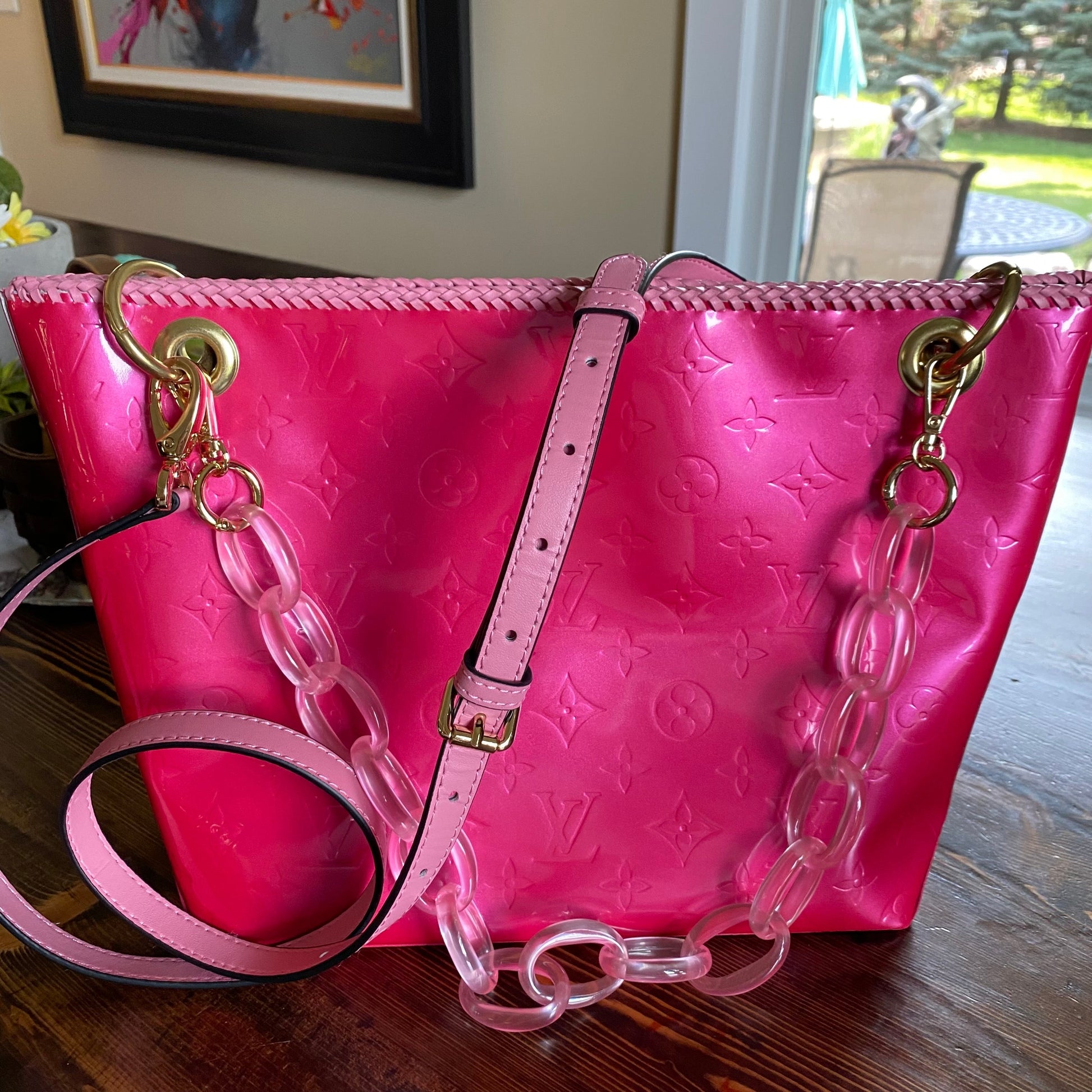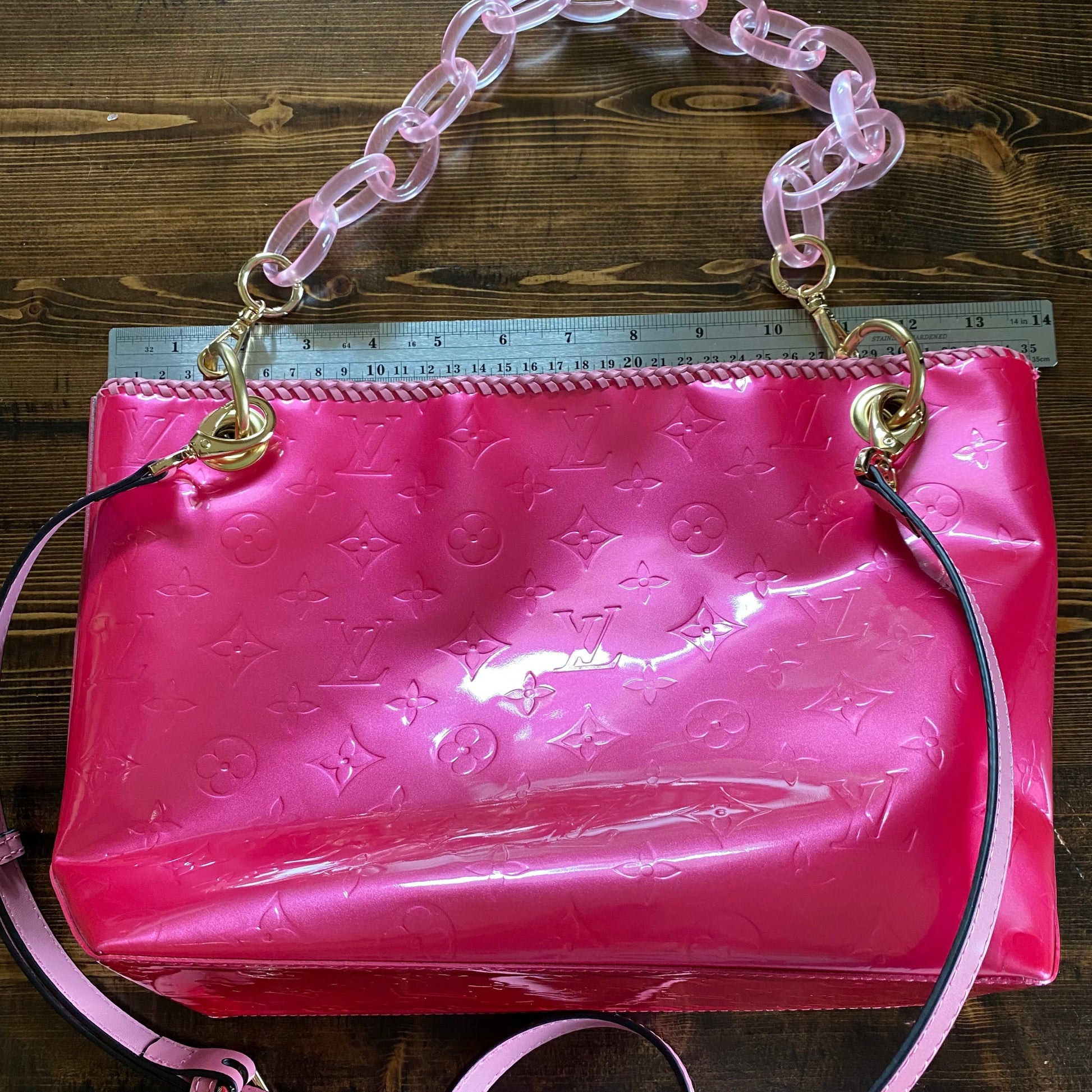 This beautiful bag was might have not been created from a Neverfull, but it sure looks like a small version of one!! This bag was created from an Louis Vuitton Pink tote that was in beautiful condition, but just not that functional. I cut off about 5 inches from the top, added top braiding and some rings to make it a cross body or shoulder bag. NOW it is ready to be used by a new owner!
