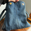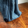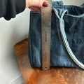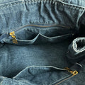 The interior is in really great shape. It has two zippered pockets, plus three "slide in" pockets. I did dye the exterior corners where the denim had worn, but left the handles in their slightly worn condition because I liked their look! The leather patch at the bottom corner has also been redyed and conditioned. The bag has two snap cinches on either side to bring the bag in, but they can be unsnapped for even more room.