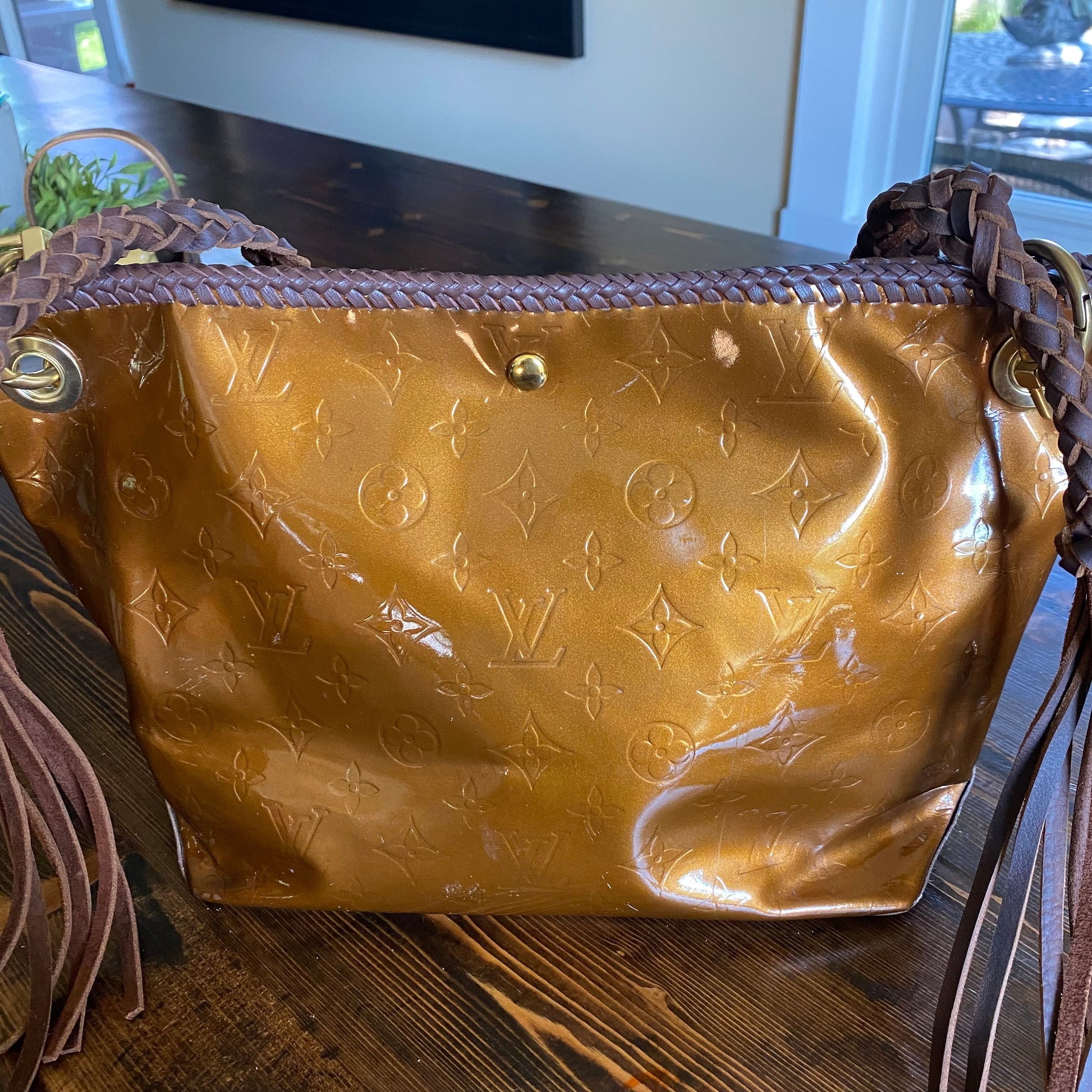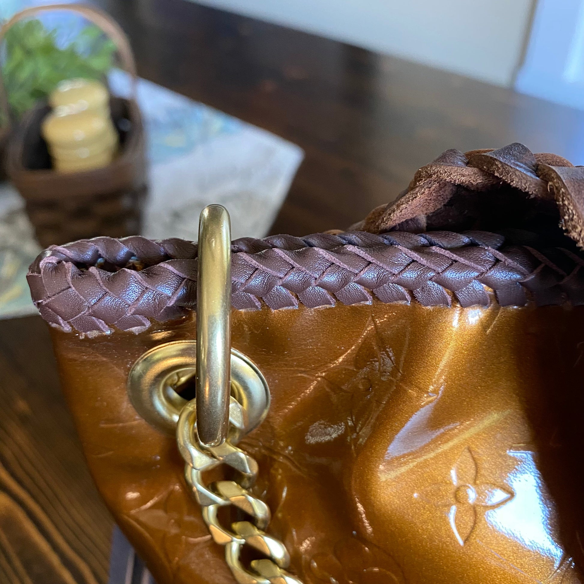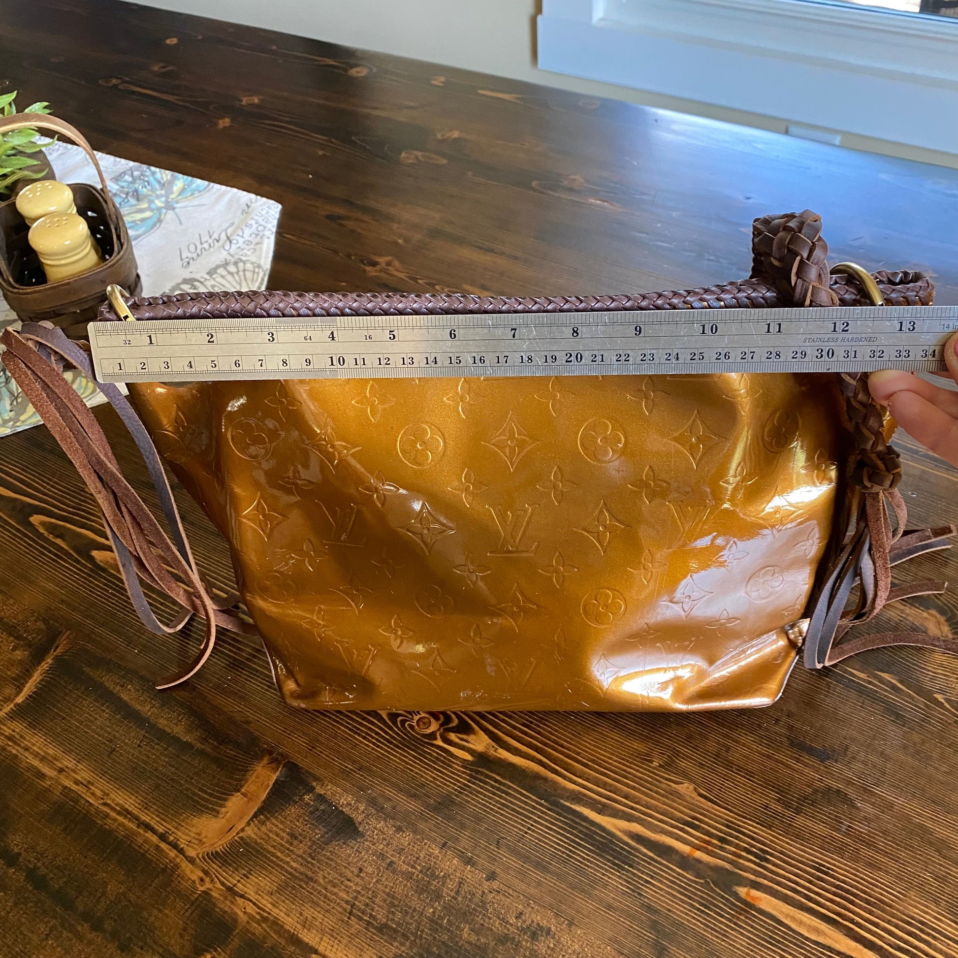 This beautiful bag might not have been created from a Neverfull, but it sure looks like a small version of one!! This bag was created from an Louis Vuitton Bronze Vernis tote that was in great condition, but just not that functional. I cut off about 5 inches from the top, added top braiding and some rings to make it a shoulder bag. NOW it is ready to be used by a new owner!
